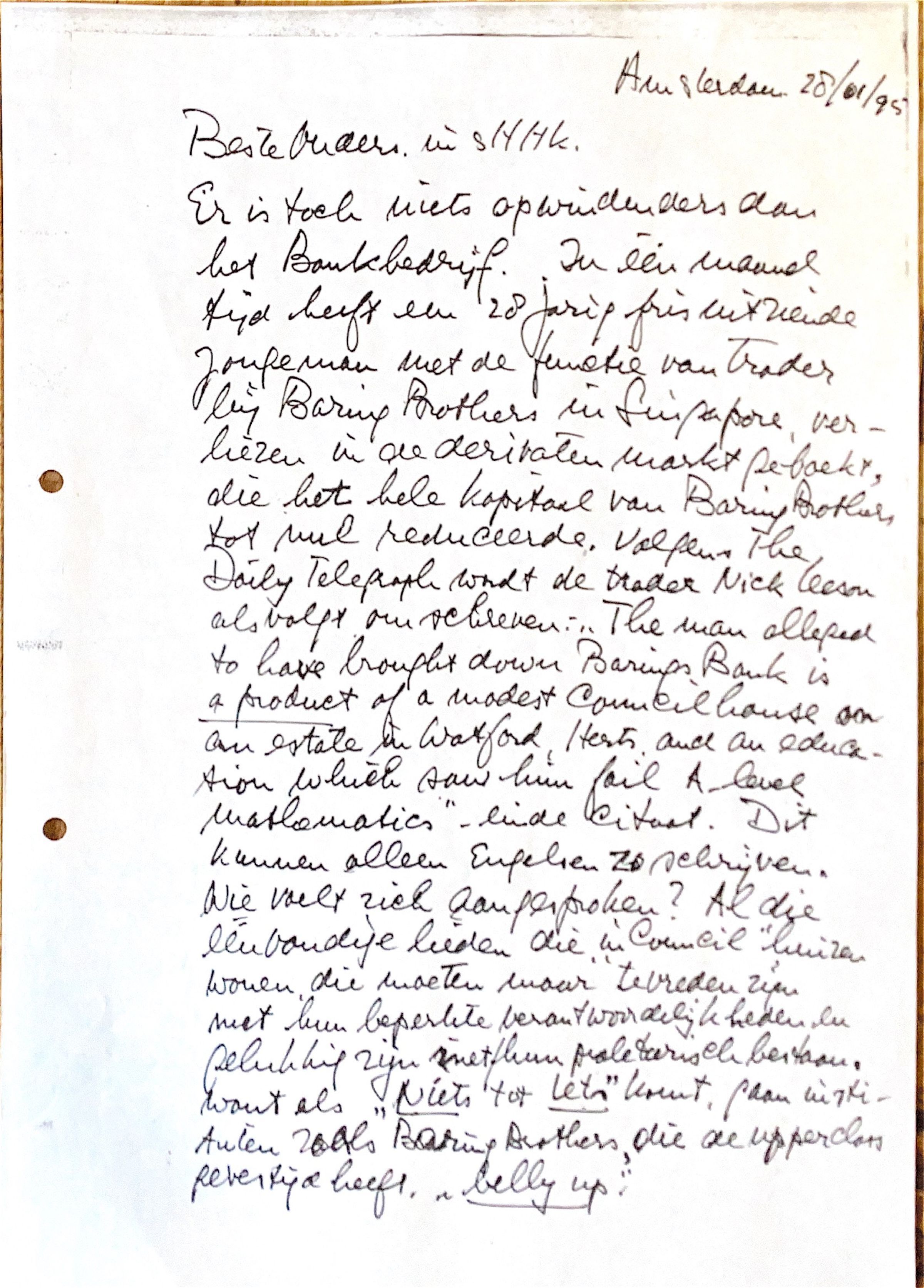 dan het bankbedrijf. In één maandtijd heeft een 28 jarige fris uitziende jongeman met de functie van 'trader' bij Baring Brothers in Singapore verliezen in de derivaten-markt geboekt, die het hele kapitaal van Baring Brothers tot nul reduceerde..Volgens "the Daily Telegraph" wordt de "trader" Nick Leeson als volgt omschreven: