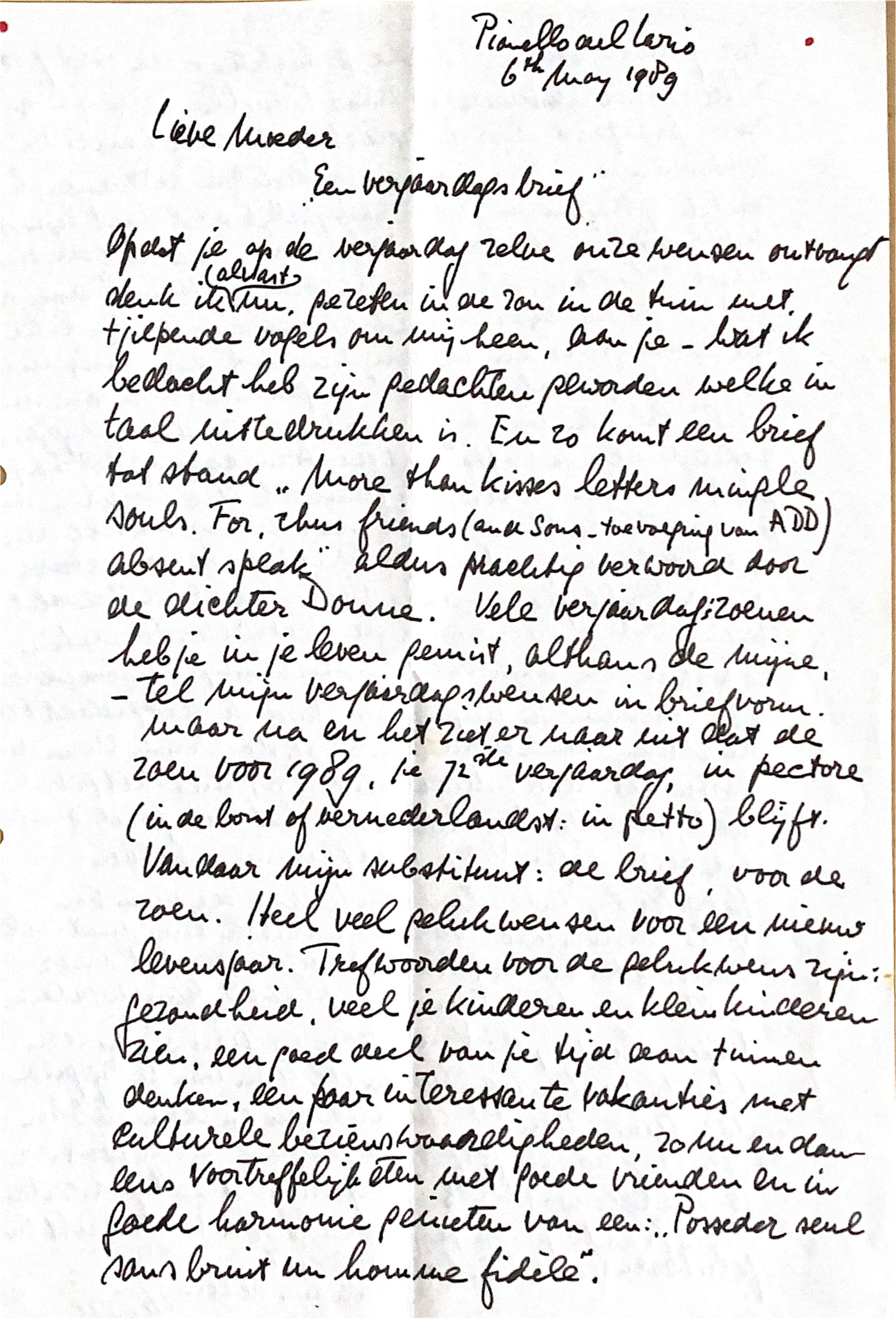 Vele verjaardagszoenen heb je in je leven gemist, althans de mijne. Tel mijn verjaardagswensen in briefvorm maar na en het ziet er naar uit dat de zoen voor1989, je 72ste verjaardag, "in pectore" ('in de borst blijft', of vernederlandst: 'in petto') blijft. Vandaar mijn substituut: de brief voor de zoen. Heel veel gelukwensen voor een nieuw levensjaar. Trefwoorden voor de gelukswensen zijn: Gezondheid; veel je kinderen en kleinkinderen zien; een goed deel van je tijd aan tuinen denken; een paar interessante vakanties met culturele bezienswaardigheden; zo nu en dan eens voortreffelijk eten met goede vrienden en vriendinnen en in harminie genieten van een "Posseder seul sans bruit un homme fidèle".