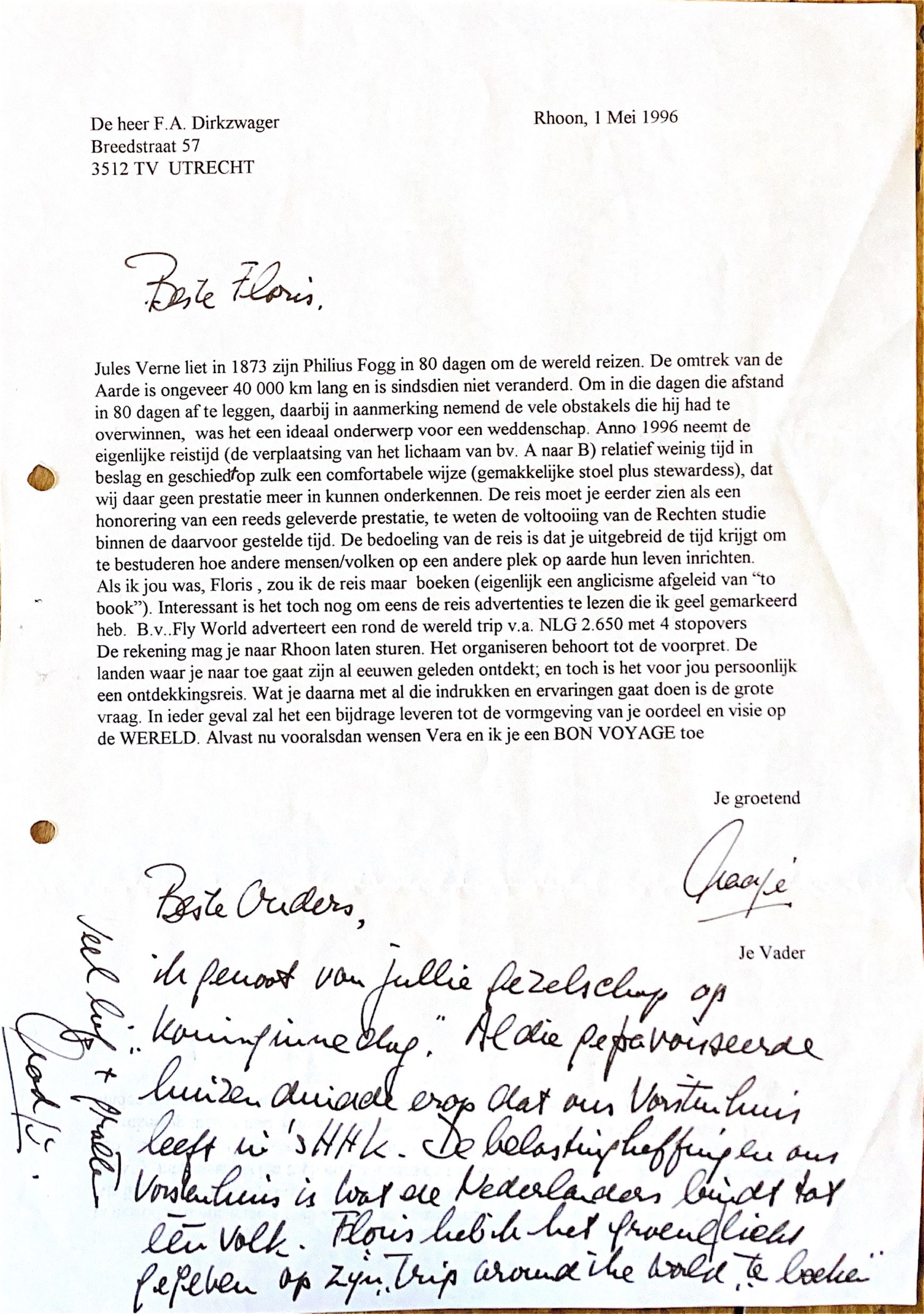 Als ik jou was, Floris zou ik de reis maar boeken (een anglicisme afgeleid van de "verb: to Book"). Interessant is toch nog om eens de reisadvertenties te lezen, die ik geel gemarkeerd heb. Bij voorbeeld: "Fly world" adverteert voor een rond de wereldtrip vanaf Nlg 2.650,- met vier stopovers. De rekening mag je naar Rhoon sturen. Het organiseren behoort bij de voorpret.De landen waar je naar toe gaat zijn al eeuwen geleden ontdekt en toch is het voor jou een ontdekkingsreis. Wat je met al die indrukken en ervaringen gaat doen is de grote vraag? In ieder geval zal het een bijdrage leveren tot de vormgeving van je oordeel en visie op de WERELD. Alvast nu voor alsdan wensen Vera en ik je een "BON VOYAGE" toe. Je groetend, je vader Aadje