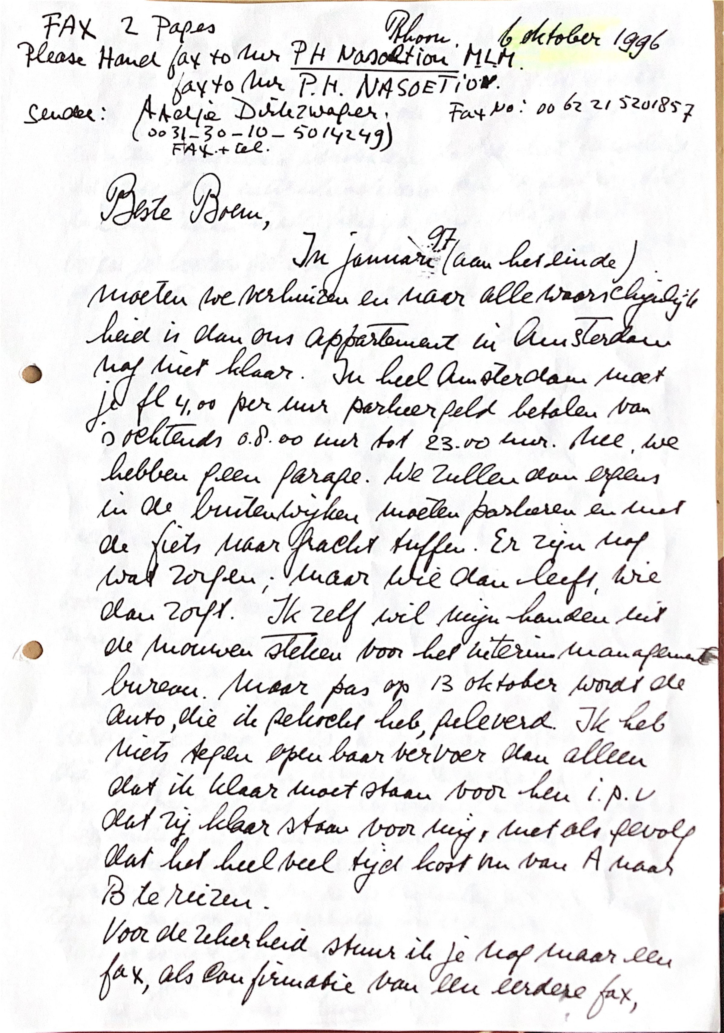fax naar Boem o.a. over verhuizing naar Adam en het initiatief van vader Ab om een verhaal over je moeder Adriana Nasoetin- v. der Have te schrijven.