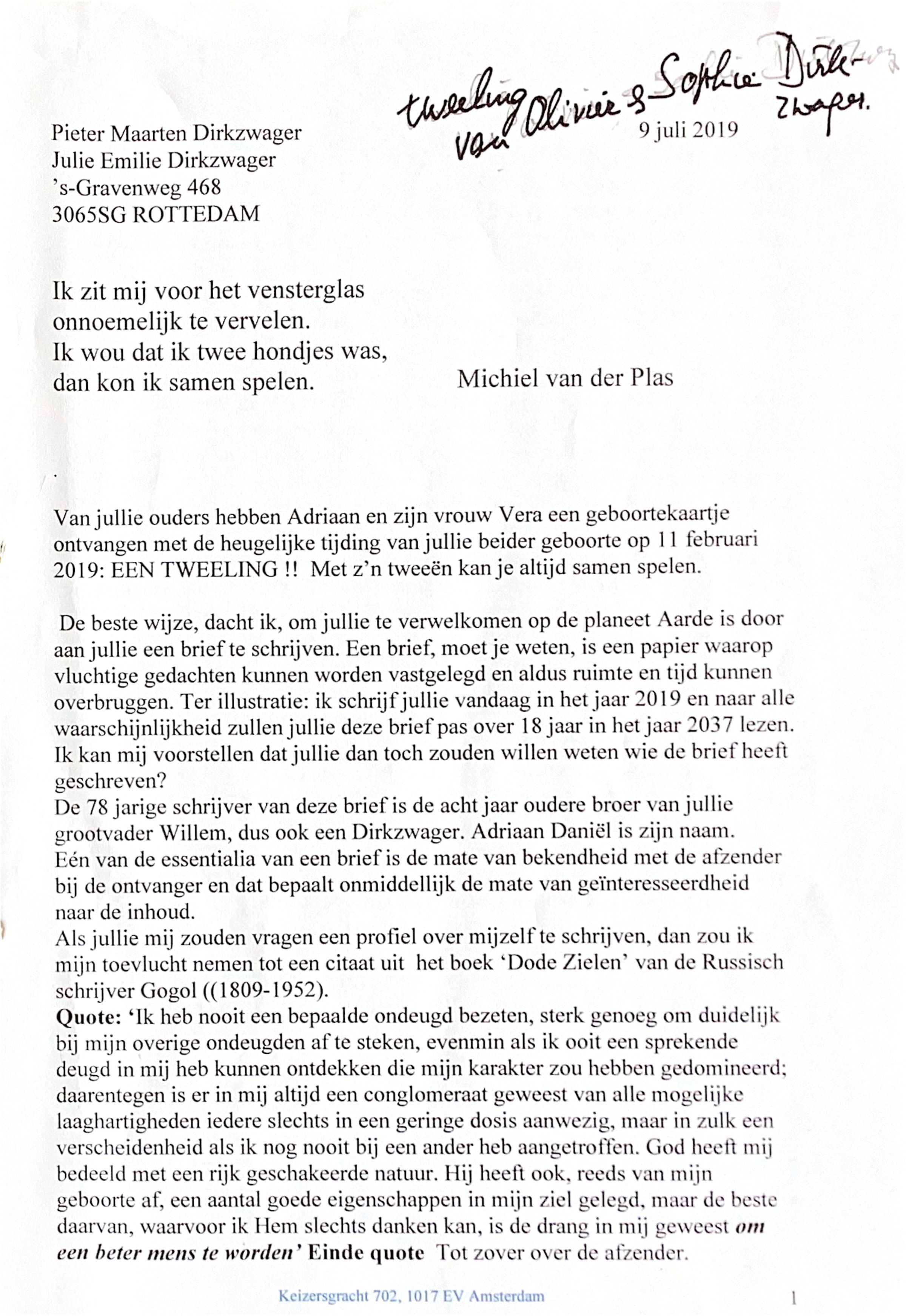 2019-07-09 Brief ter welkoming Pieter Maarten -en Julie Emilie Dirkzwager op de planeet Aarde. 2