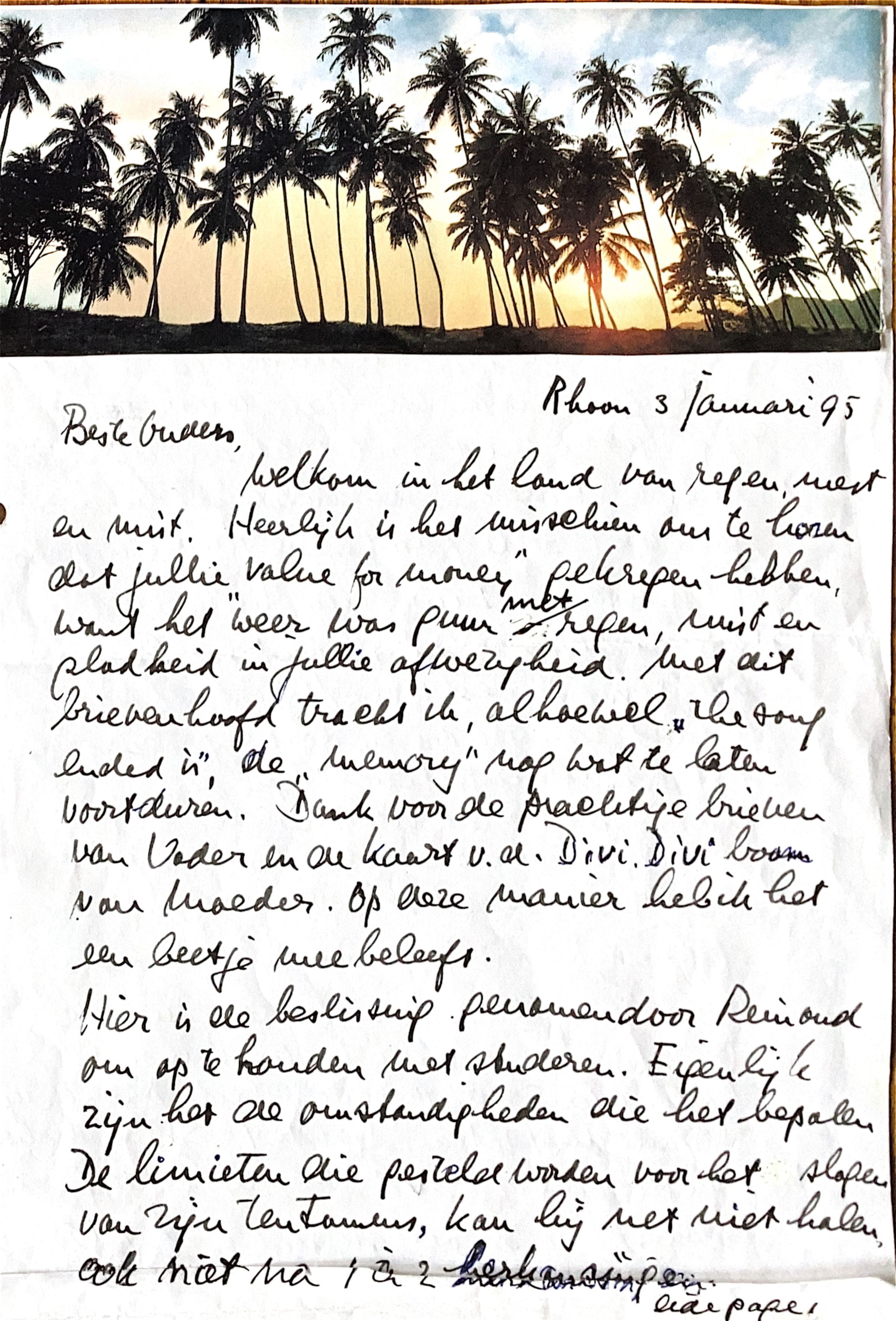 welkom in het land van regen, mest en mist. Heerlijk is het misschien om te horen dat jullie "value for money" gekregen hebben, want het weer was guur met regen, mist en gladheid in jullie afwezigheid. Met dit brievenhoofd tracht ik, alhoewel "the song is ended, but the memory" nog wat te laten voortduren. Dank voor de prachtige brieven van Vader en voor de kaart met de afbeelding van de Divi Divi-boom van moeder. Op deze manier heb ik het de reis een beetje meebeleeft.