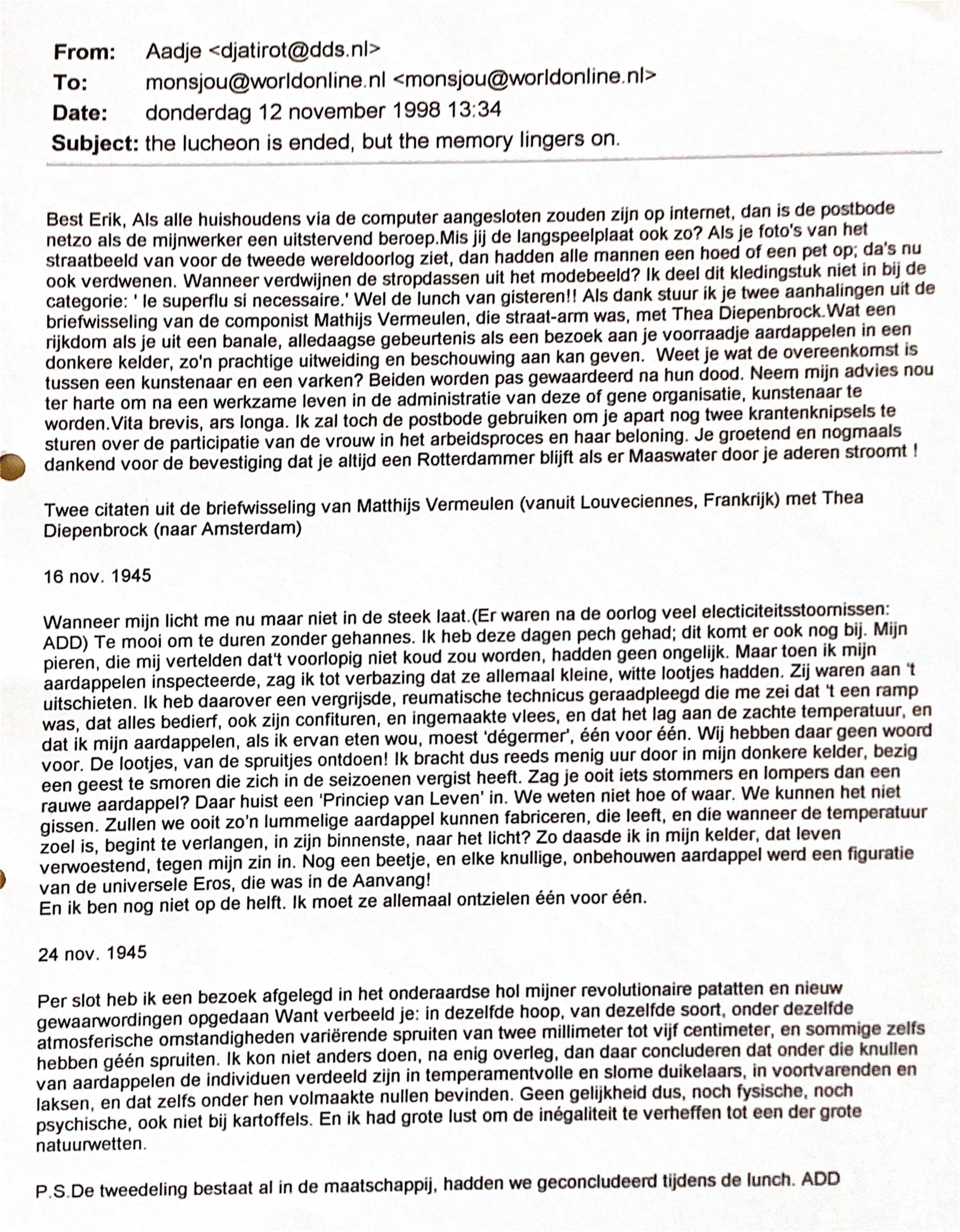 Als dank stuur ik je twee citaten uit de briefwisseling van de componist Mathijs Vermeulen, die straat-arm was, met Thea Diepenbrock. Wat een rijkdom als je uit een alledaagse gebeurtenis als een bezoek aan je voorraadje aardappelen in een donkeren kelder, zo'n prachtige uitweiding en beschouwing kan geven.