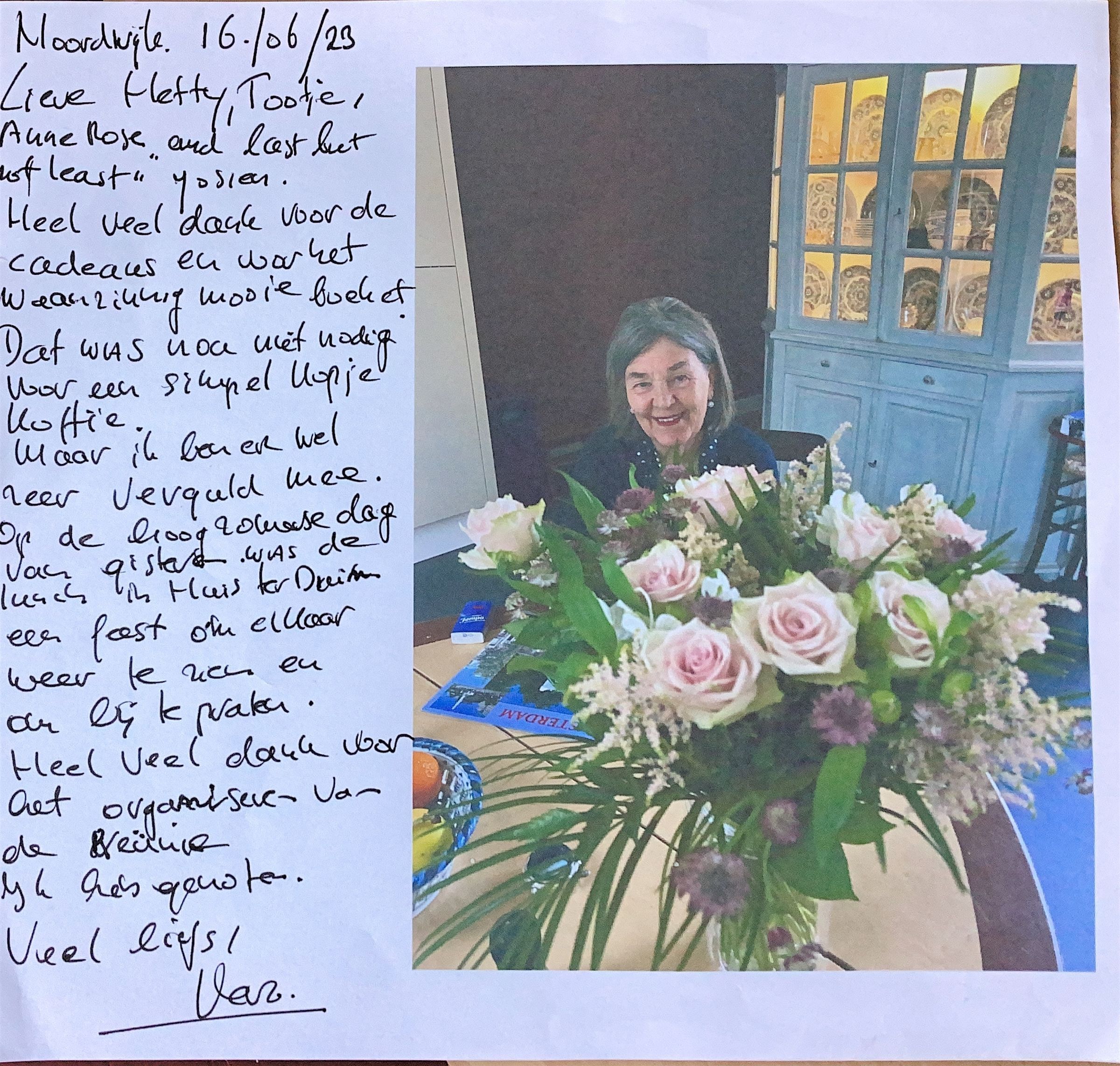 Foto van Vera gezeten achter een boeket “Esperanza” rozen gekregen van haar “Grenoble” vriendinnen.