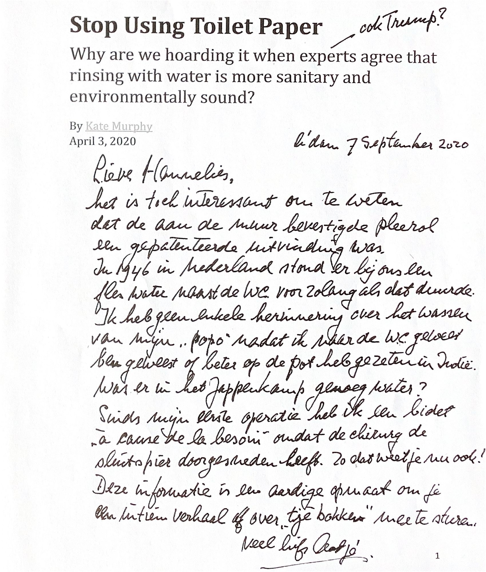 In 1946 in Nederland stond. er bij ons thuis een fles water naast de wc voor zolng dat duurde. Ik heb geen enkele herinnering over hetwassen van mijn "popo", nadat ik naar de WC ben geweest of beter: op de pot heb gezeten in Indië. Was er in het jappenkamp genoeg water? Sinds mijn eerste operatie heb ik een bidet "à cause de la besoin", omdat de chirurg de sluitspier heeft doorgesneden. Zo dat weet je nu ook.