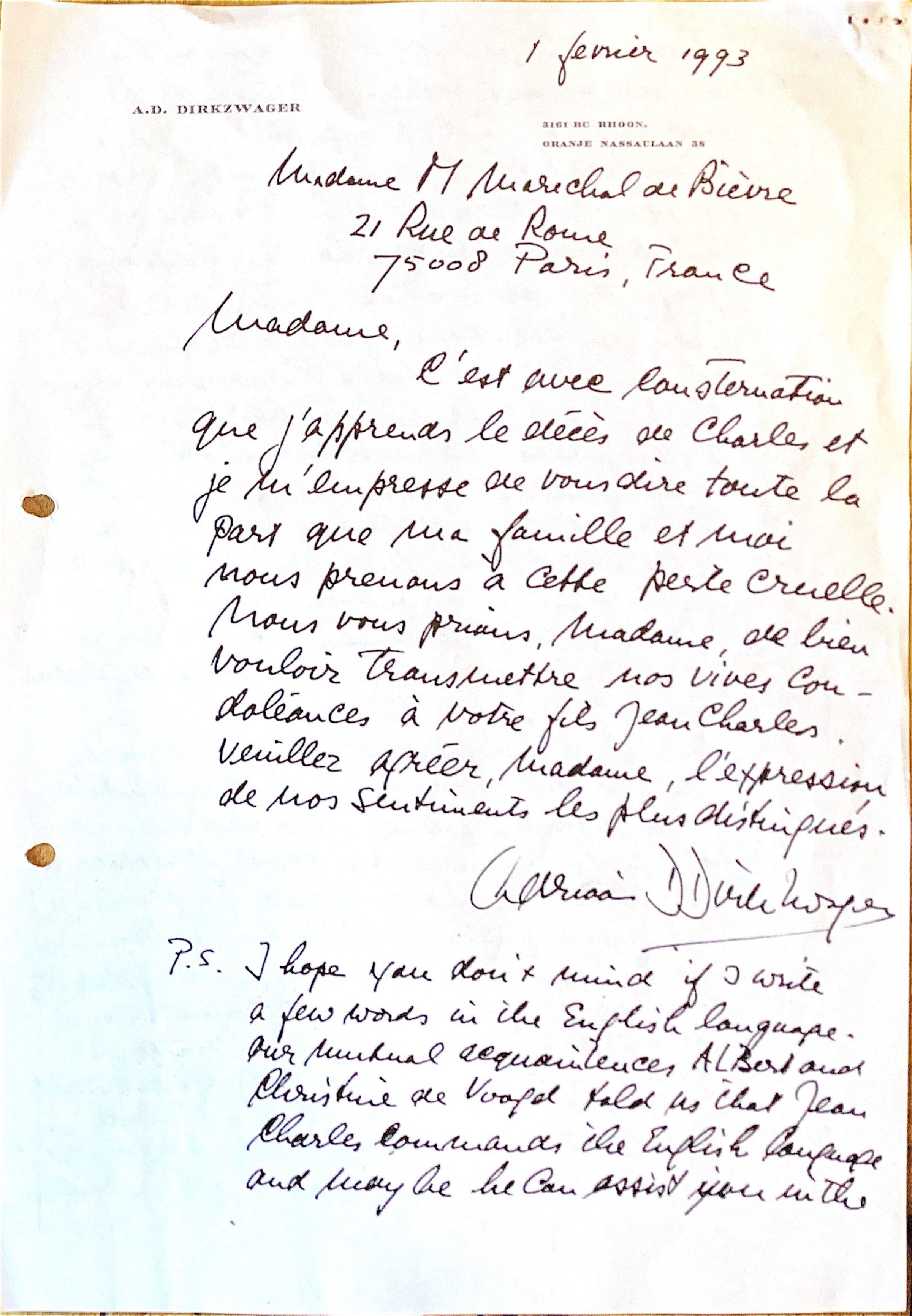 C'est avec consternation que j'apprends la décès de Charles et je me empresse de vous dire toute la part que ma famille et moi nous prenons à cette cruelle. Nous vous prions, Madame, de bien vouloir transmettre nos vives condéleances à votre fils Jean Charles.