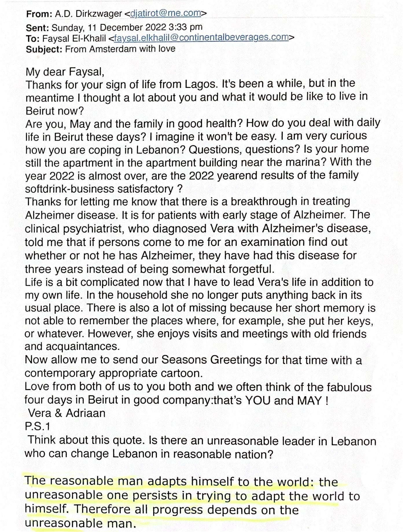 2022-12-11 Mail aan Faysal El-Khalil over Lebanon en Veras malheur.