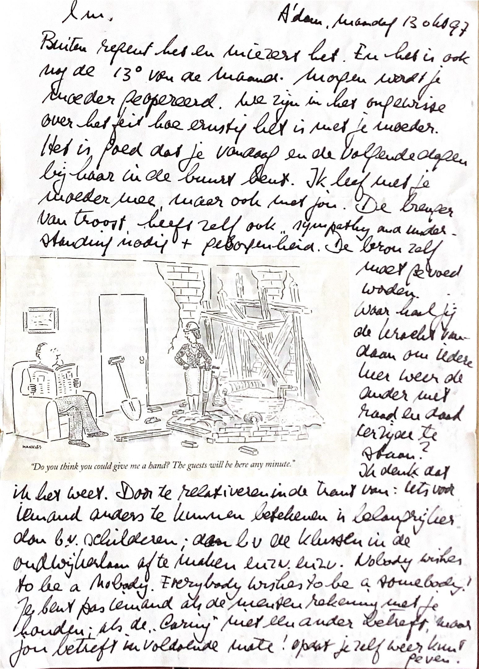 buiten regen het en het miezert en het is ook nog de 13de van de maand. Morgen wordt je moeder geopereerd. We zijn in het ongewisse over het feit hoe ernstig het is met je moeder ? Het is goed dat je vandaag en de volgende dagen bij haar in de buurt bent. Ik leef met je moeder mee, maar ook met jou.