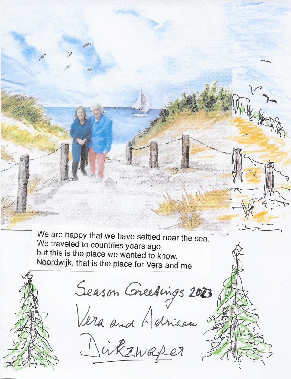 In de winkel lag een pakje papieren servetten met een aquarel van een duinovergang erop afgebeeld. Een Schotse vriend, die langs kwam in augustus, wilde een foto van ons getweeën maken. Ik heb onze afbeelding op die foto verkleind om die passend te maken in de aquarel afbeelding, 'et voilà!" Het begin voor een "season greetings”kaart. Liefs en groeten, Vera & Aadje