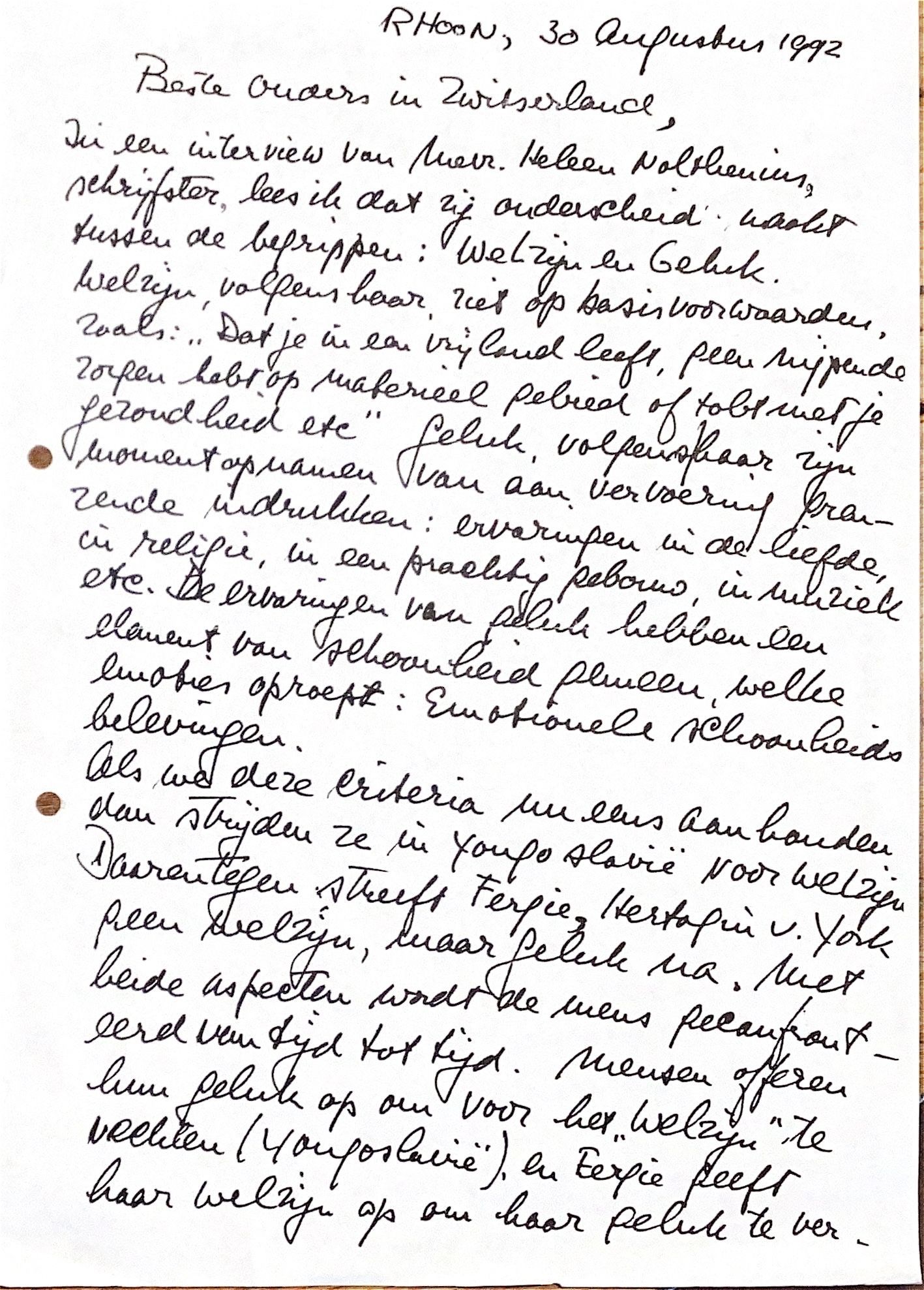 in een interview van mevouw Hélène Nolthenius, schrijfster en professor Musicologie, lees ik dat zij een onderscheid maakt tussen de begrippen: Welzijn en Geluk. "Welzijn," volgens haar, ziet op basisvoorwaarden zoals: "Dat je in een vrij land leeft, geen nijpende zorgen hebt op materieel gebied of tobt met je gezondheid etc." "Geluk", volgens haar, zijn moment opnamen van aan vervoering grenzende: indrukken: "ervaringen in de liefde, in religie, in een prachtig gebouw, in muziek etc." De ervaringen van geluk, hebben een element van schoonheid gemeen, welke emoties oproept: Emotionele schoonheidsbeleving.