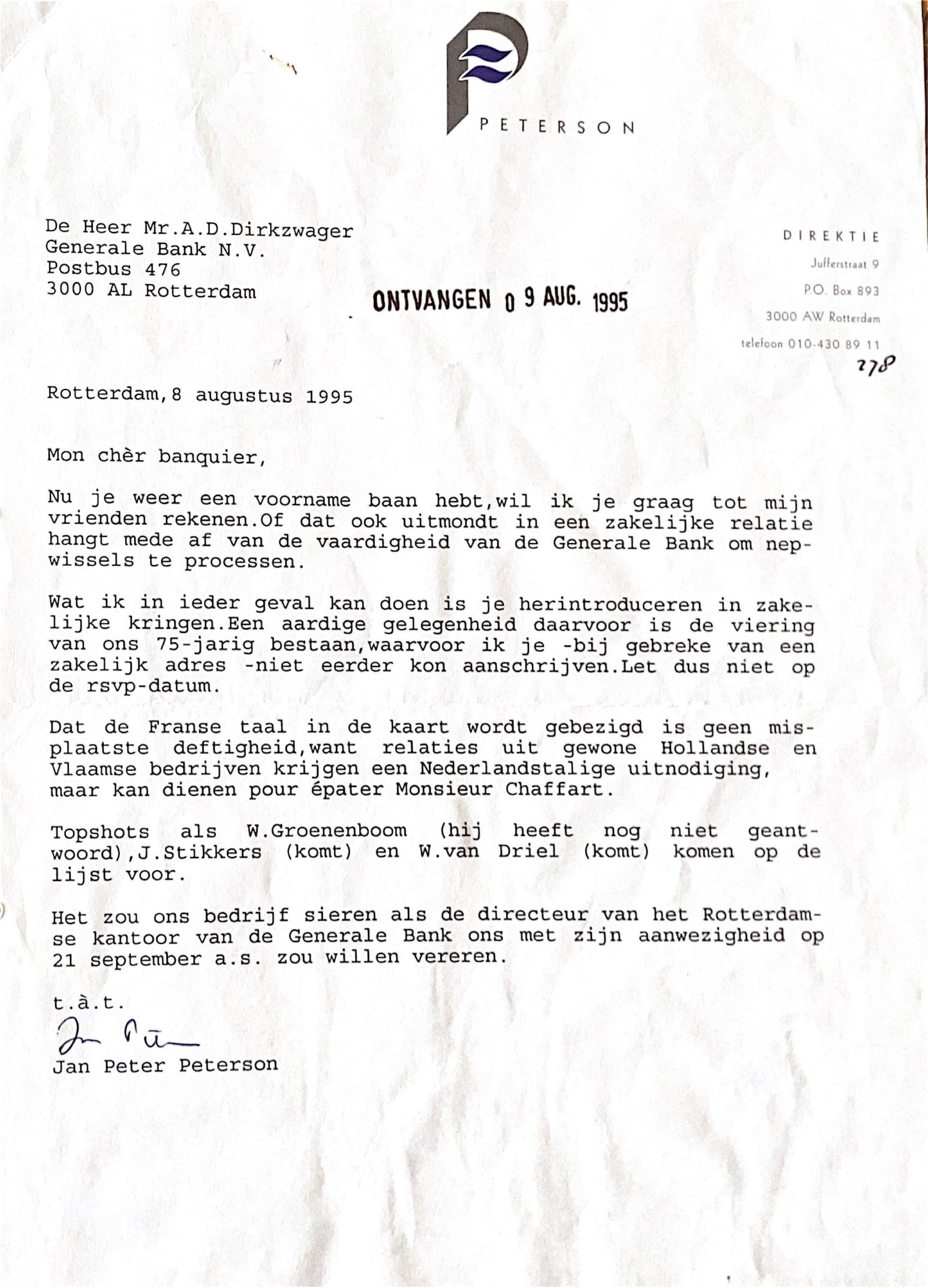 Het zou ons bedrijf sierenm als de directeur van het Rotterdamse kantoor van de Generale Bank ons met zijn aanwezigheid op 21 september a.s. zou willen vereren.