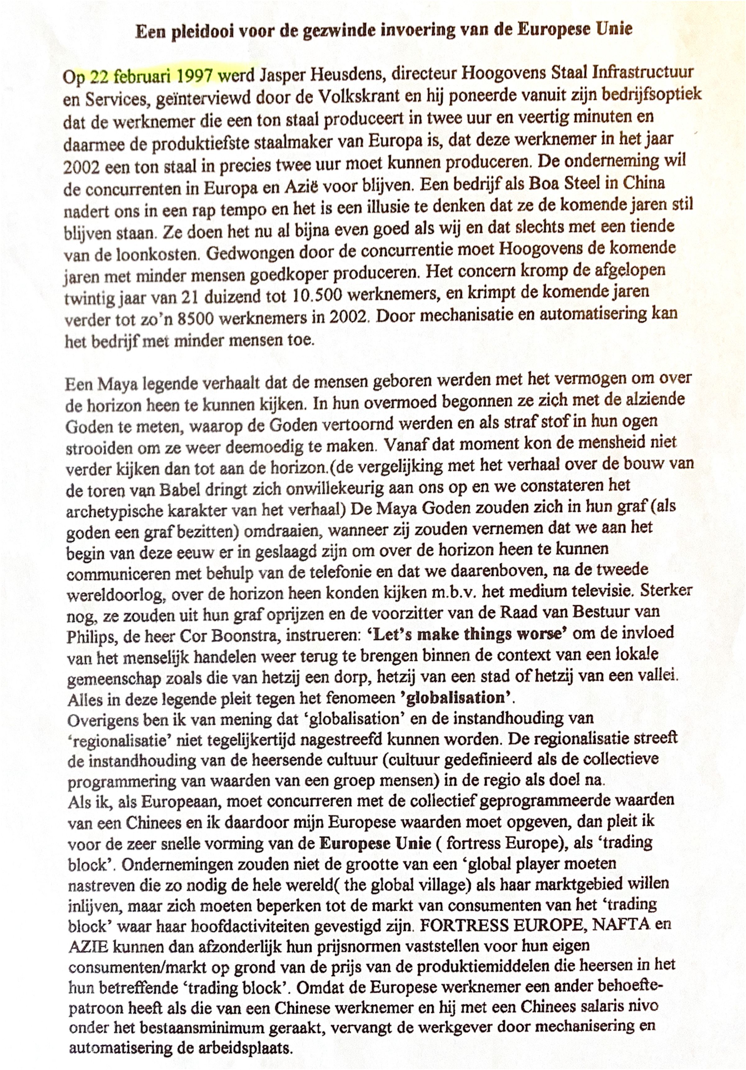 1997-03-12 Aan Jasper Heusdens over invoering v.d.Europese Unie.