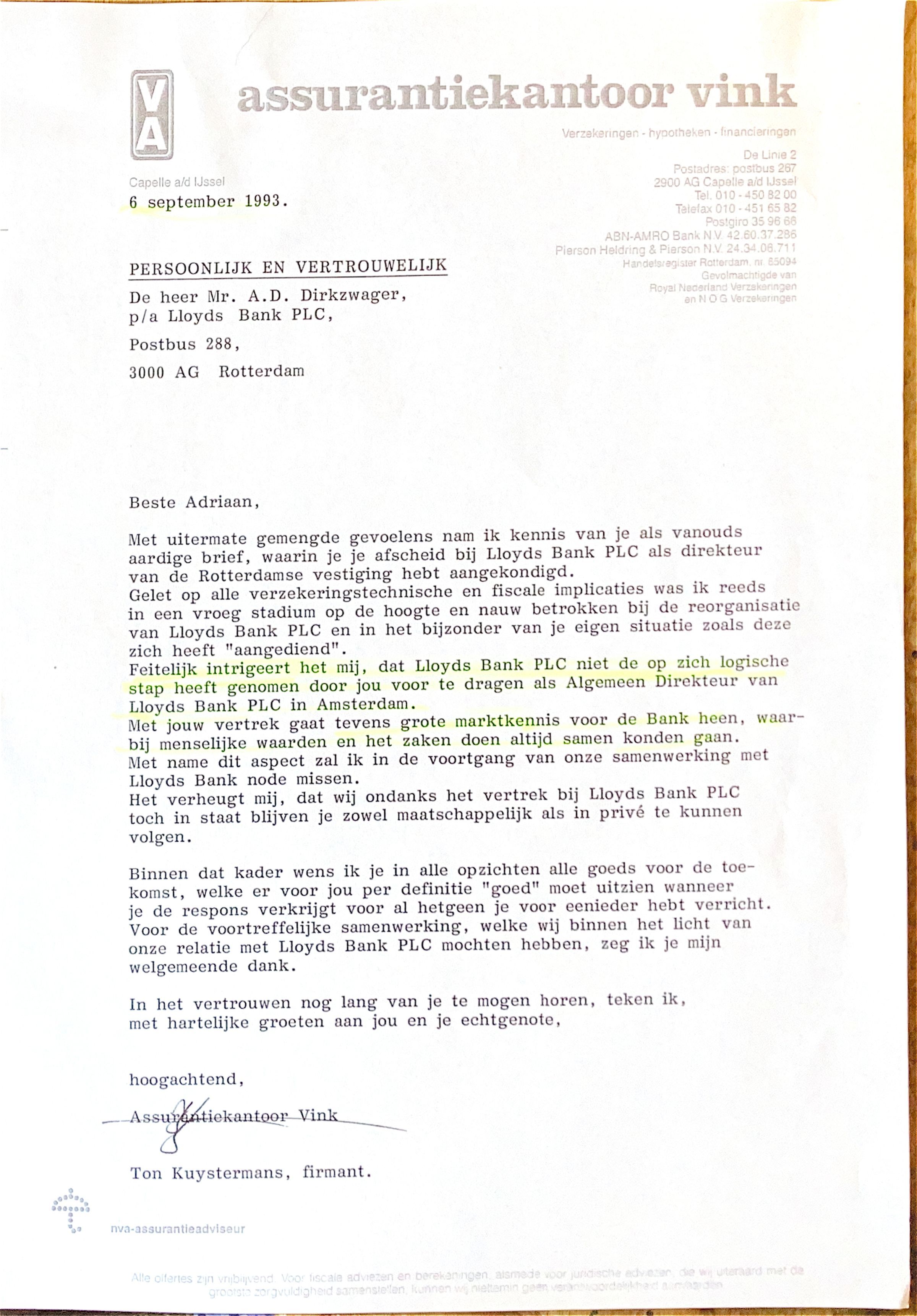 1993-09-06 Brief van Assurantiekantoor Vink m.b.t. aangezegde ontslag vam ADD.
