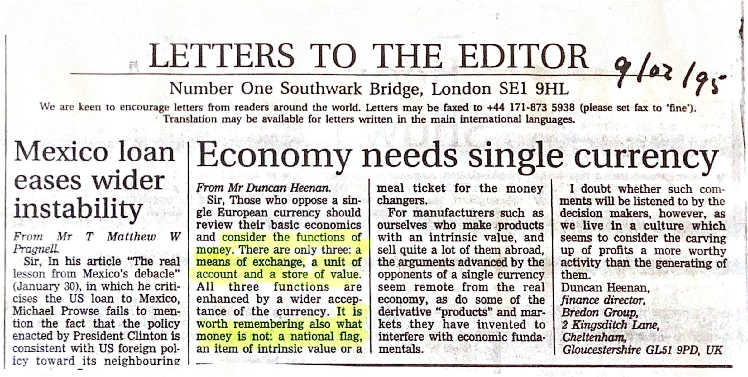 1995-09-02 LETTERS TO THE EDITOR Economy needs a single currency.