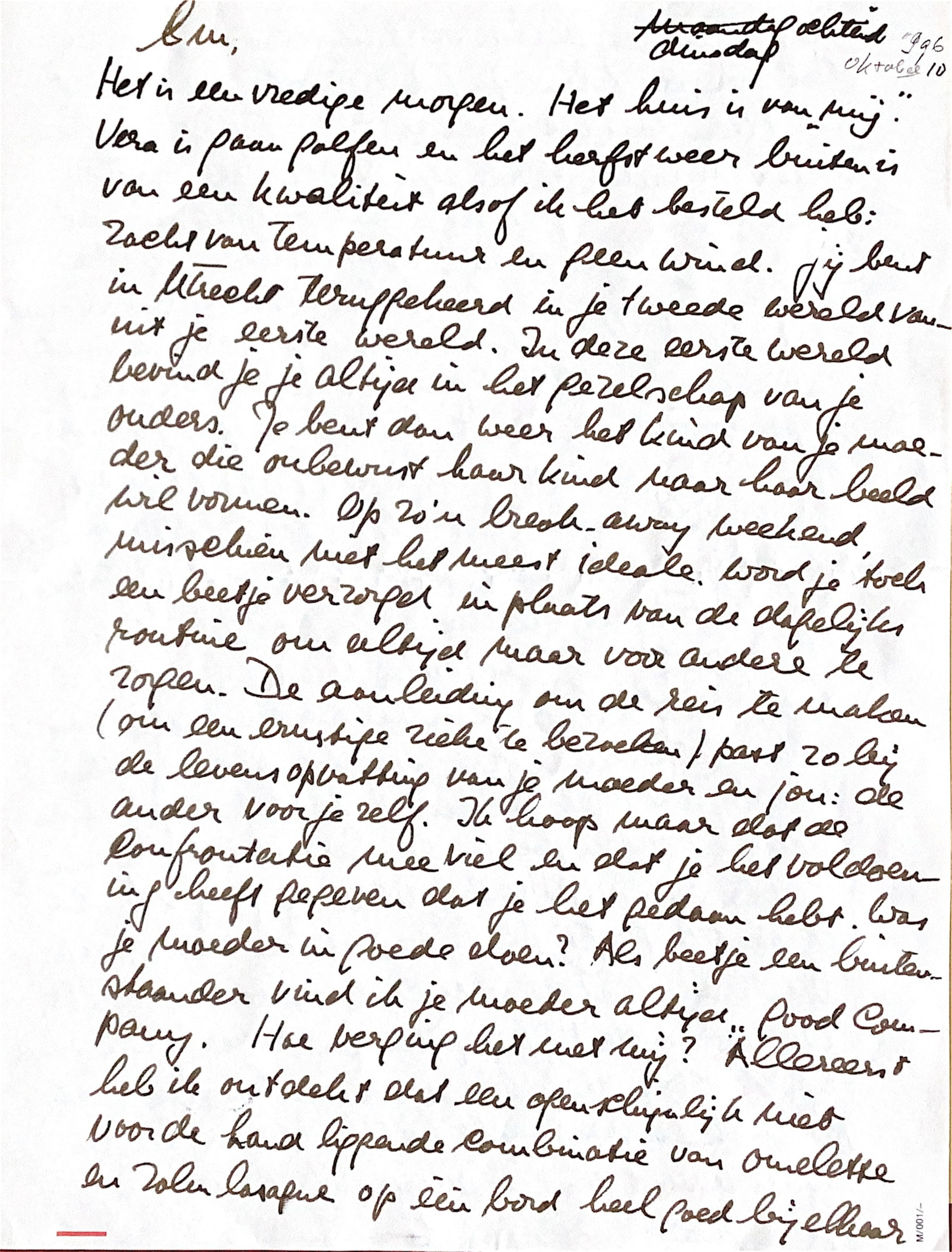 Het is een vredige morgen. Het huis is van mij. Vera is gaan golfen en het herfstweer buiten is van een kwaliteit alsof ik die besteld zou hebben: zacht van temperatuur en geen wind. Jij bent in Utrecht teruggekeerd in je tweede wereld vanuit je eerste wereld. In deze eerste wereld bevind je je altijd in het gezelschap van je ouders. Je bent dan weer het kind van je moeder, die onbewust haar kind naar haar beeld wil vormen. Op zo'n "break away" weekend, misschien niet het meest ideale, word je toch een beetje verzorgd in plaats van de dagelijkse routine om altijd maar voor anderen te zorgen.