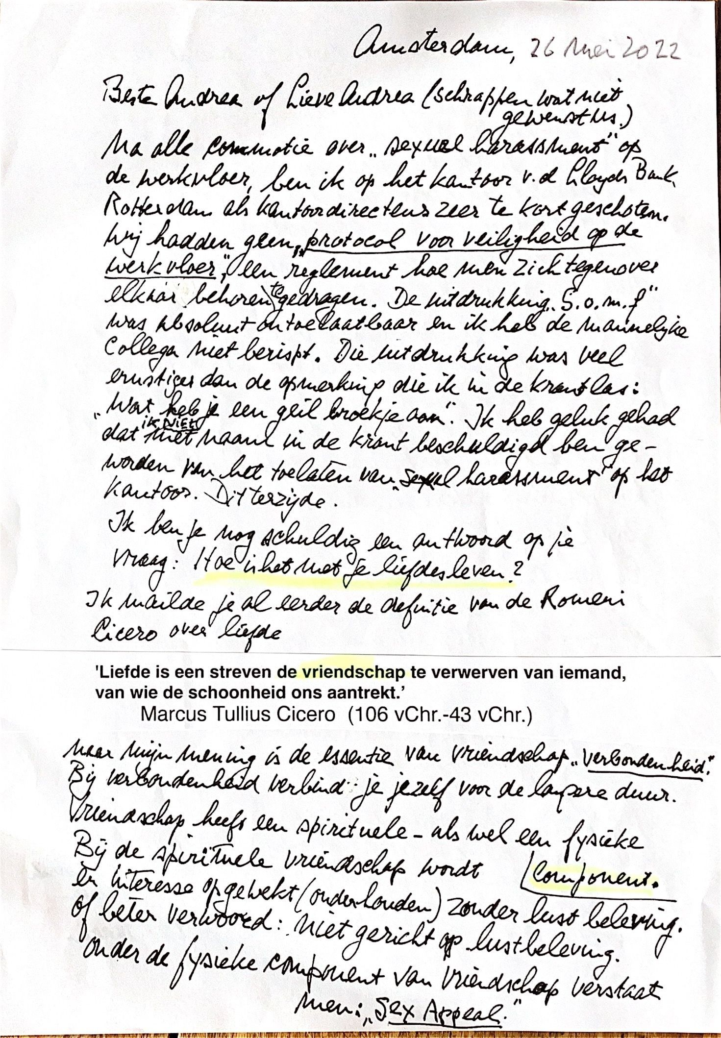 Ik kan iemand een vriend noemen, omdat we een gemeenschappelijke belevenis gehad hebben of een gelijkwaardige belangstelling hebben. In brieven worden zij veelal aangeschreven met "Beste." Jij, Andrea, omdat wij jaren samengewerkt hebben bij dezelfde werkgever, hebt je het recht verworven om met het adjectief "Lieve" aangeschreven te worden, ondanks de veelvuldige verzekering van jouw zijde: "Adriaan, jij vindt mij niet interessant", beschouw ik je toch als mijn spirituele vriendin ! Jij bent de enige die, bij ons afscheid van de Lloyds Bank, zei: "Adriaan, als je een nieuwe baan hebt, zeg ik mijn baan op om bij je te komen werken." Dat was het beste 'performance report' dat ik bij de Lloyds Bank gekregen heb.