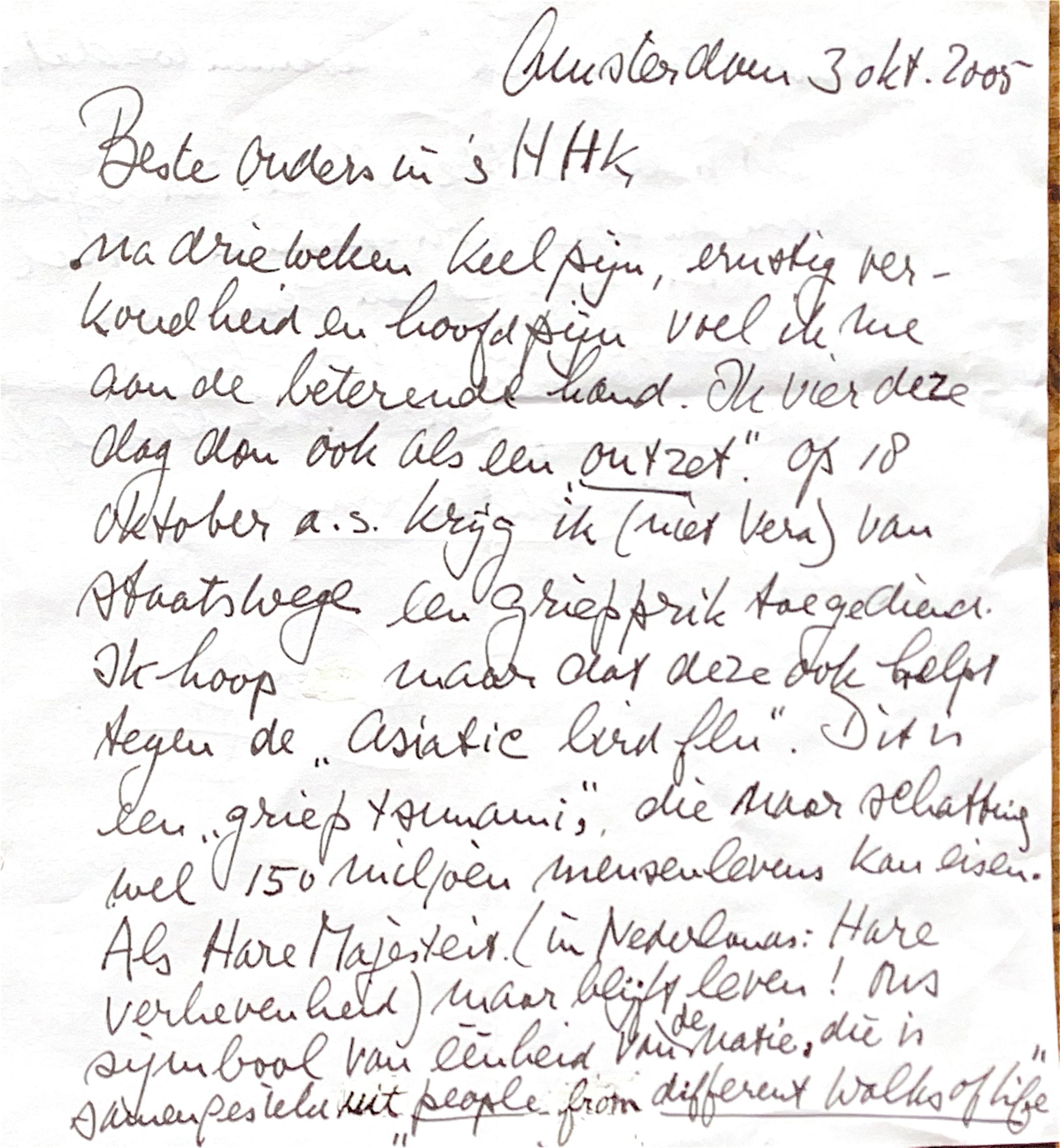 Ik hoop maar dat deze ook helpt tegen de "Asiatic bird flu." Dit is een " griep-tsunami", die naar schatting wel 150 miljoen mensenlevens kan eisen. Als Hare Majesteit (in het Nederlands: Hare Verhevenheid) maar blijft leven ! Ons symbool van éénheid van de natie, die is samengesteld uit " people from different walks of life." Multicutureel noemen we dat.