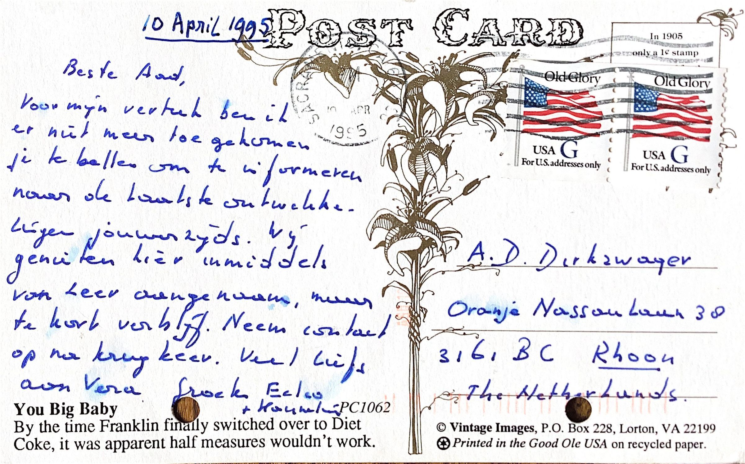 1995-04-10 Post Card van Eelco Kruijff uit Amerika.