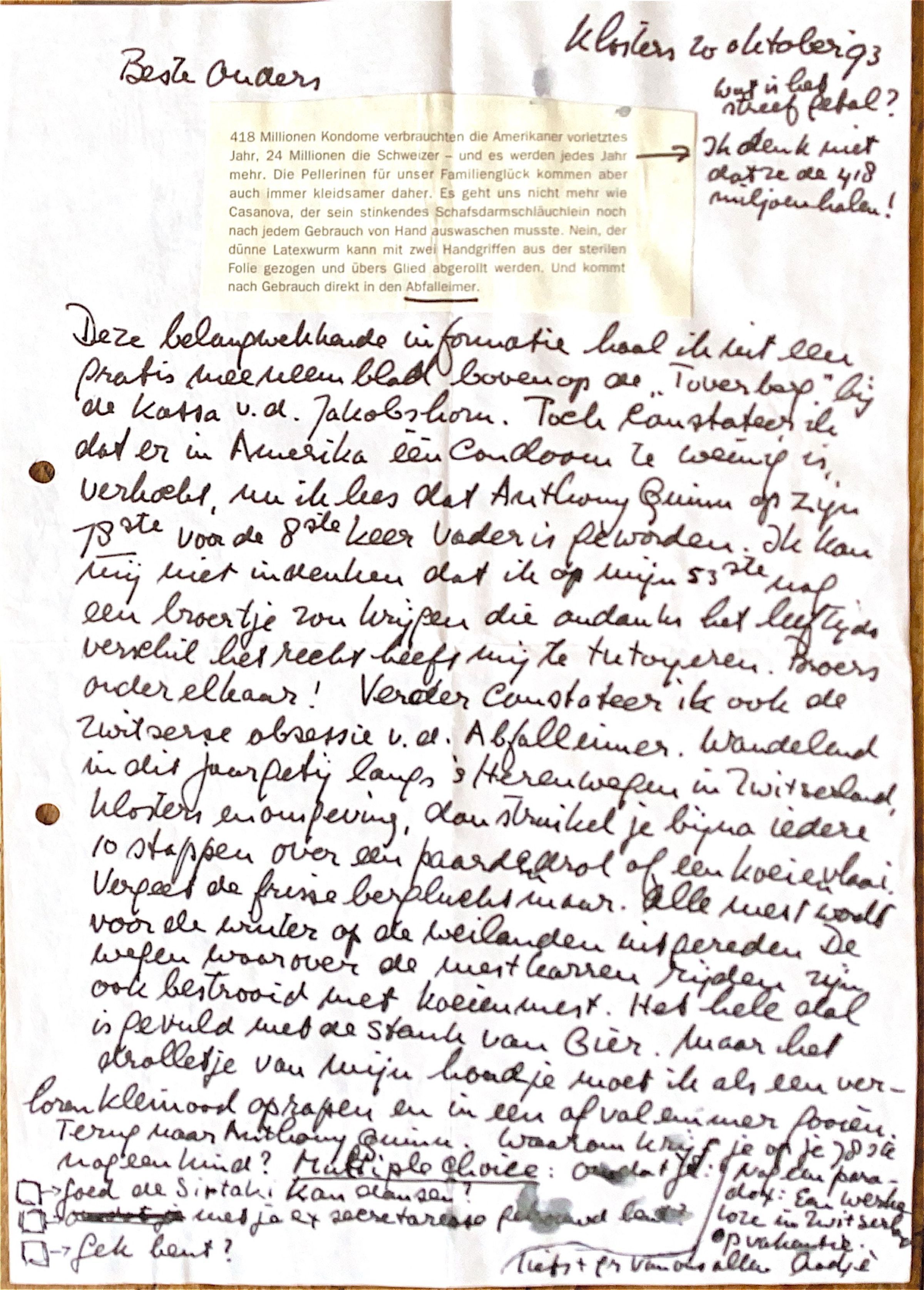 deze belangwekkende informatie haal ik uit een gratis meeneem-blad boven op de "Toverberg" bij de kassa van de Jacobshorn/Davos. Toch constateer ik dat er in Amerika één condoom te weinig is verkocht, nu ik lees dat de filmster Anthony Quinn op zijn 78ste voor de 8ste keer vader is geworden. Ik kan mij niet indenken, dat ik op mijn 53ste jaar nog een broertje zou krijgen, die ondanks het leeftijdsverschil, recht heeft mij te tutoyeren. Broers onder elkaar !