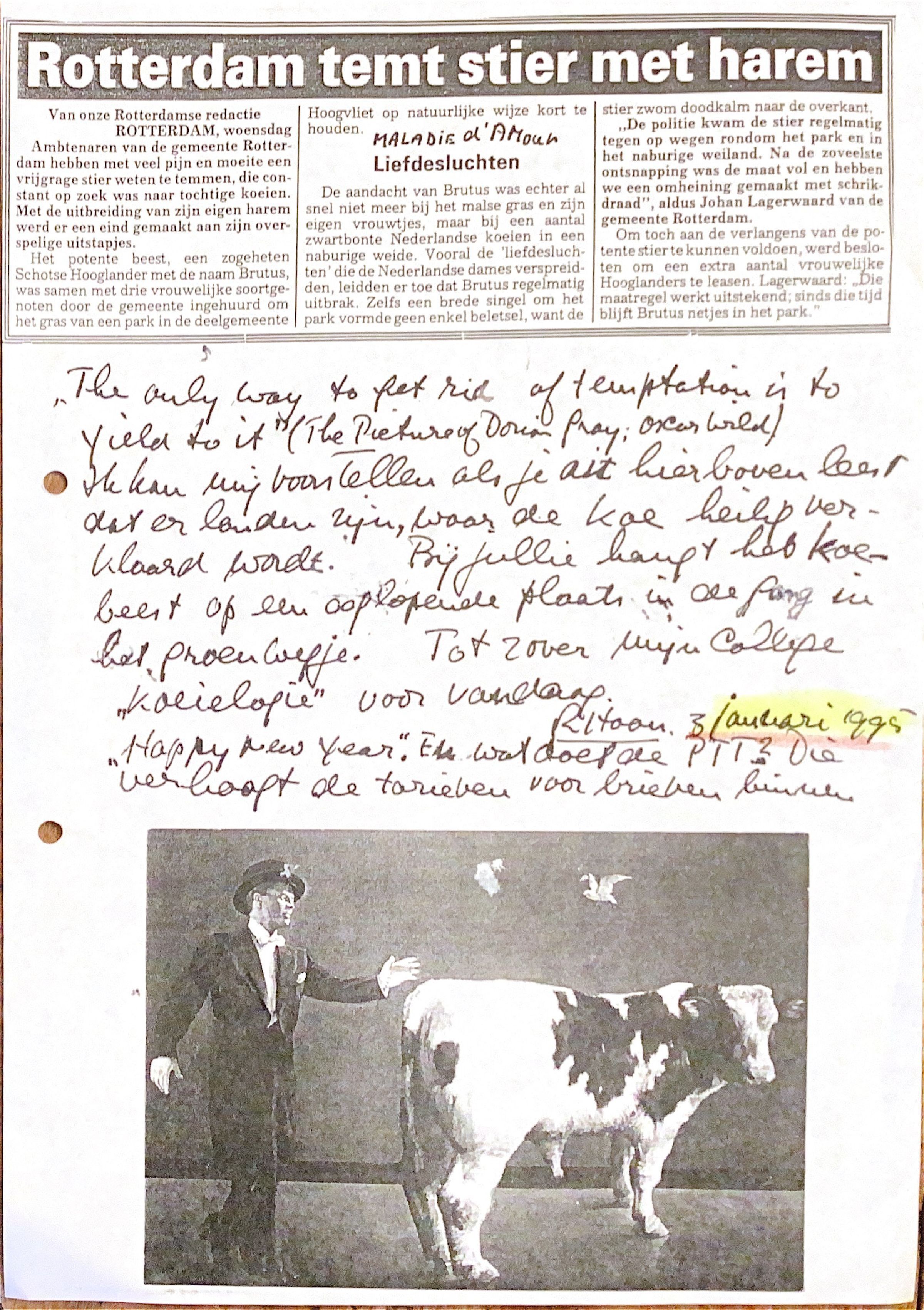 Ambtenarenvan de gemeente Rotterdam hebben met pijn en moeite een vrijgrage stier weten te temmen, die constant op zoek was naar tochtige koeien. Met uitbreiding van zijn eigen harem werd een eind gemaakt aan zijn overspelige uitstapjes