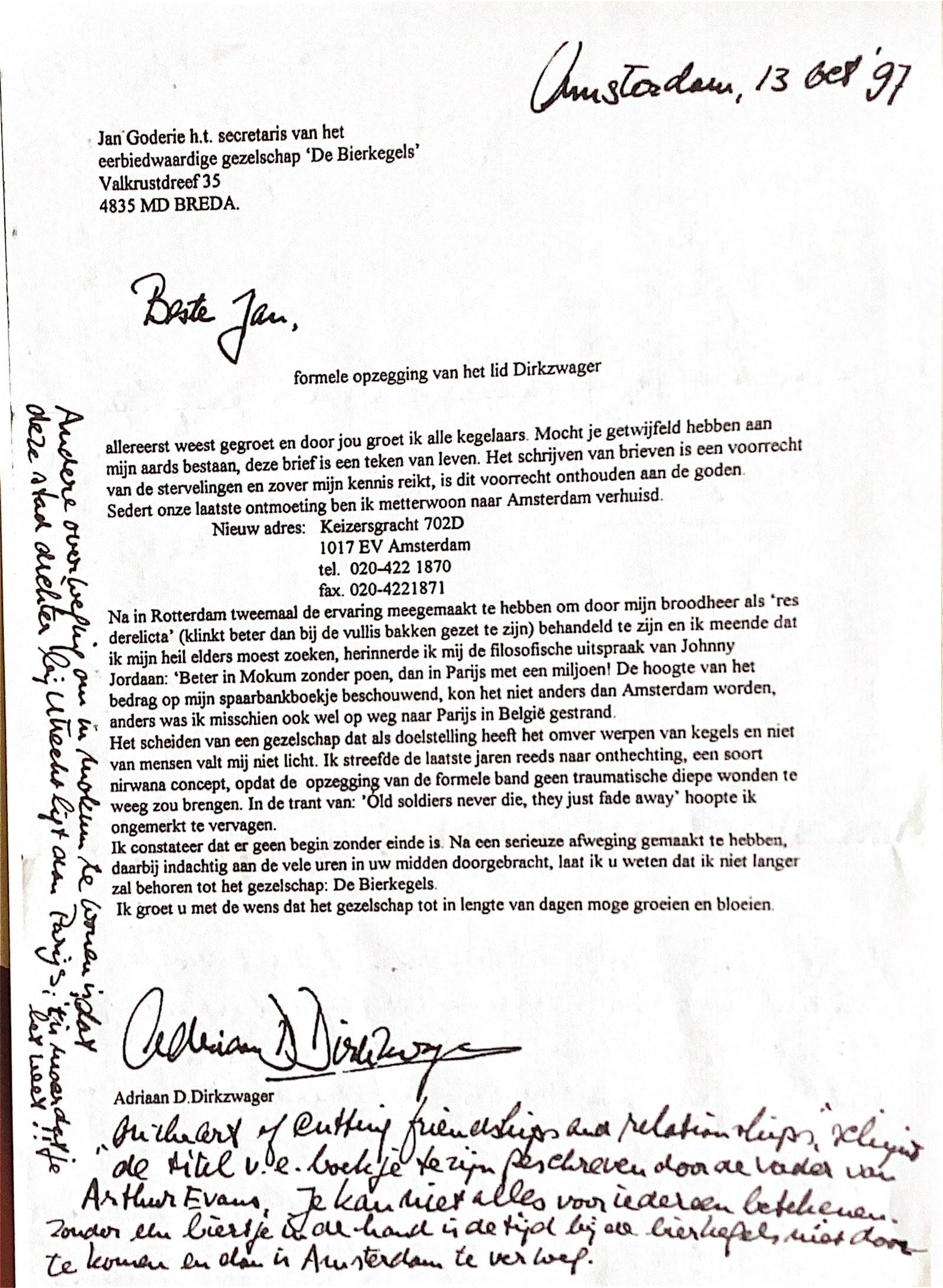 Ik constateer dat er geen begin zonder einde is. Na een serieuze afweging gemaakt te hebben, daarbij indachtig aan de vele uren in uw midden doorgebracht te hebben, laat ik u weten dat ik niet langer zal behoren tot het gezelschap "De Bierkegels."