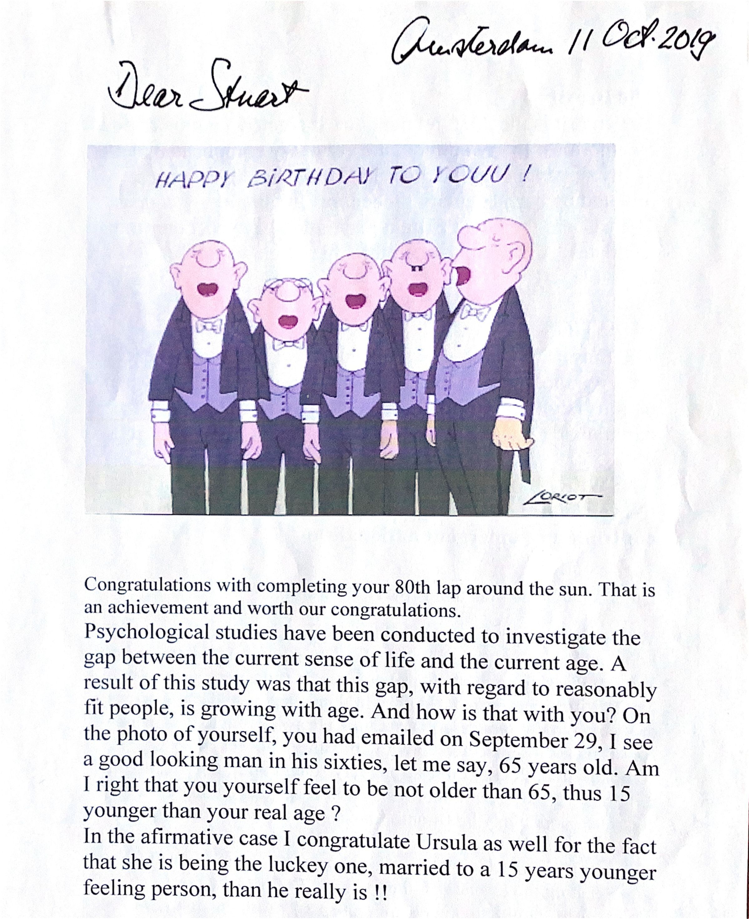 2019-10-11 Mail to Stuart Cook to congratulate him with his 80th birthday and over eau de Portugal.