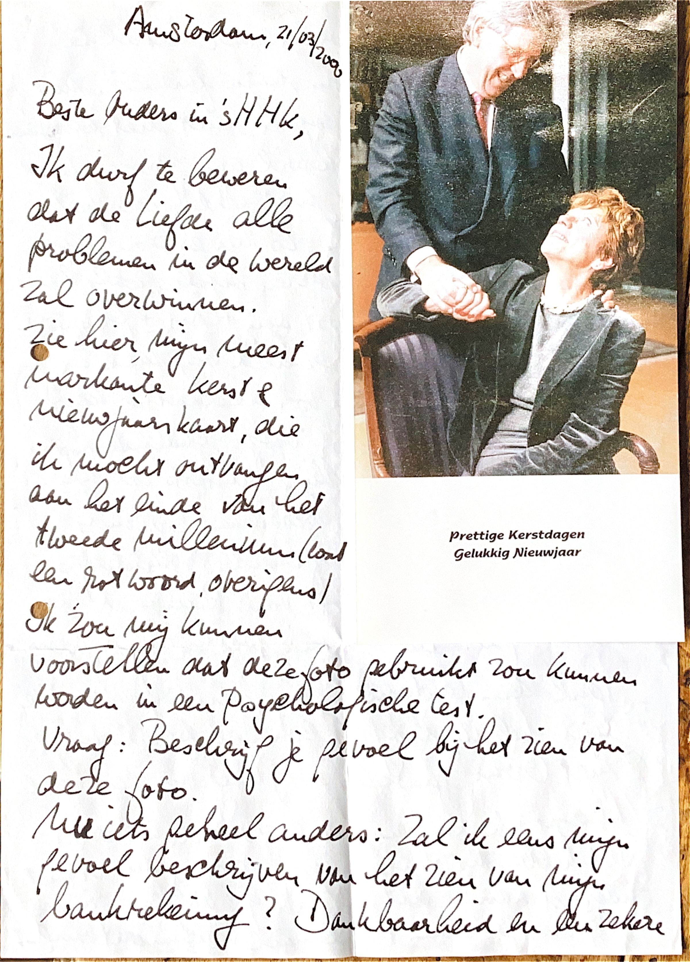 Ik zou mij kunnen voorstellen, dat de foto van de "Season Grettings" kaart gebruikt zou kunnen worden in een psychologische test. Vraag: Beschrijf het gevoel bij het zien van deze foto?