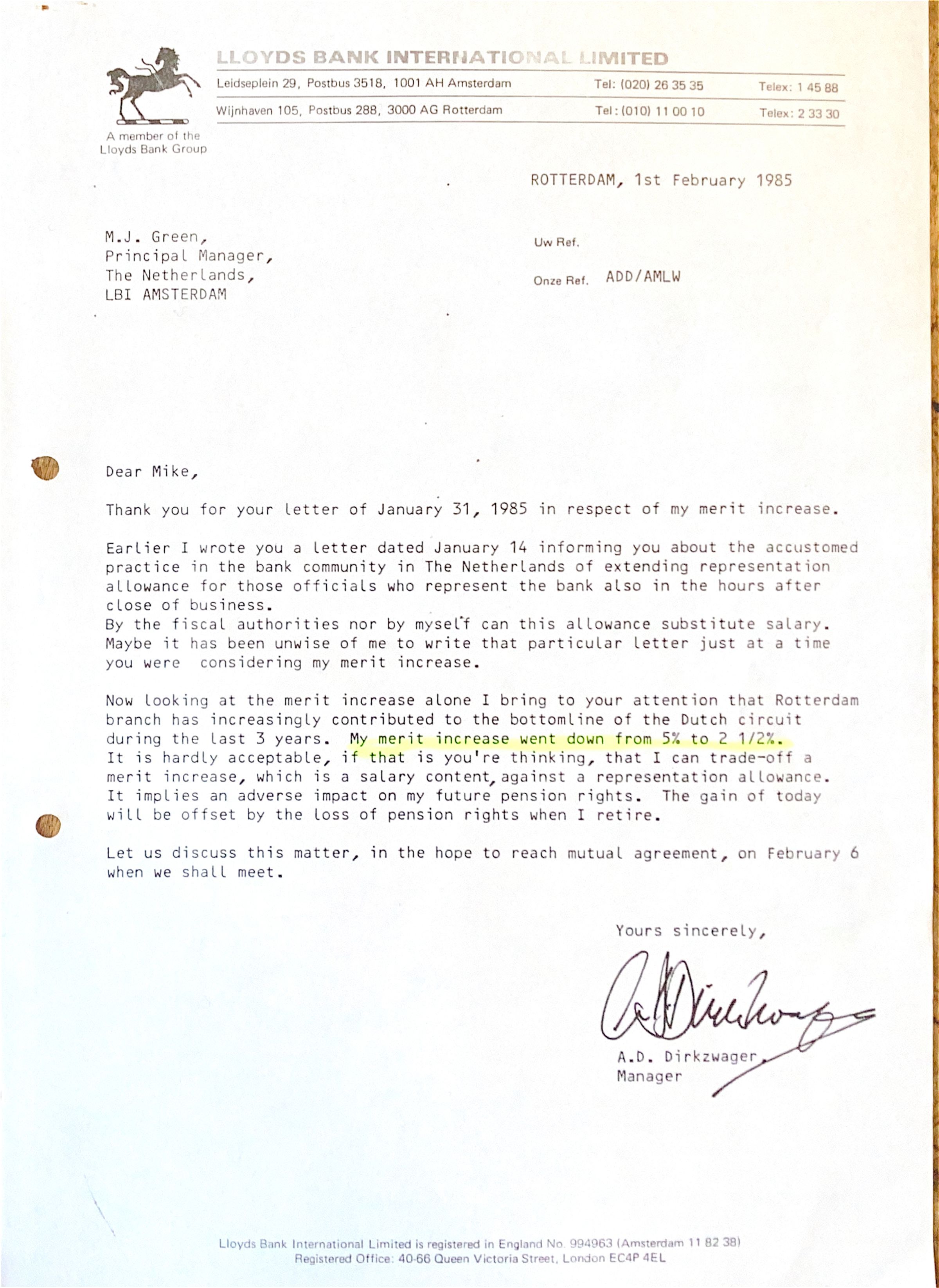 Ontevredenheid over mijn vermindering van mijn jaarlijkse merit , omdat ik als manager v. Rotterdam branch maandelijks een NLG 300,- representatie-vergoeding voor het eerst ontvangUpdate Date