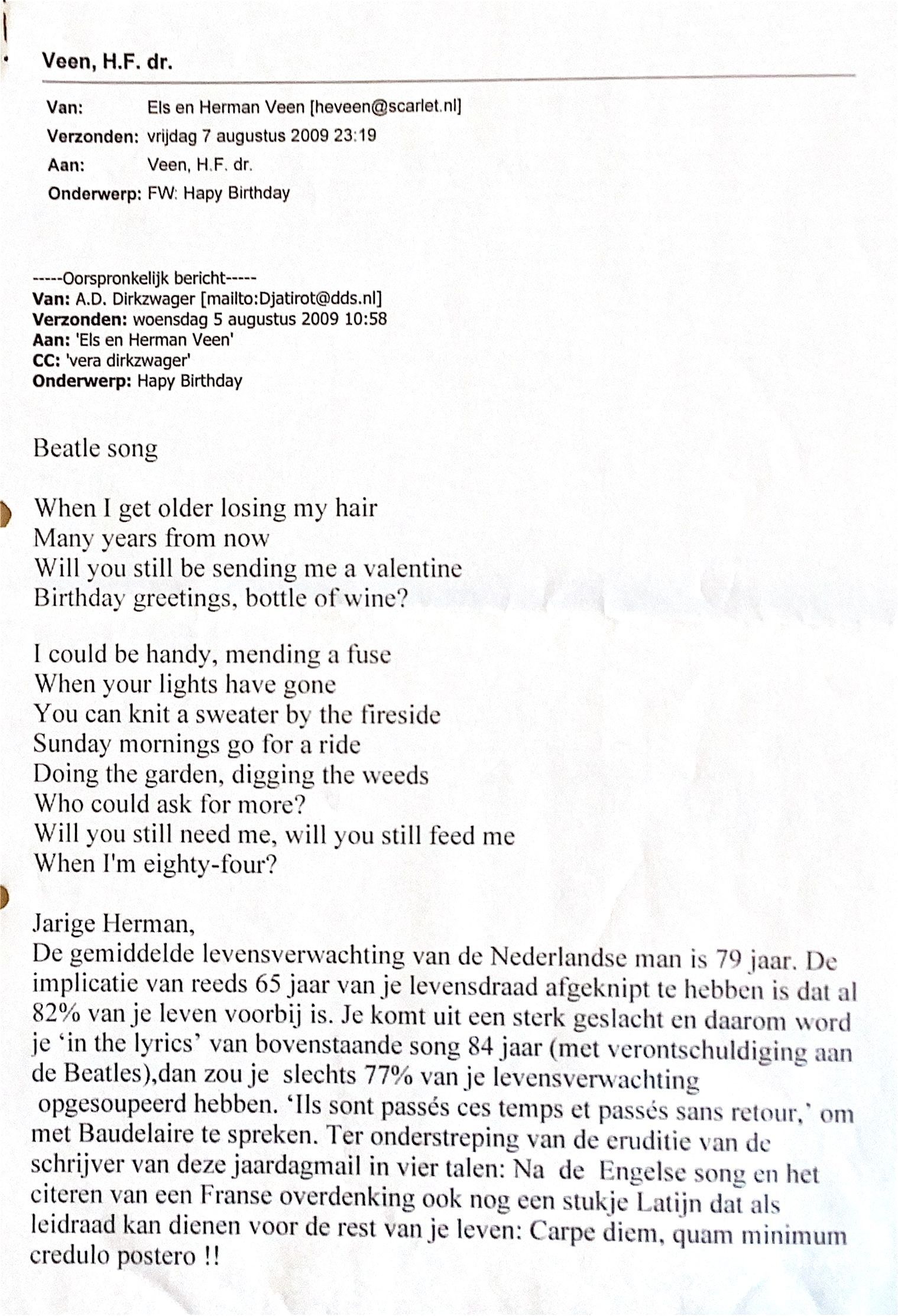 Ter onderstreping van de eruditie van de schrijver van deze verjaardagsmail met drie saillante buitenlandse quotes. Na de Engelse song en het citeren van een Franse overdenking ook nog een stukje Latijn, dat als leidraad kan dienen voor de rest van je leven: