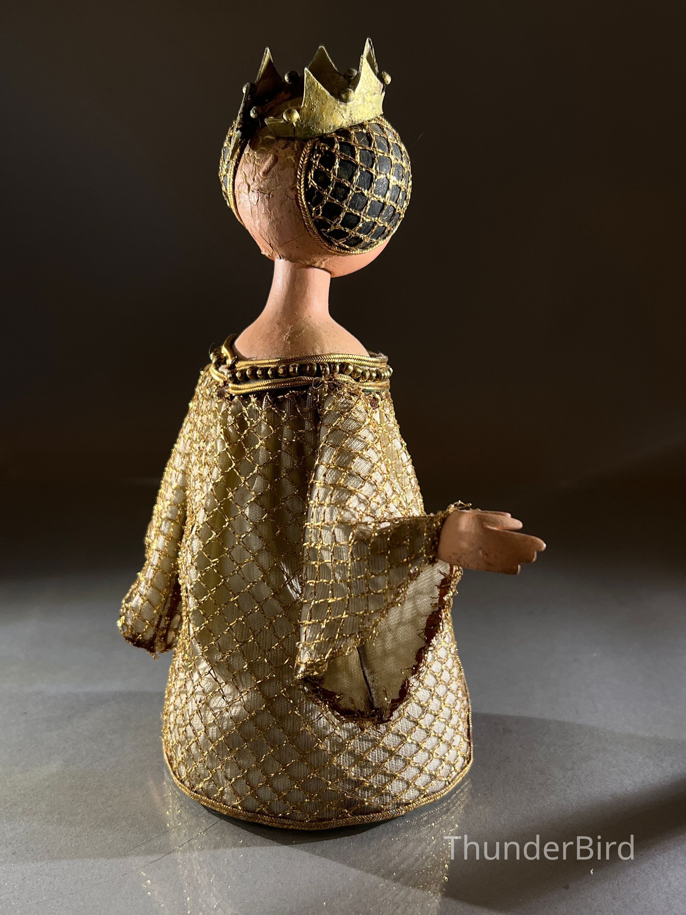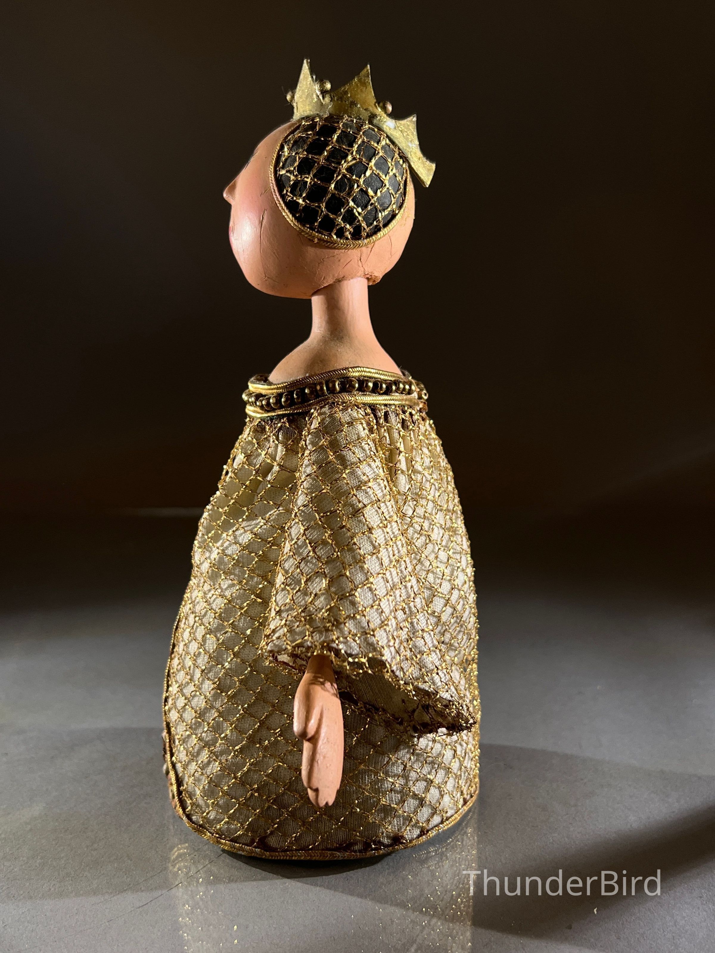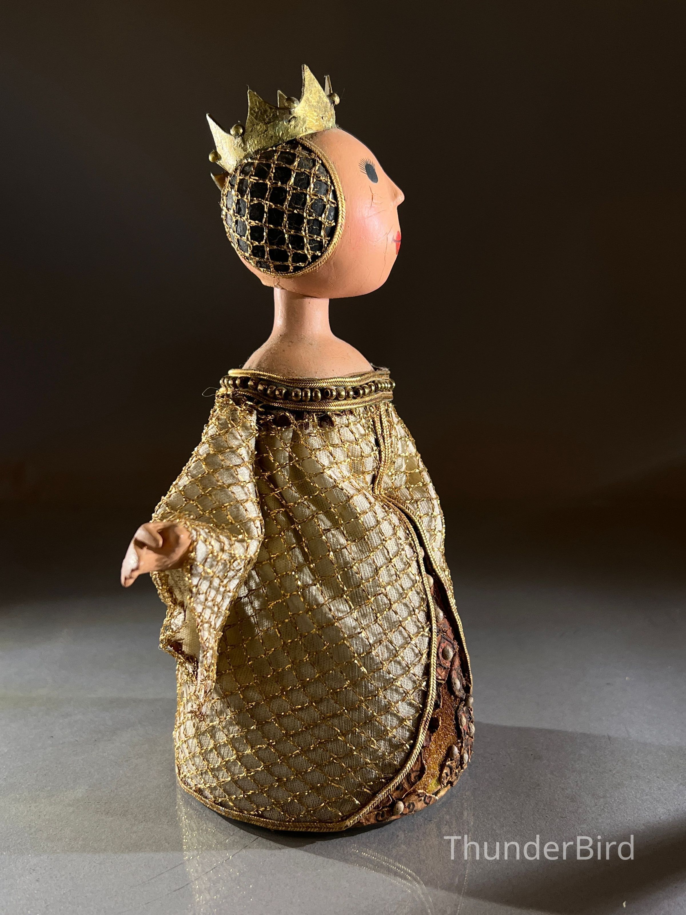 A charming stop-motion puppet representing a queenly figure, crowned and dressed in regal gold. The character features a hand-moulded face with stylised painted features and a structured gown formed from layered ivory fabric overlaid with metallic gold mesh. Decorative detailing around the neckline and sleeves adds texture and depth. Her serene expression and symmetrical stance suggest grace and nobility—an archetypal fairytale queen.