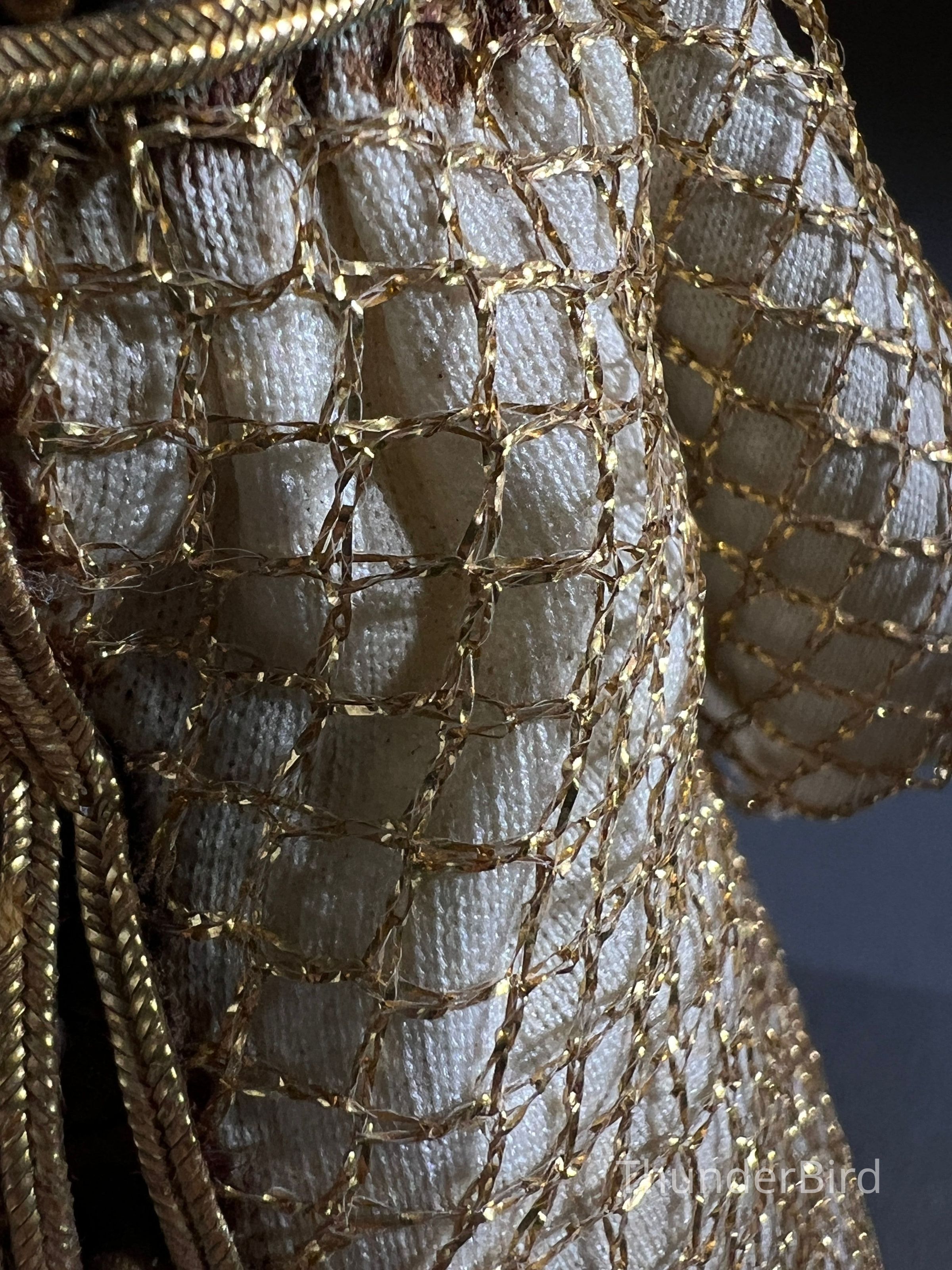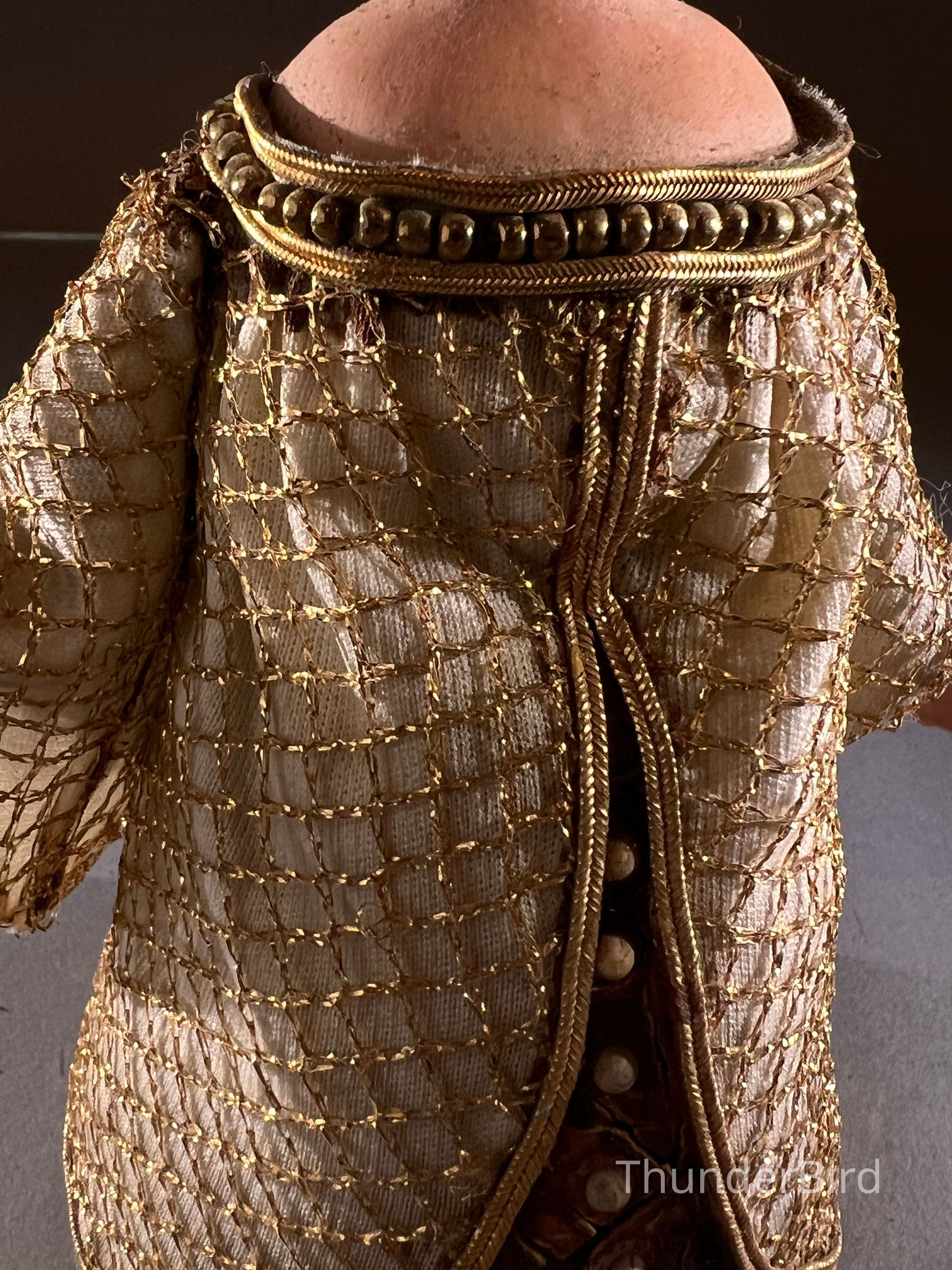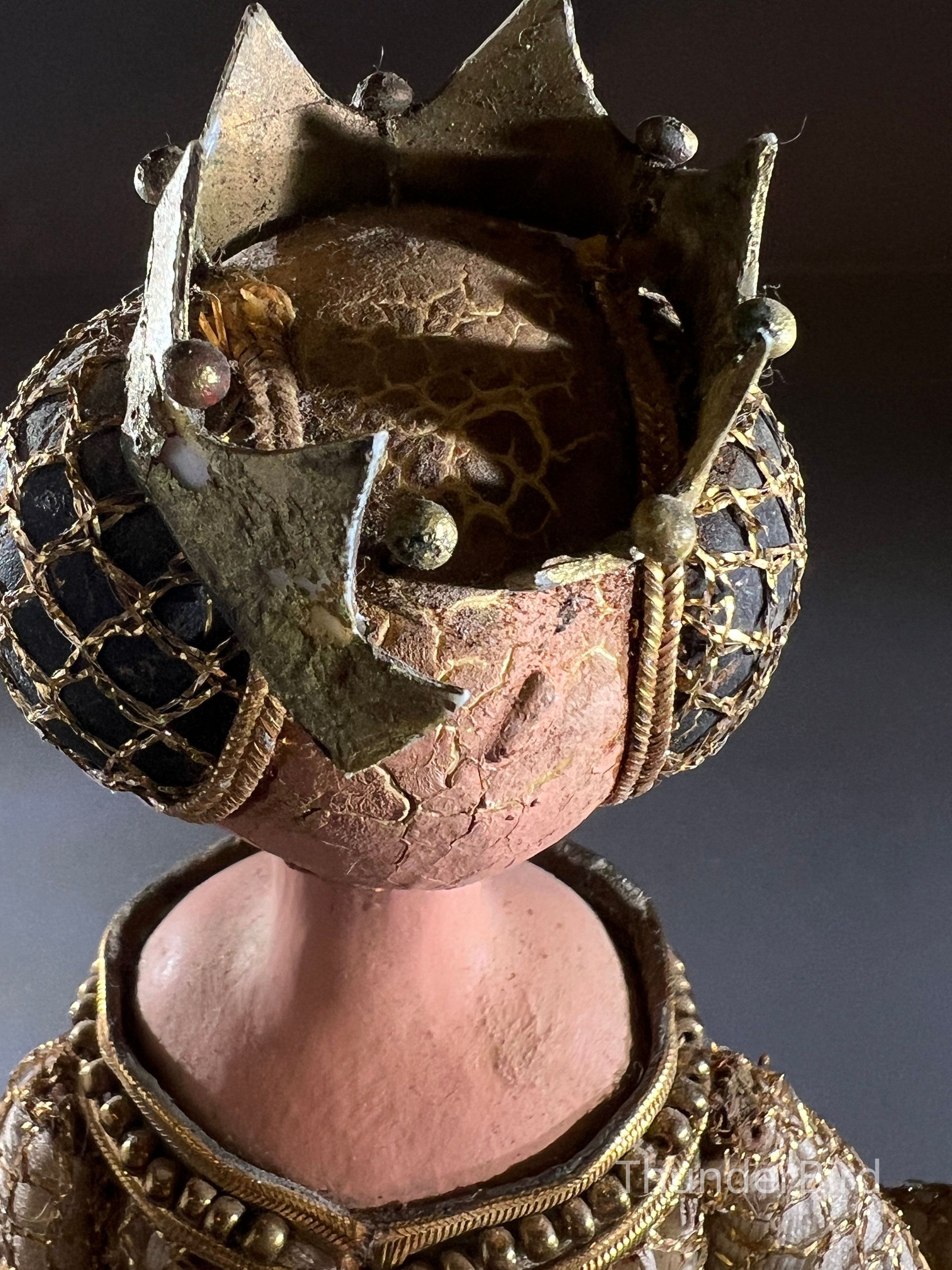 A charming stop-motion puppet representing a queenly figure, crowned and dressed in regal gold. The character features a hand-moulded face with stylised painted features and a structured gown formed from layered ivory fabric overlaid with metallic gold mesh. Decorative detailing around the neckline and sleeves adds texture and depth. Her serene expression and symmetrical stance suggest grace and nobility—an archetypal fairytale queen.