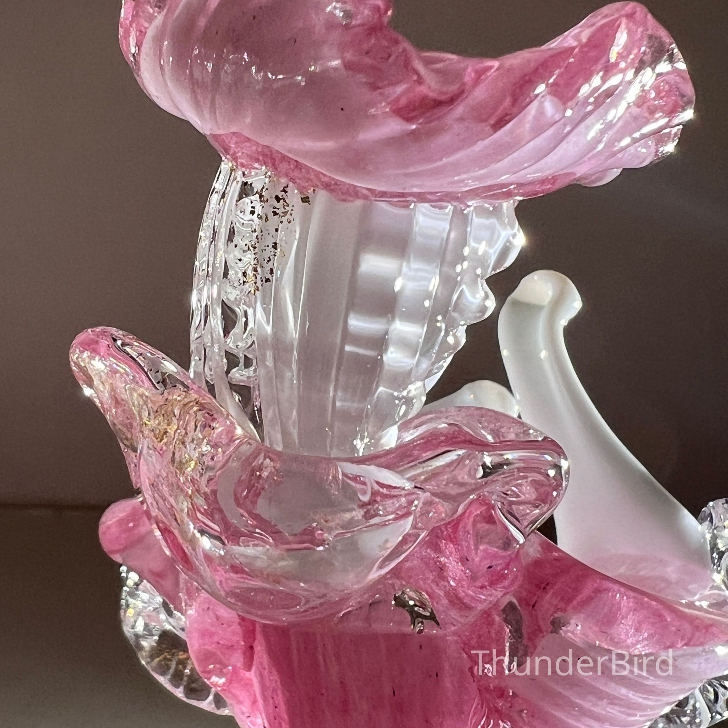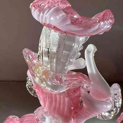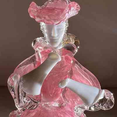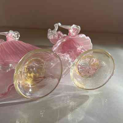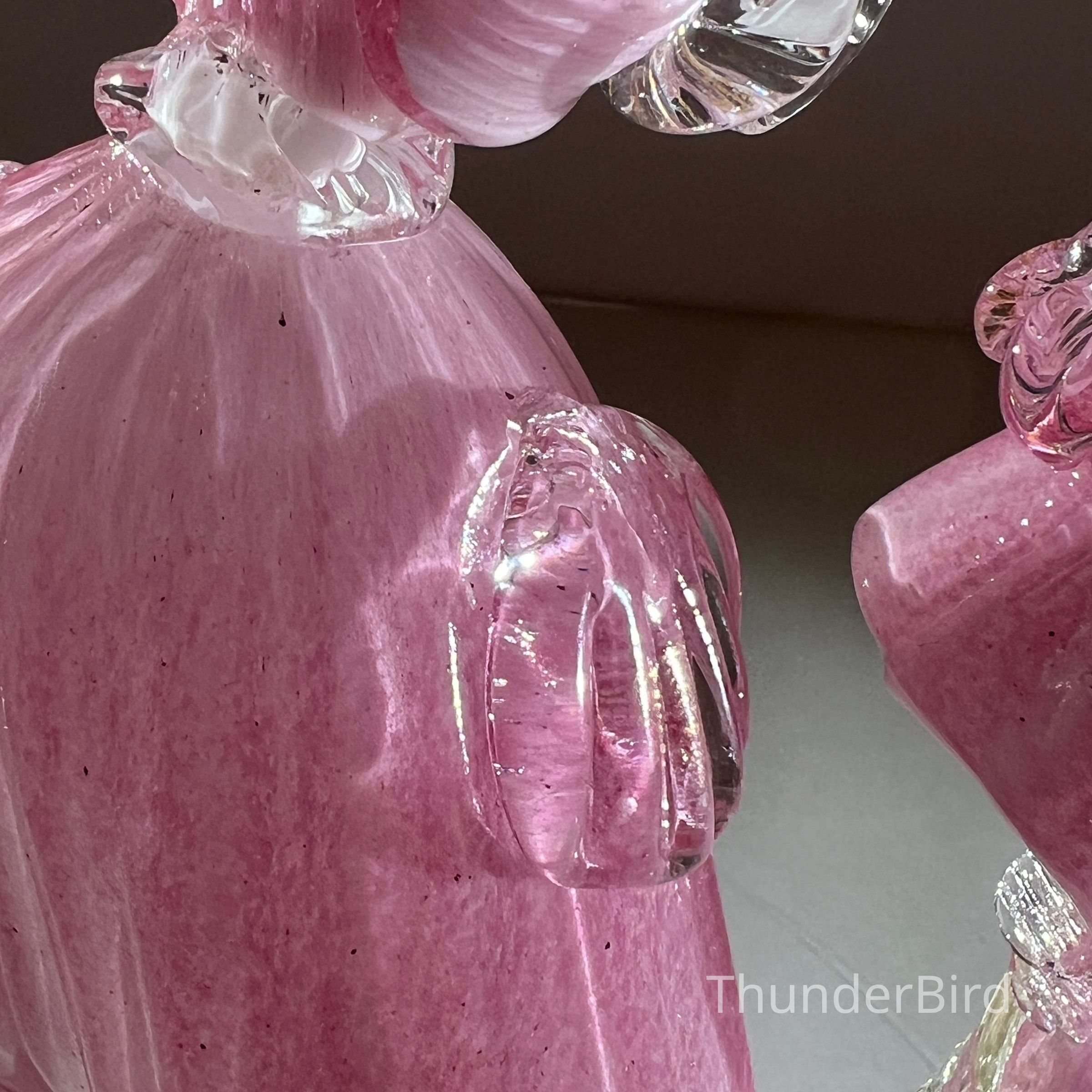 The male and female dancers are in beautifully shaped costumes of pink glass with gold fleck detail and finished with white and clear glass accents. The detailing in the folds of their clothes, ruffled collars, hats, and expressive gestures gives them a lifelike sense of movement and theatricality.