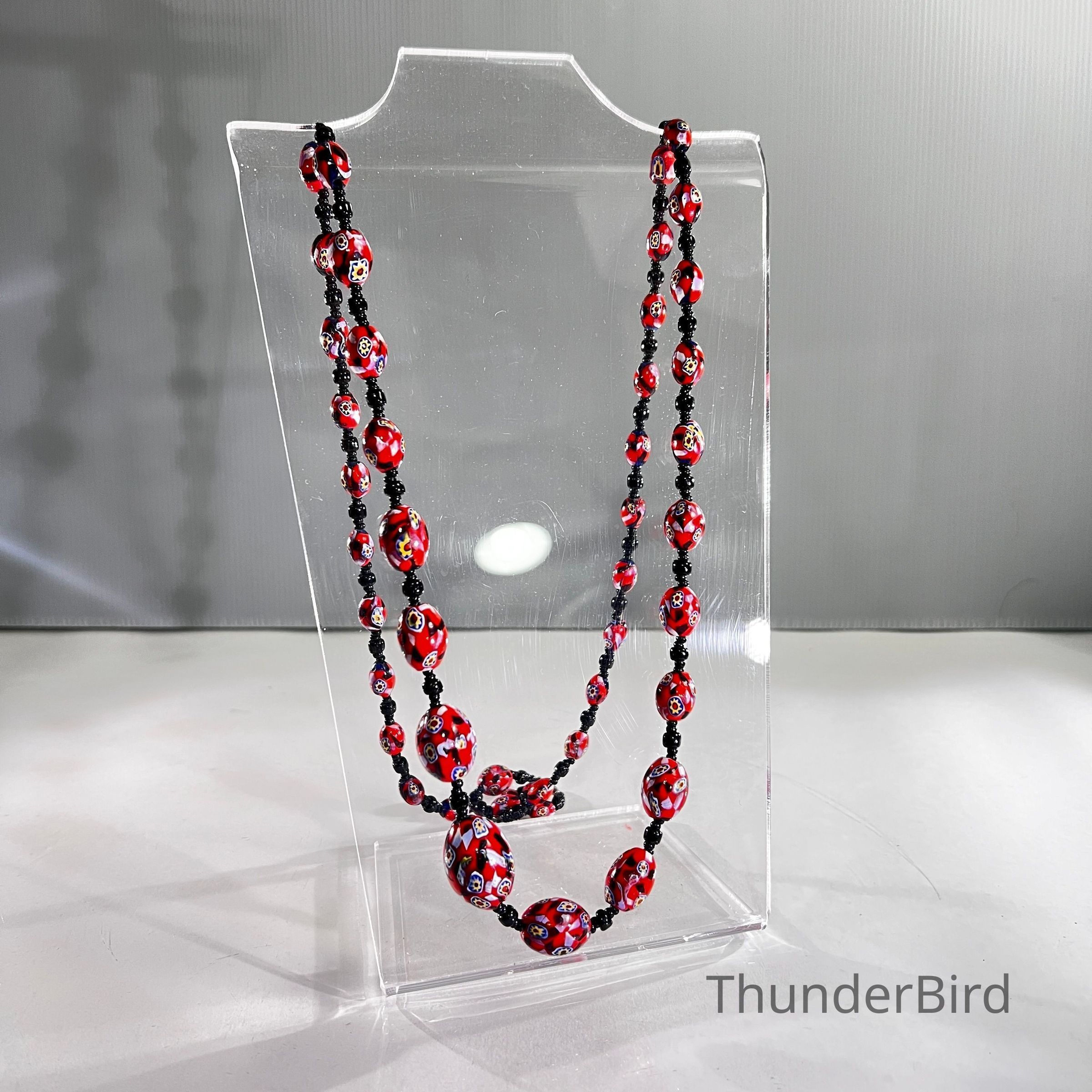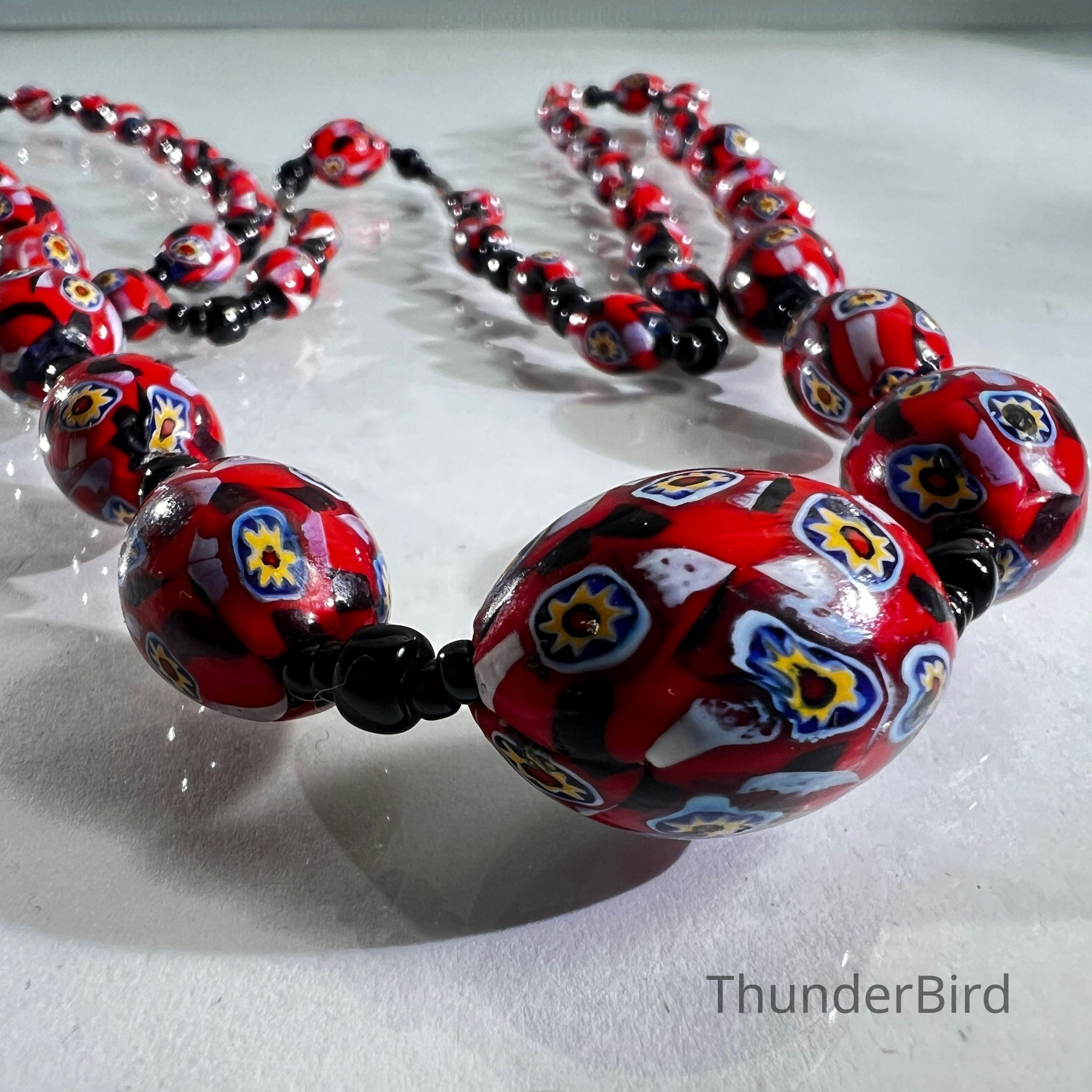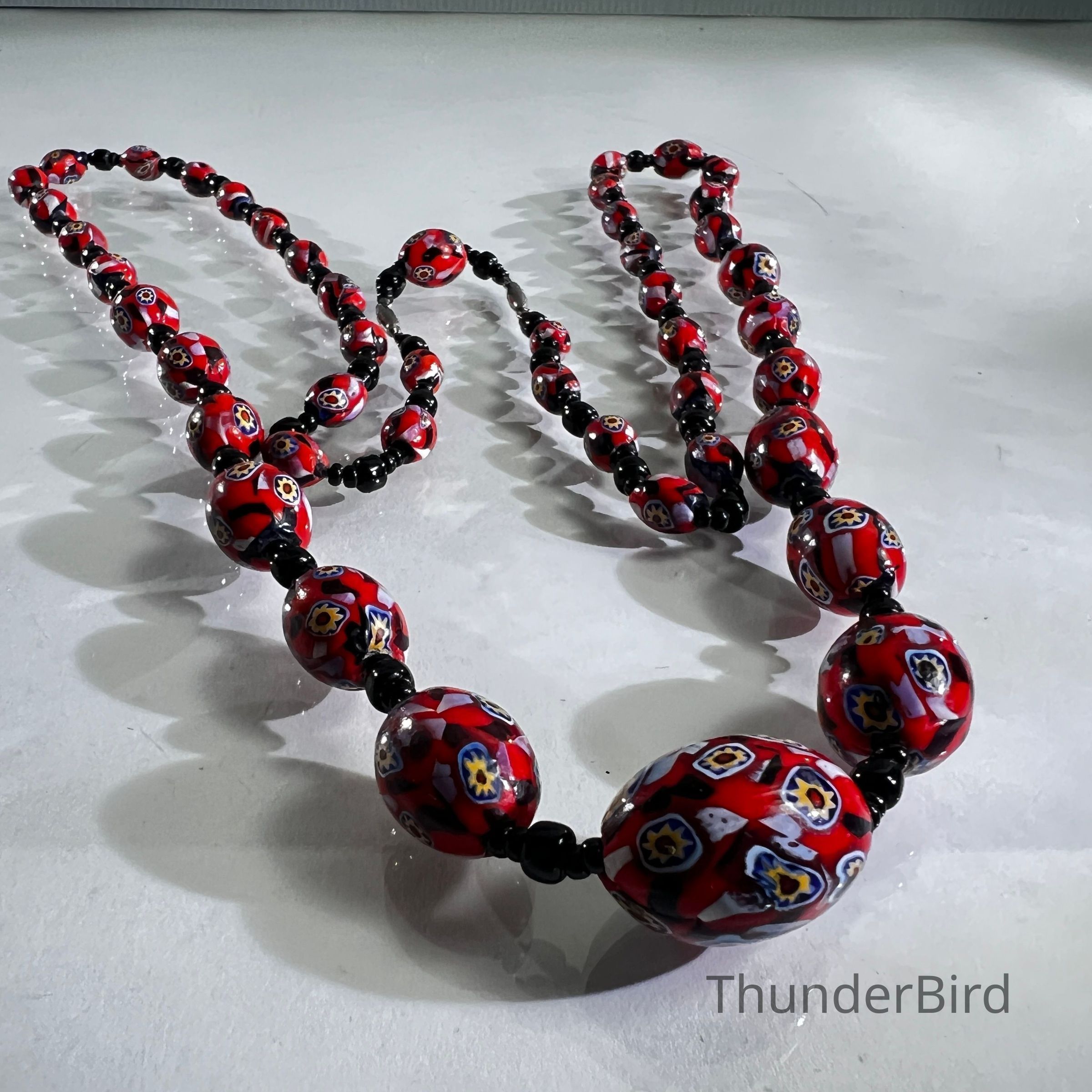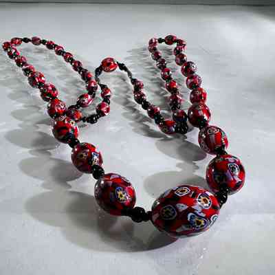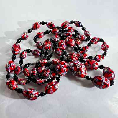 13.11.25d Vintage Murano Millefiori Glass Bead Necklace – Long Length, Vibrant Red & BlackEntry/Object ID