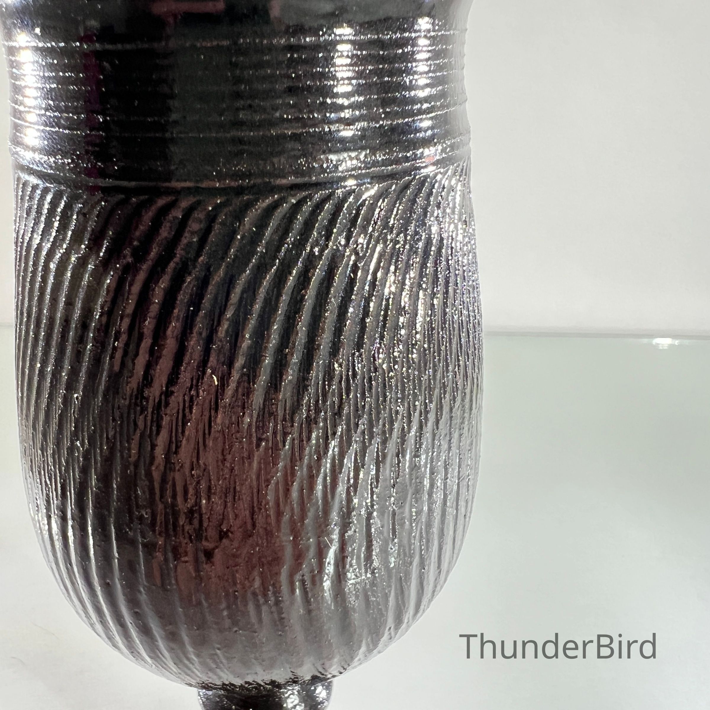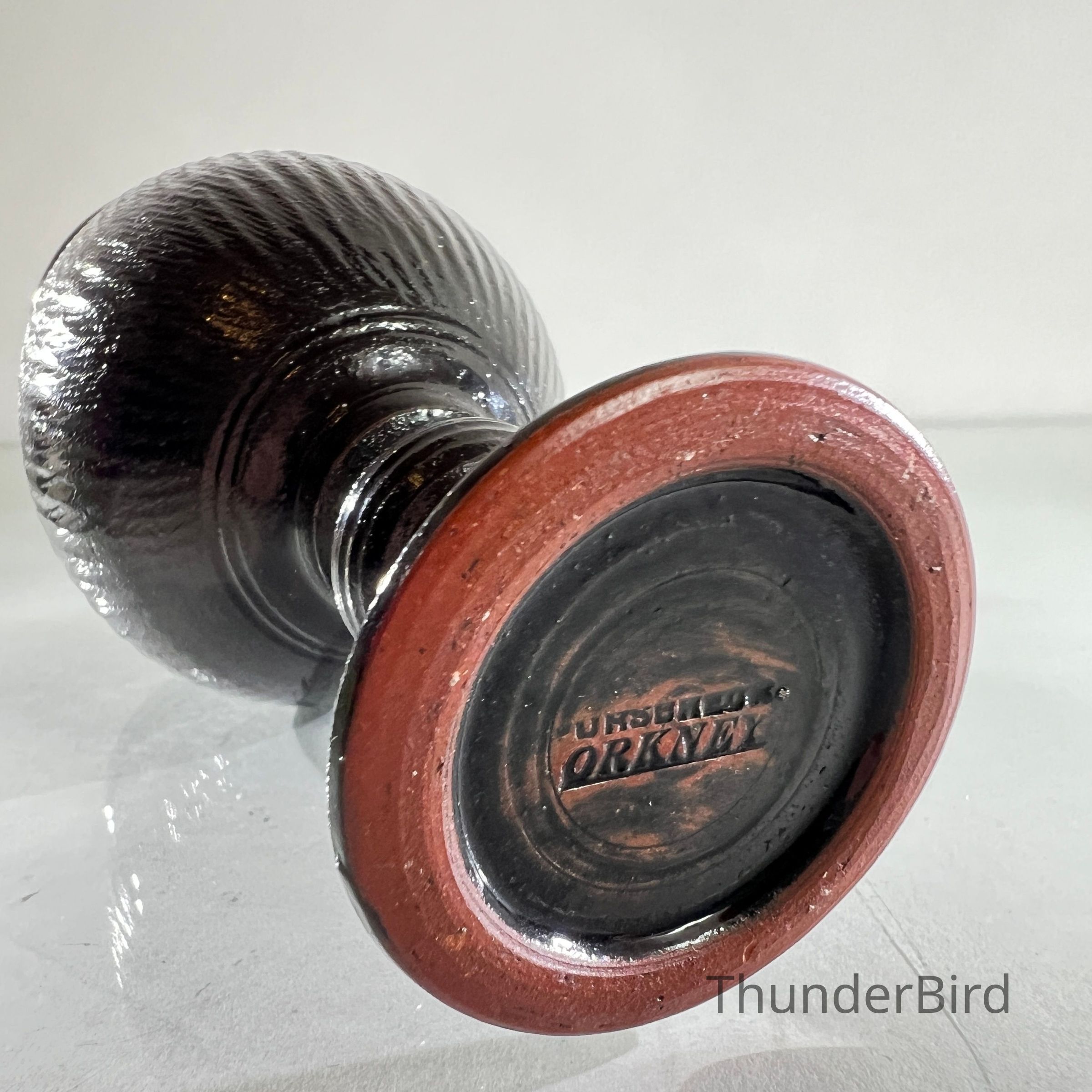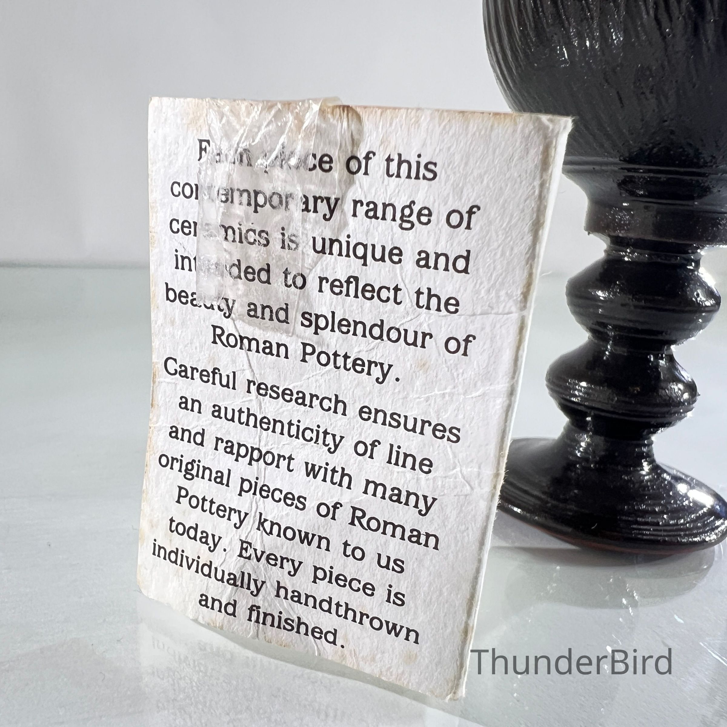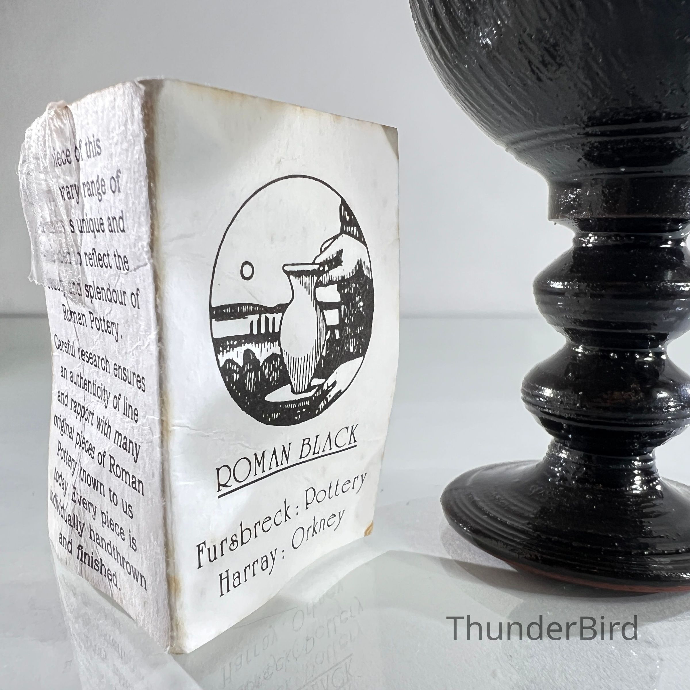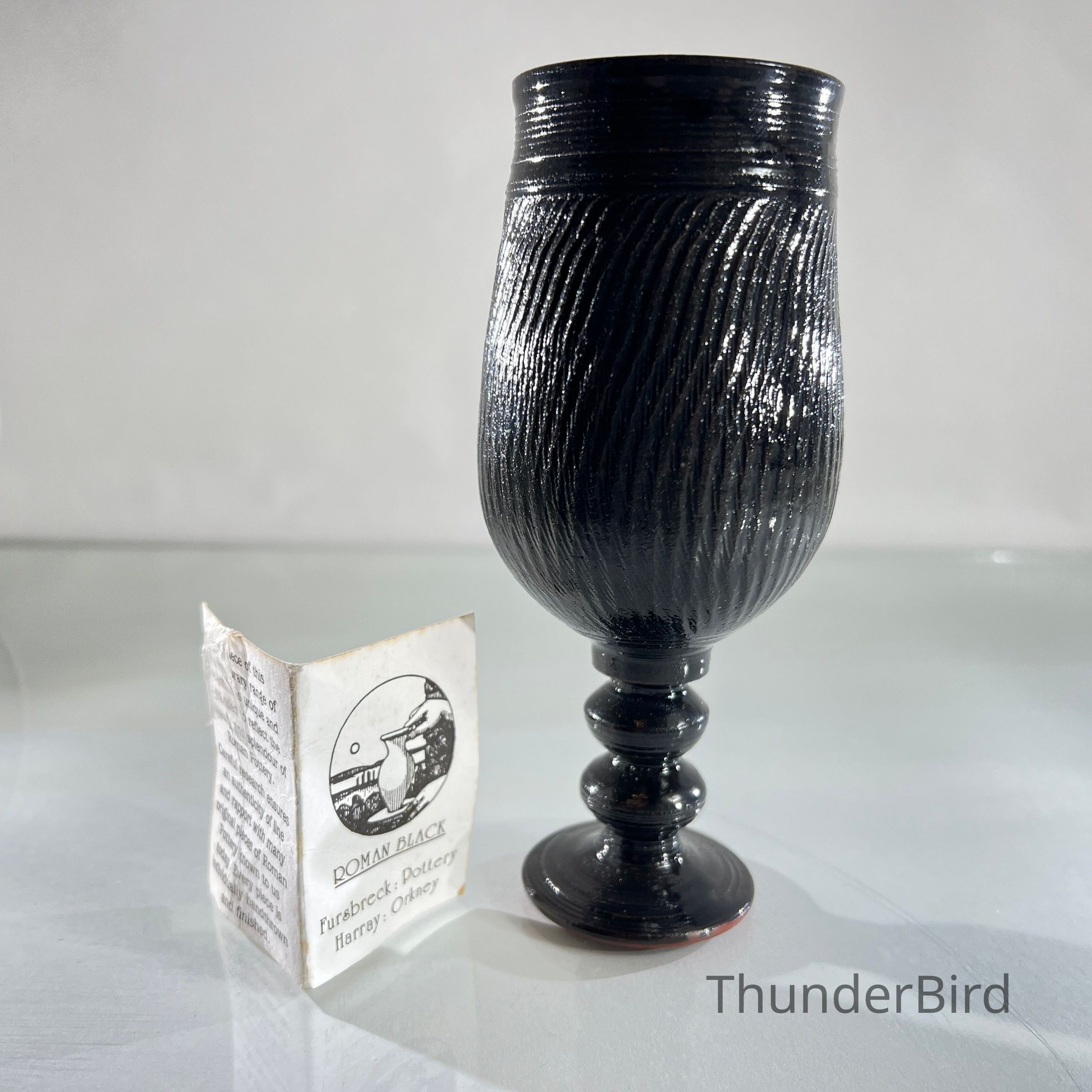 A studio pottery goblet from Fursbreck Pottery, Harra, Orkney, part of their 'Roman Black' range. This series was designed to reflect the form and character of ancient Roman pottery, with careful attention to line, texture and traditional finishing techniques. The piece is handthrown and finished in a deep black glaze with ribbed texture and baluster stem. It is stamped to the base and includes the original paper label detailing the range’s historical inspiration.