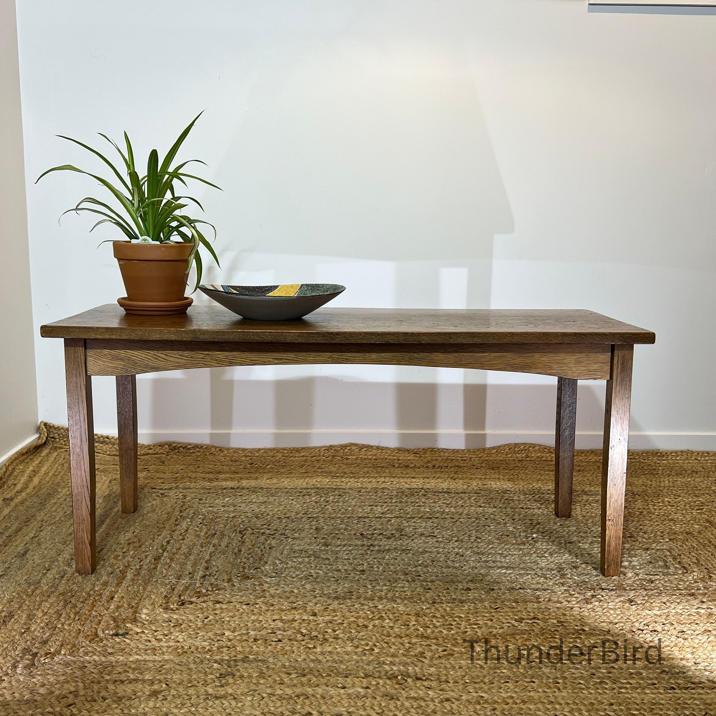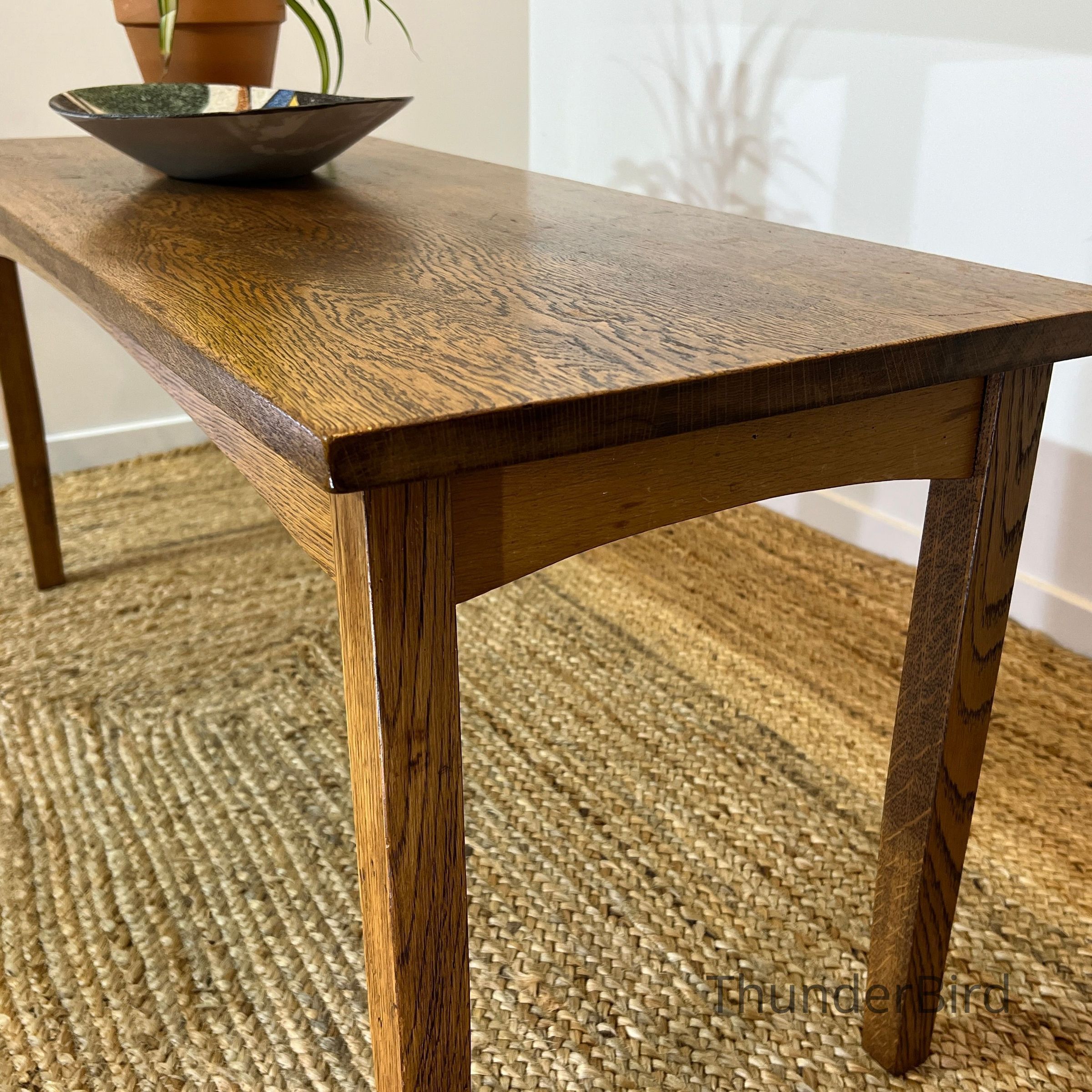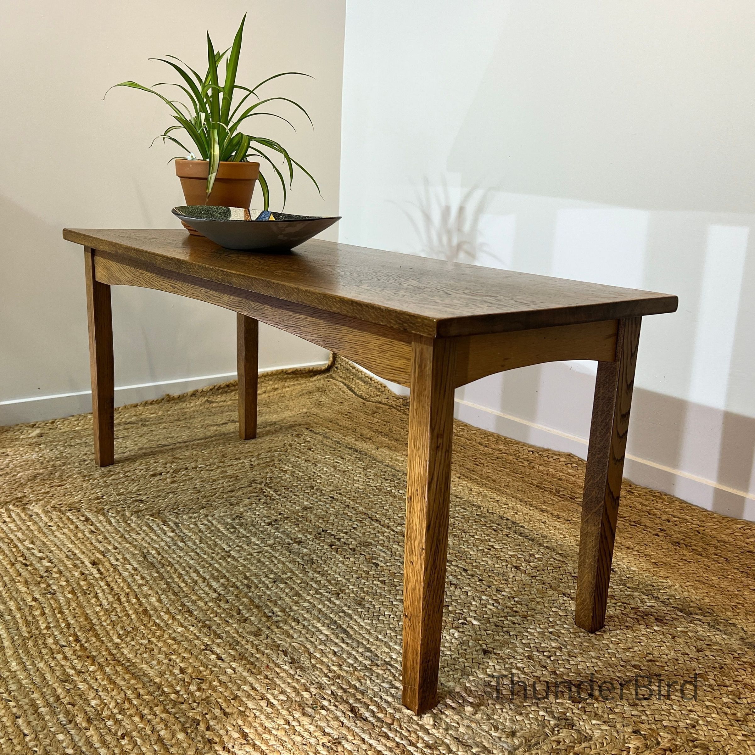 A well proportioned solid oak coffee table with a clean, understated design that highlights the natural beauty of the timber. Likely dating from the mid to late 20th century, this piece reflects classic, functional furniture design with an emphasis on durability and simplicity. Its warm honey brown tone makes it an easy fit for a range of interiors, from traditional to contemporary settings. Ideal for use as a coffee table, low display table, or occasional piece in a living space.