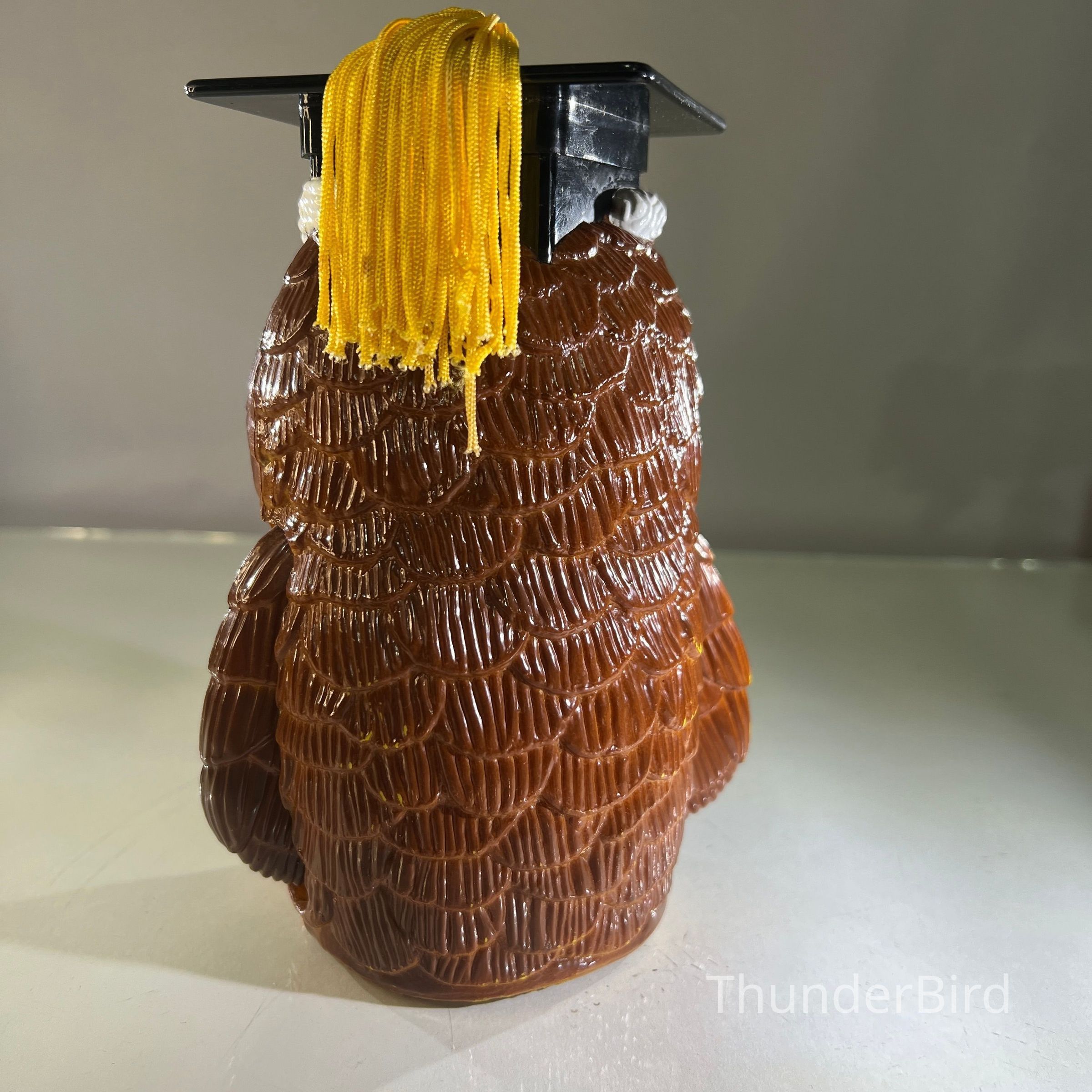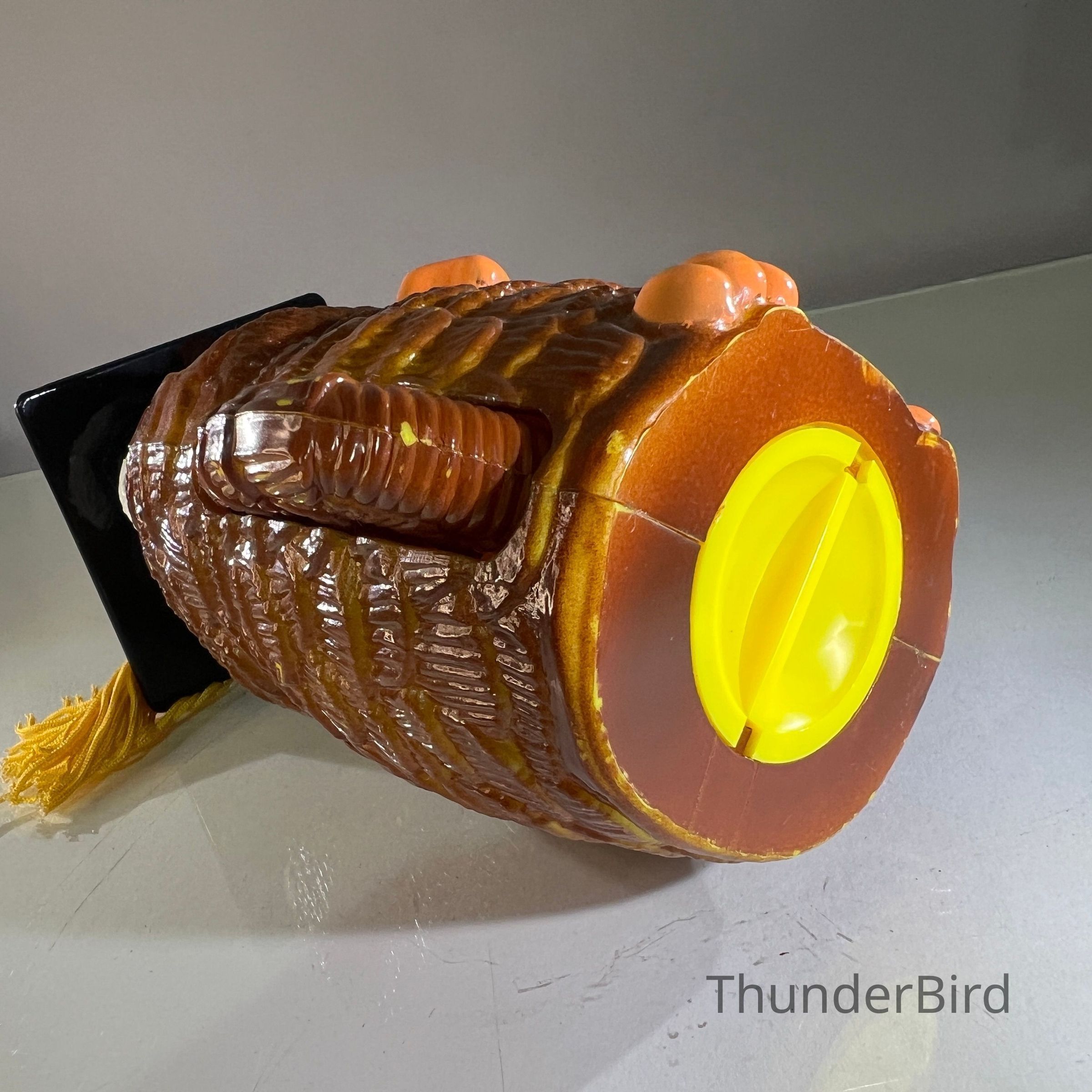 A vintage Wise Owl mechanical coin piggy bank dating to the 1970s, made from moulded plastic with brown tones and bright accent details. Designed as a novelty savings bank. When a suitably weighted coin is deposited, the eyes move and the wings flap slightly. The removable base allows access to stored coins. A charming and collectable retro piece!