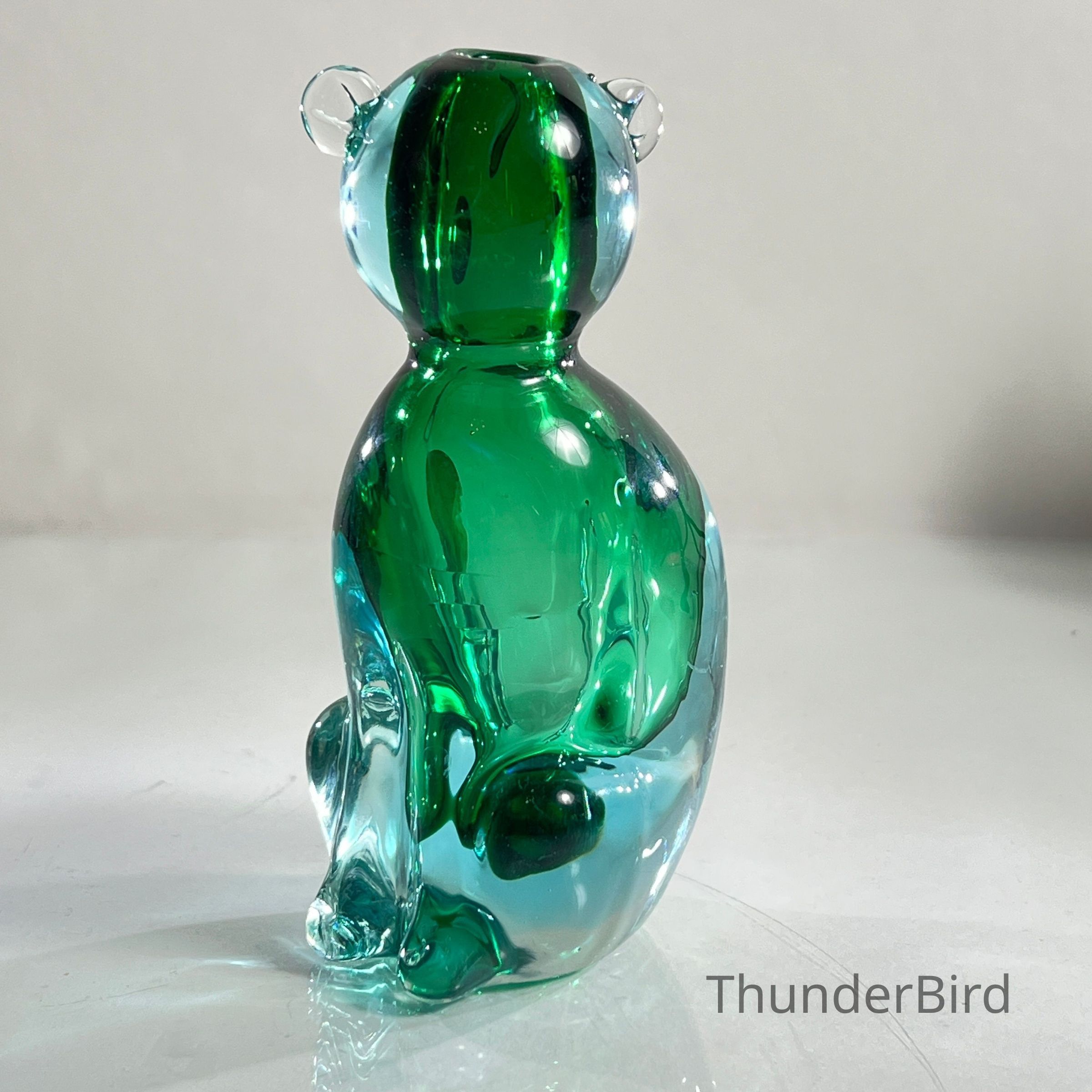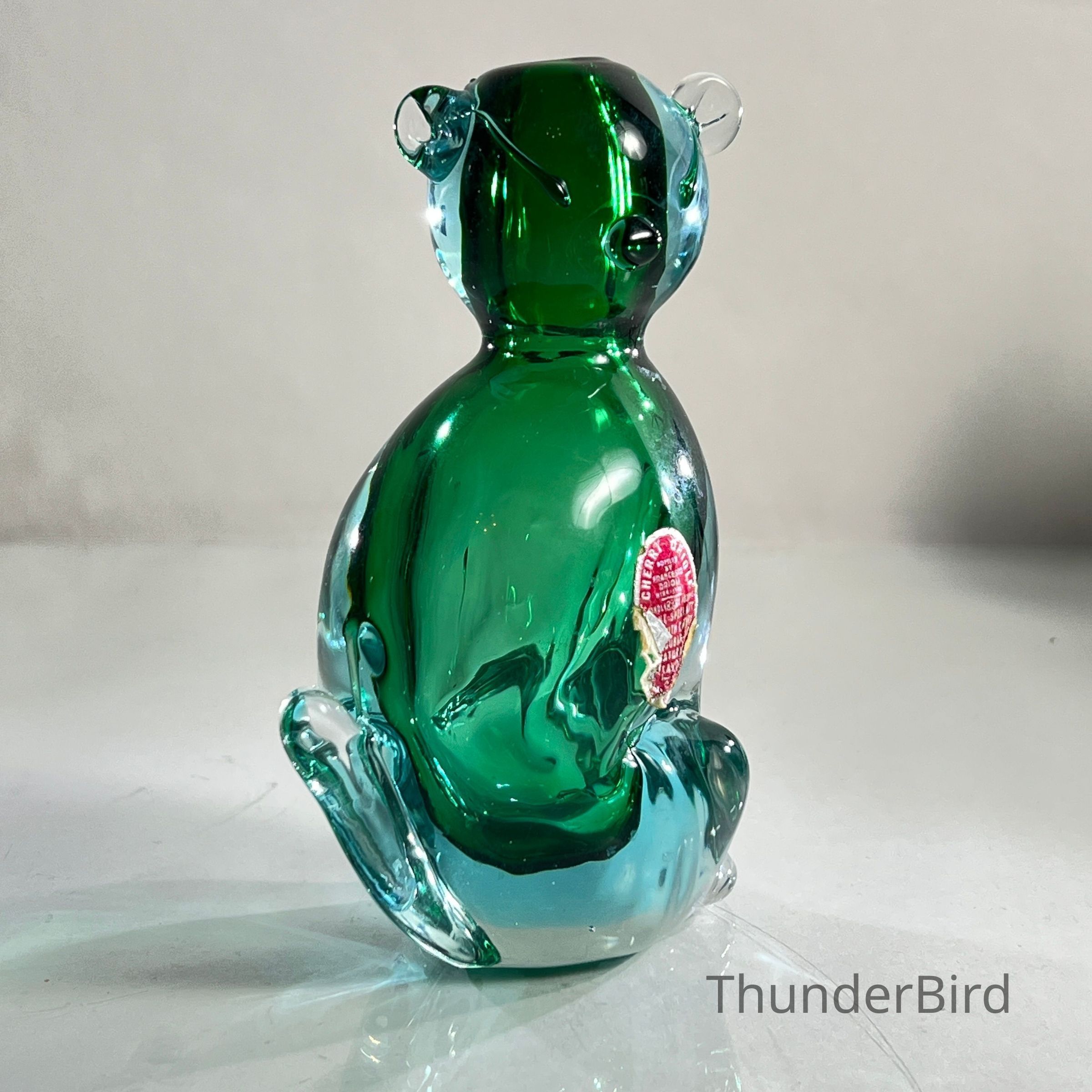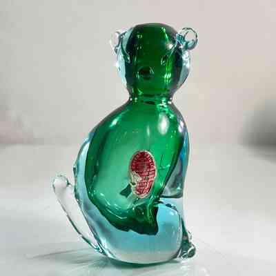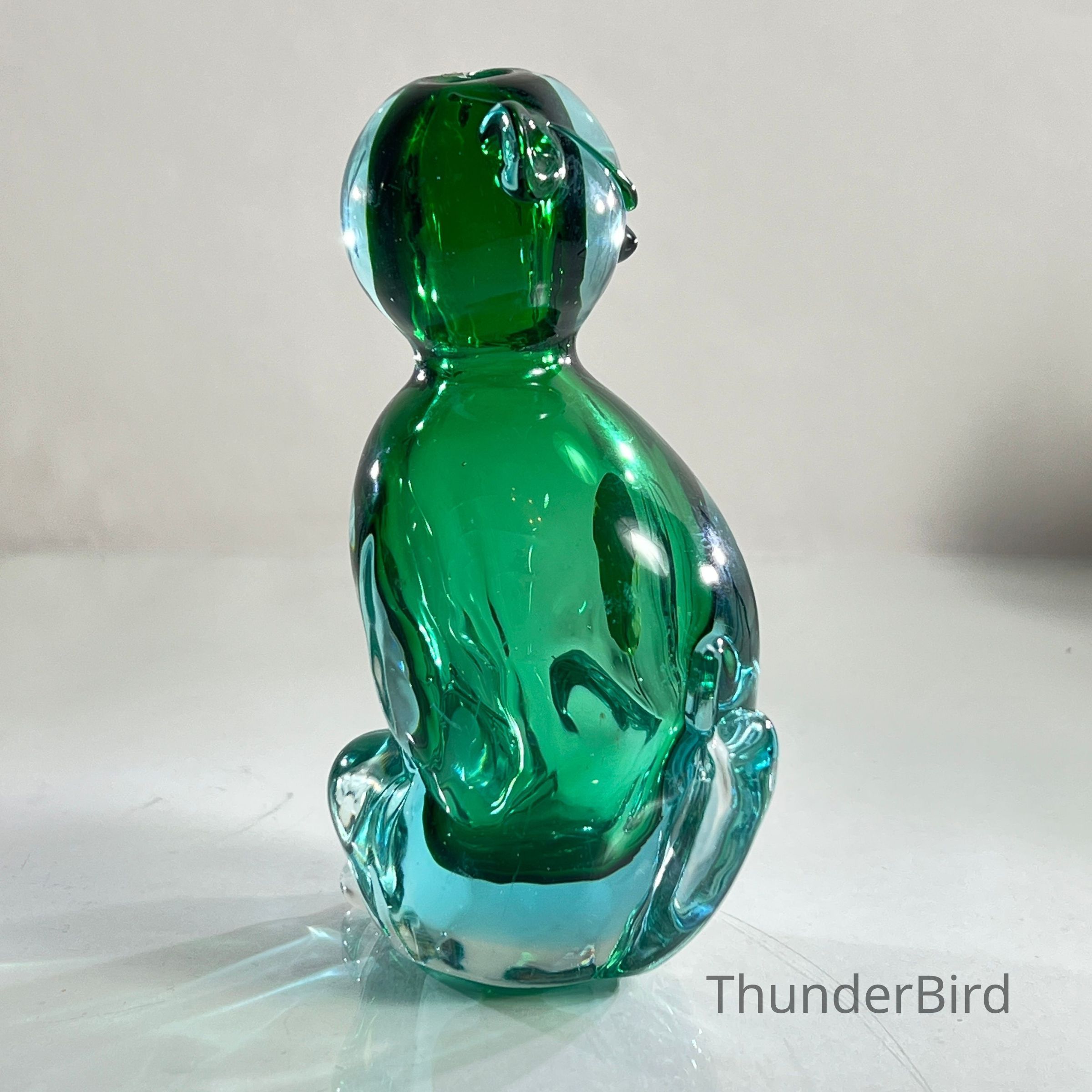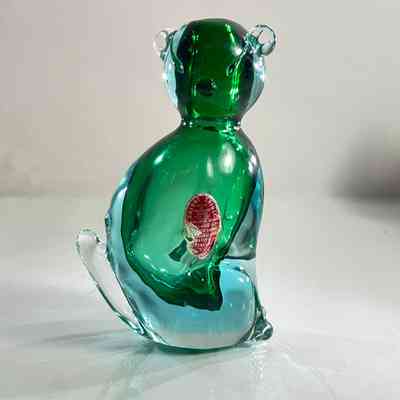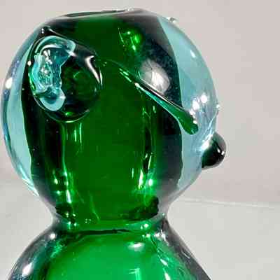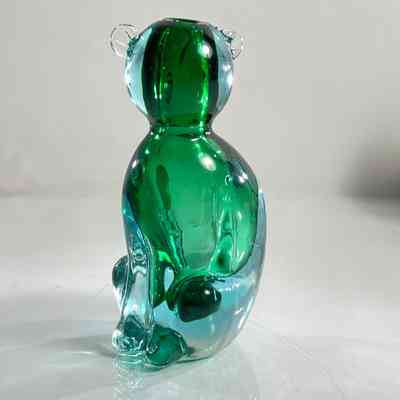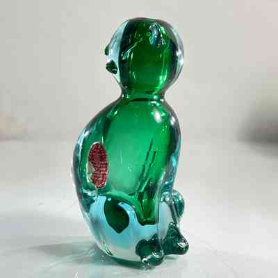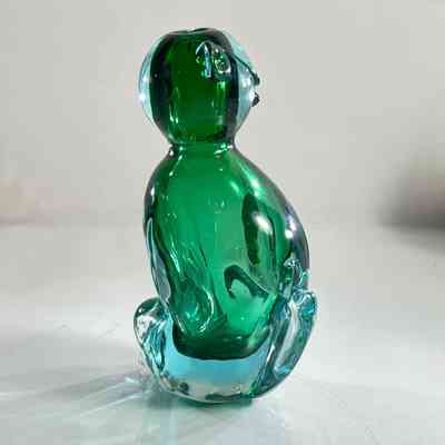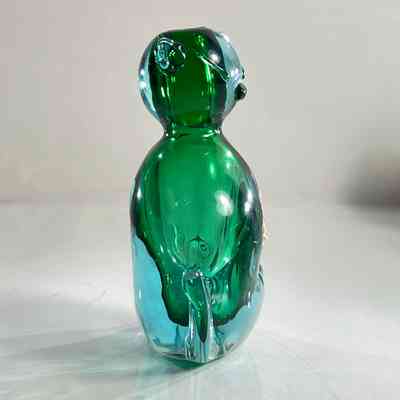 This sculptural piece is crafted in the Sommerso technique, layering emerald green and clear glass to create rich visual depth. The form features stylised facial detailing, curled tail, and expressive ears — all executed with the precision expected of Seguso workshop glass.