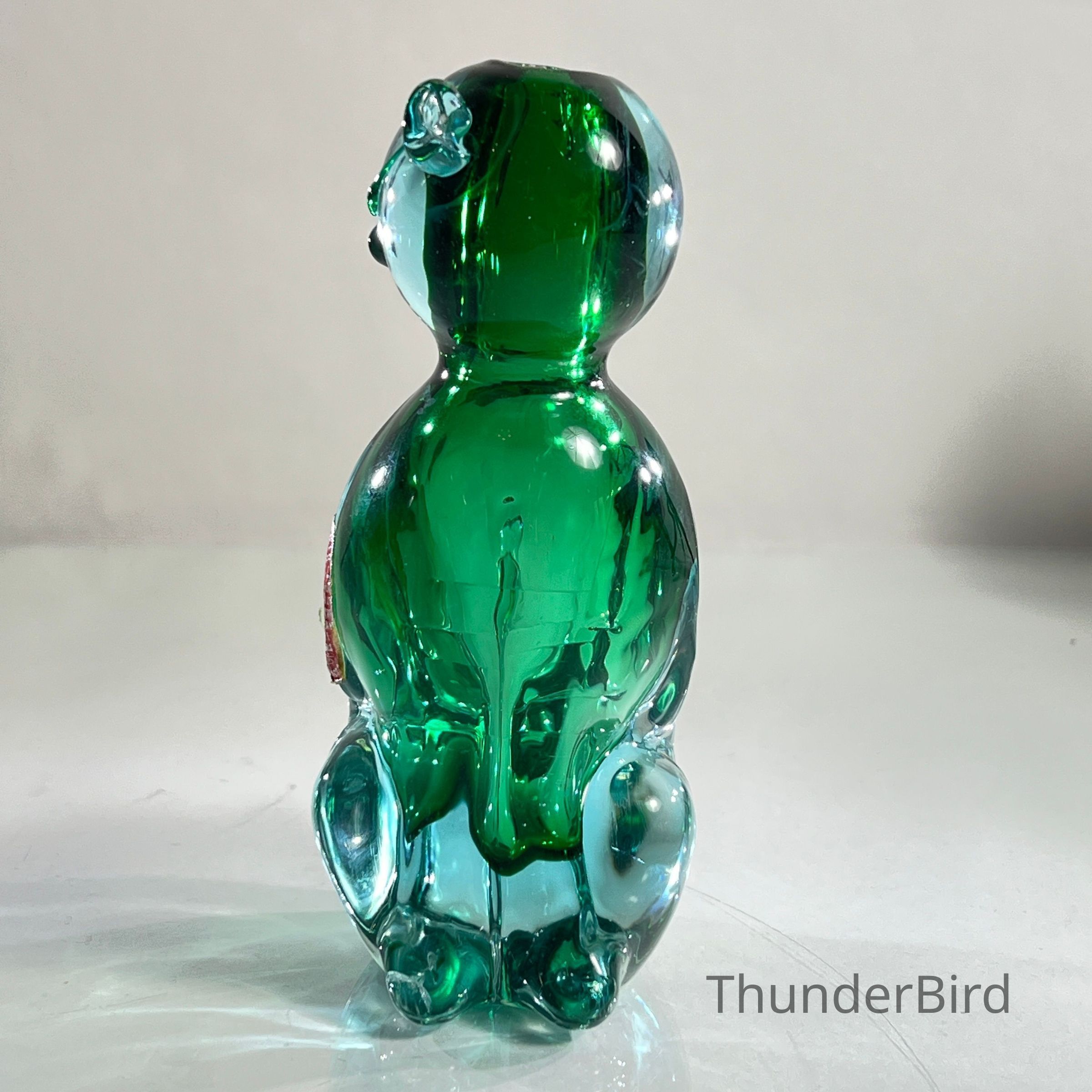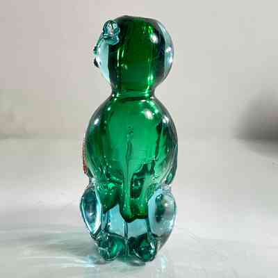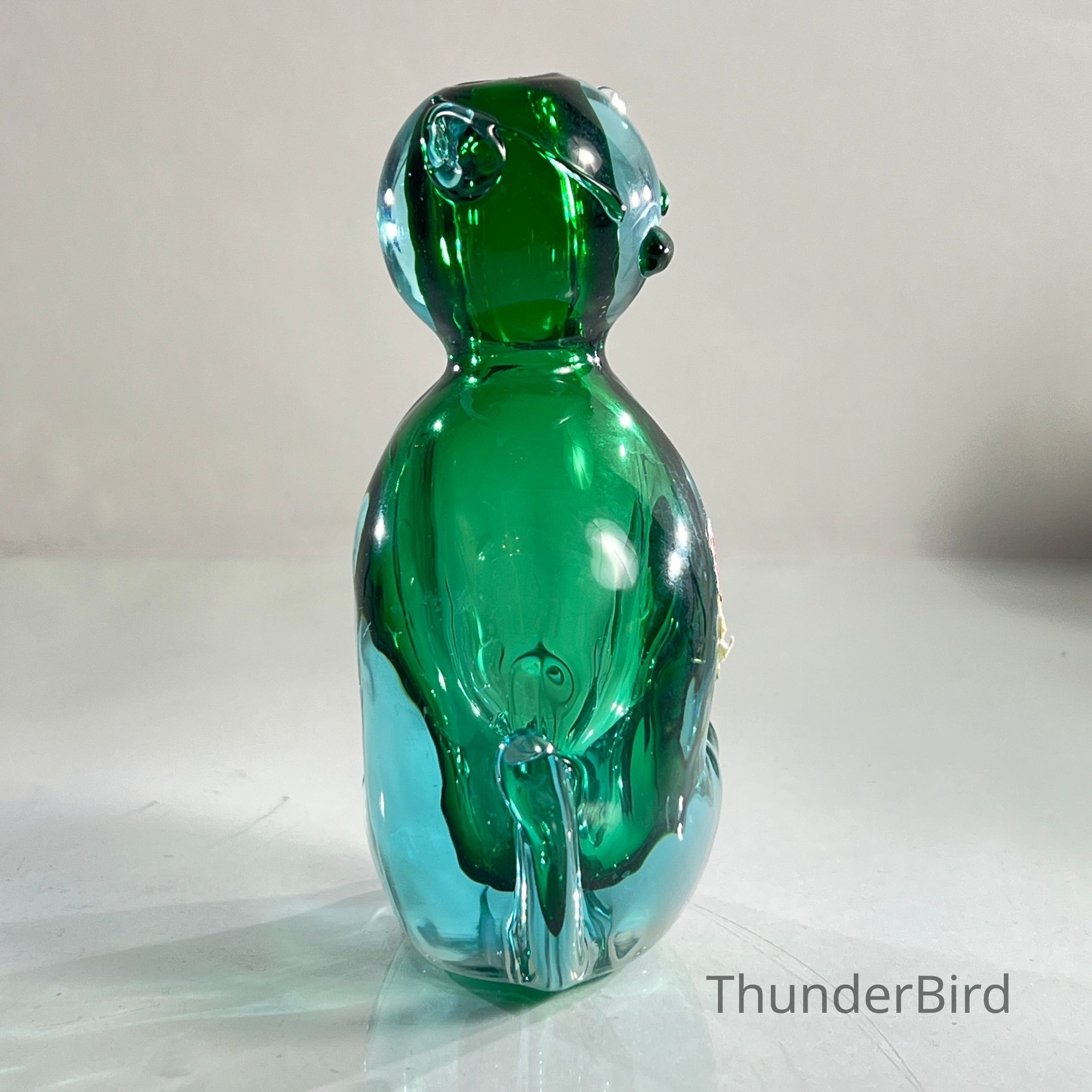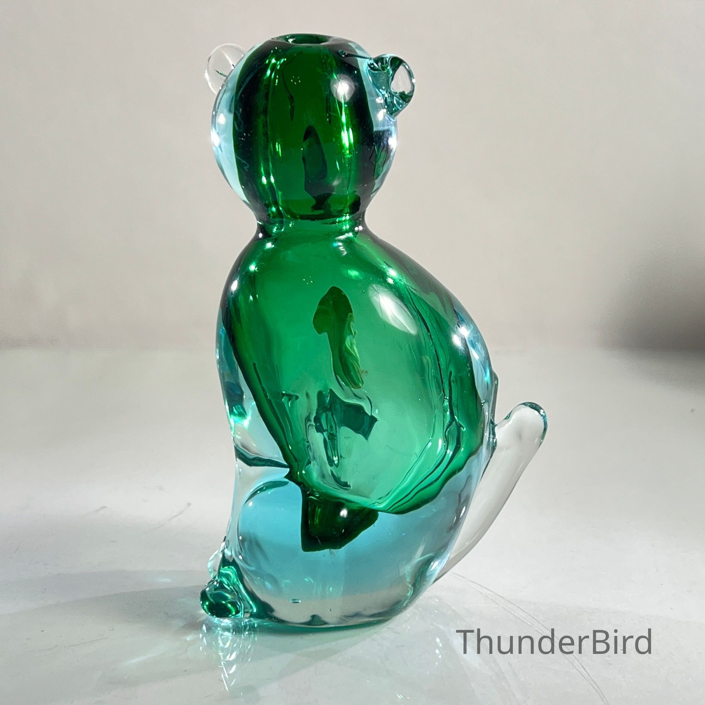 This sculptural piece is crafted in the Sommerso technique, layering emerald green and clear glass to create rich visual depth. The form features stylised facial detailing, curled tail, and expressive ears — all executed with the precision expected of Seguso workshop glass.