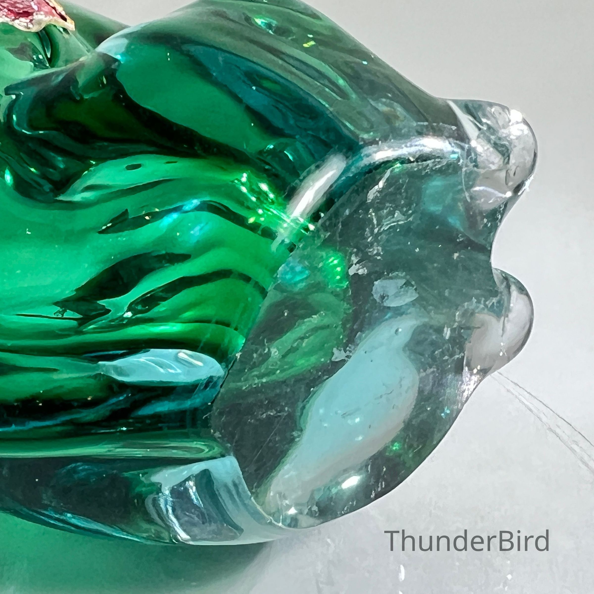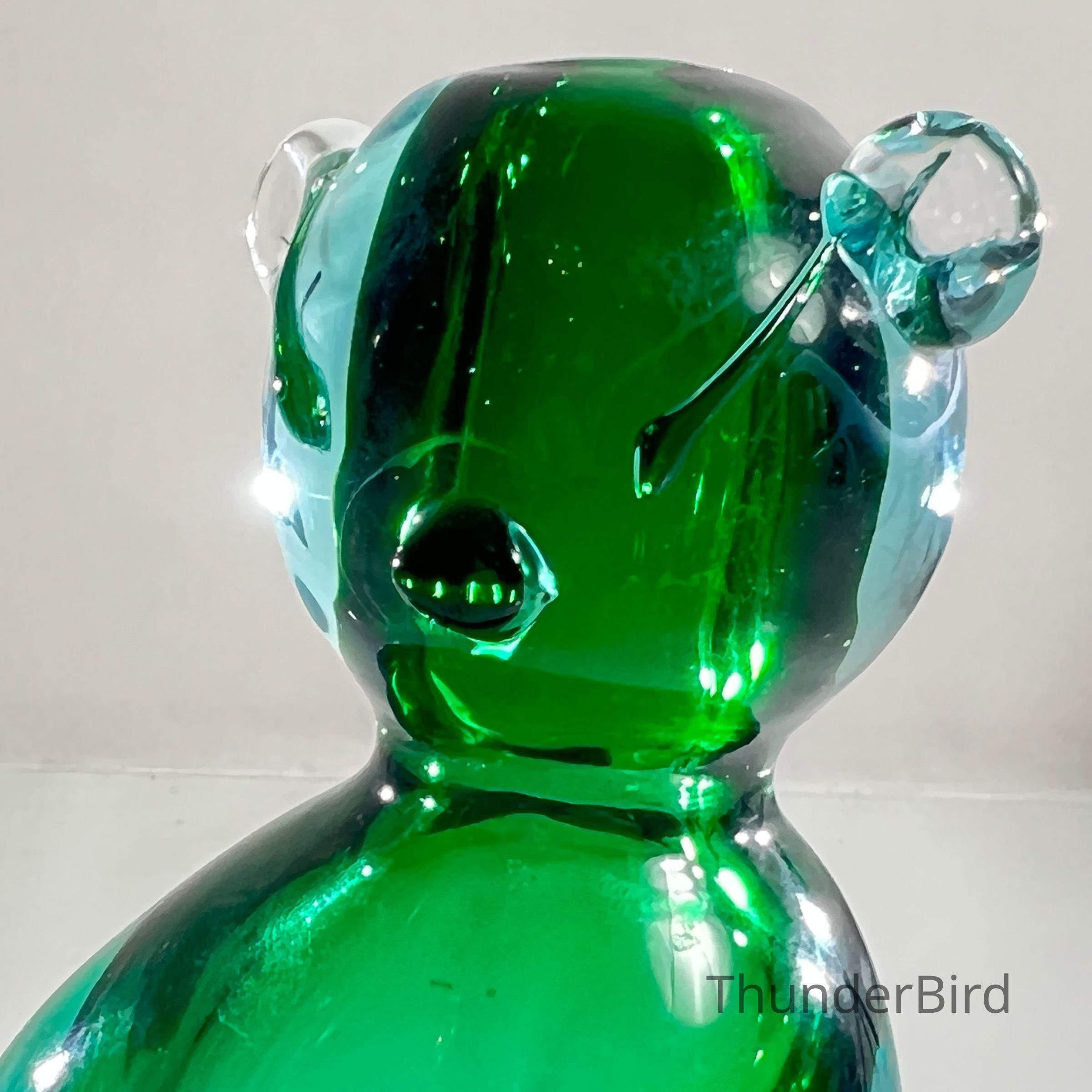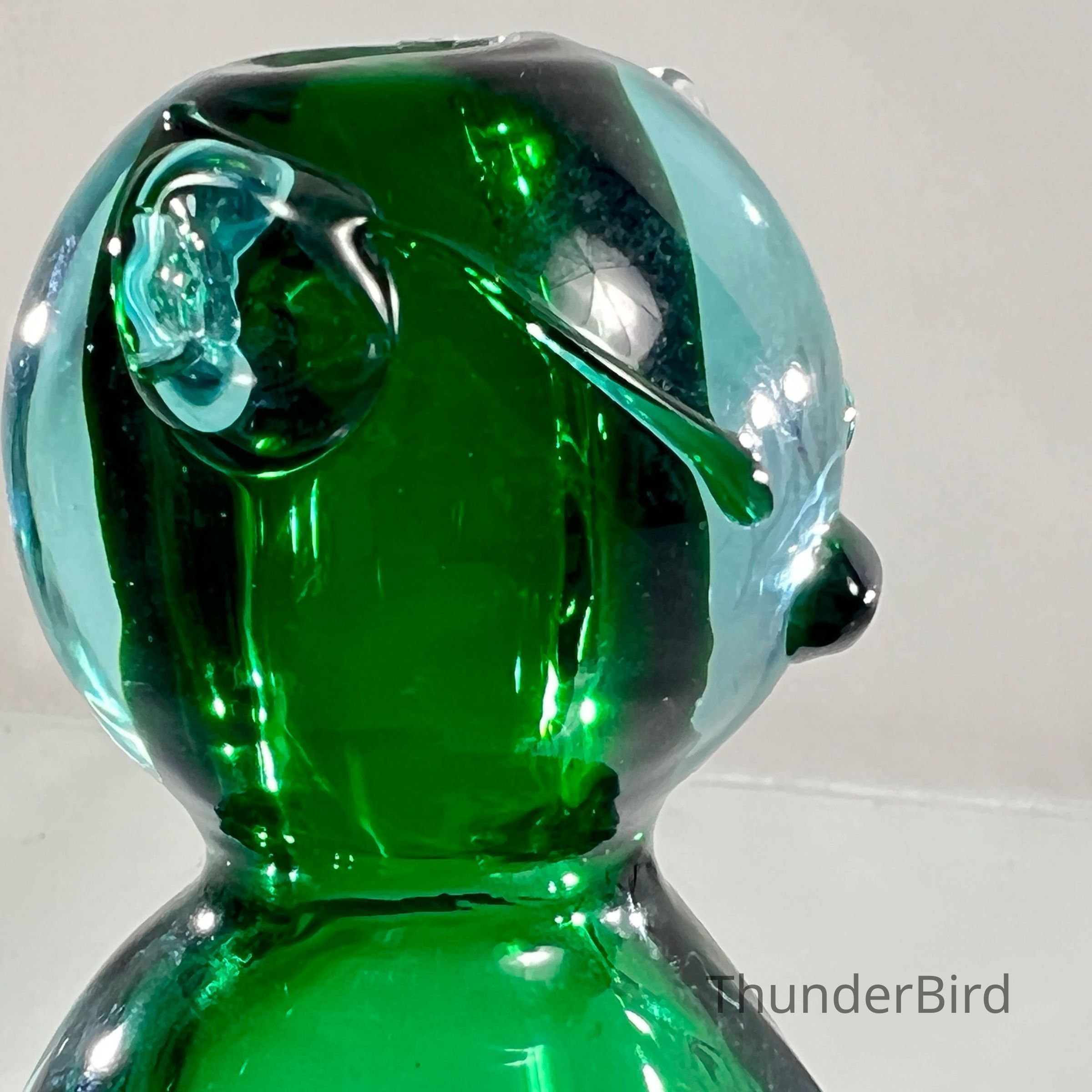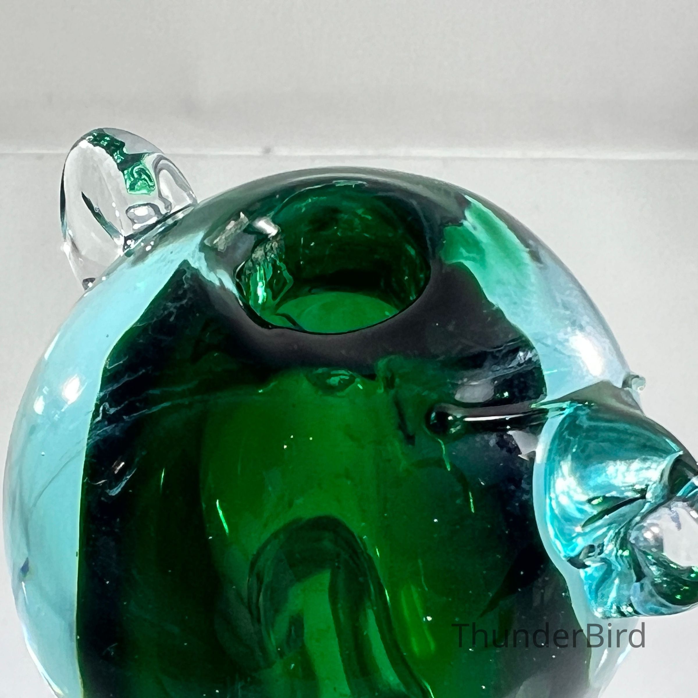 This sculptural piece is crafted in the Sommerso technique, layering emerald green and clear glass to create rich visual depth. The form features stylised facial detailing, curled tail, and expressive ears — all executed with the precision expected of Seguso workshop glass.