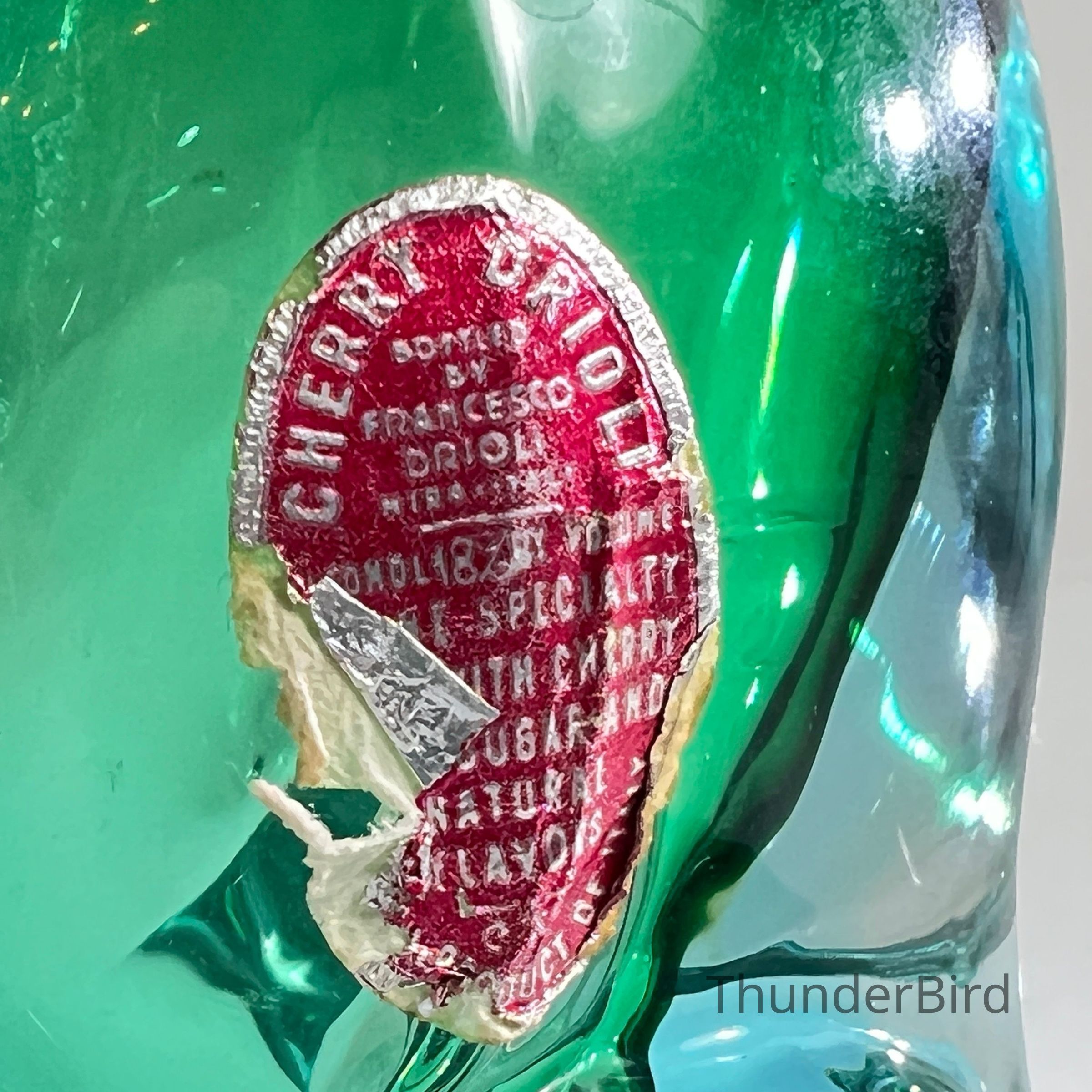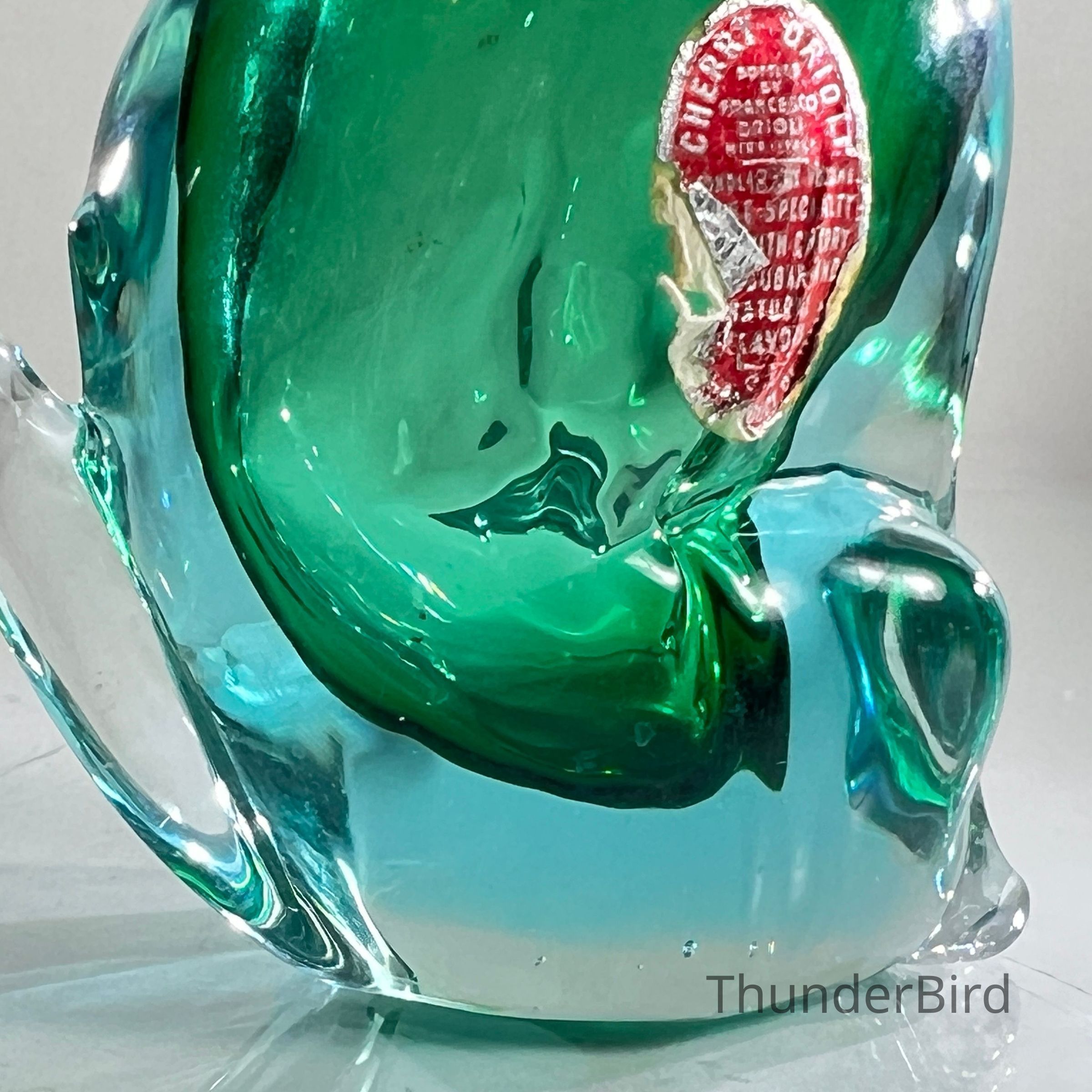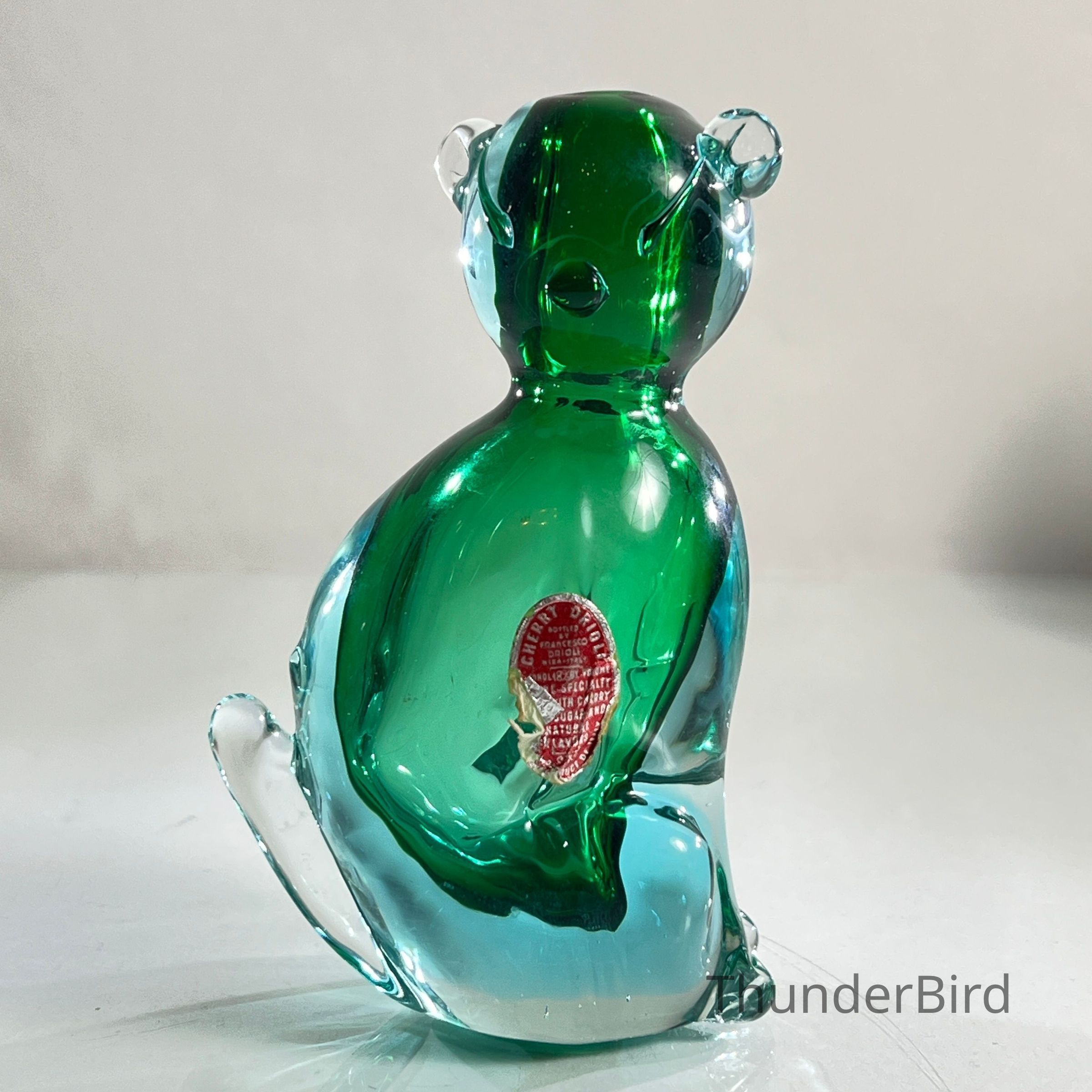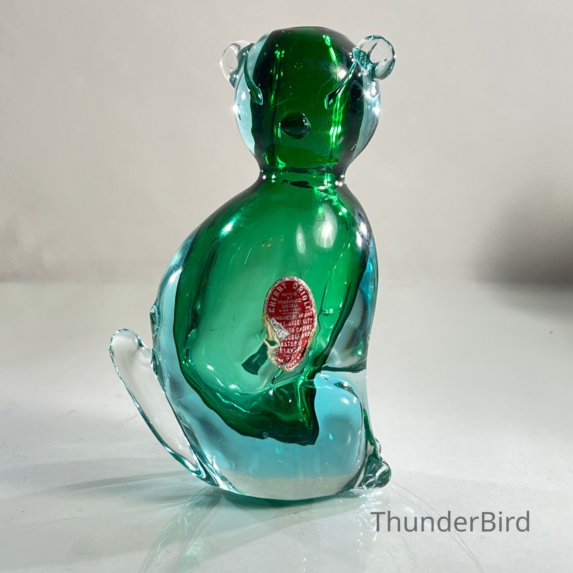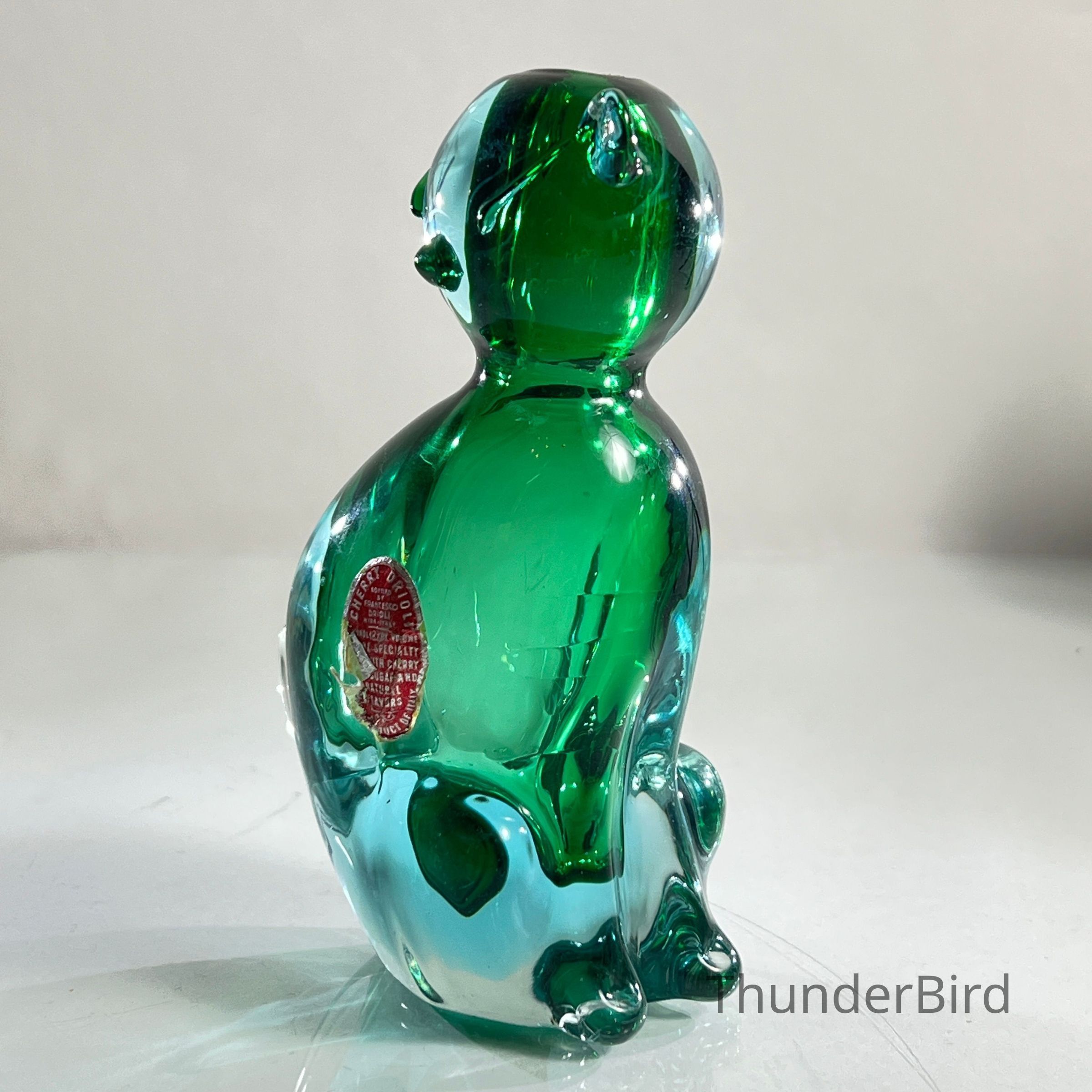 The original Drioli red foil label remains partially intact, verifying its use as a cherry brandy decanter. These novelty decanters were popular promotional exports and are now prized by collectors of both vintage Murano glass and liquoriana.