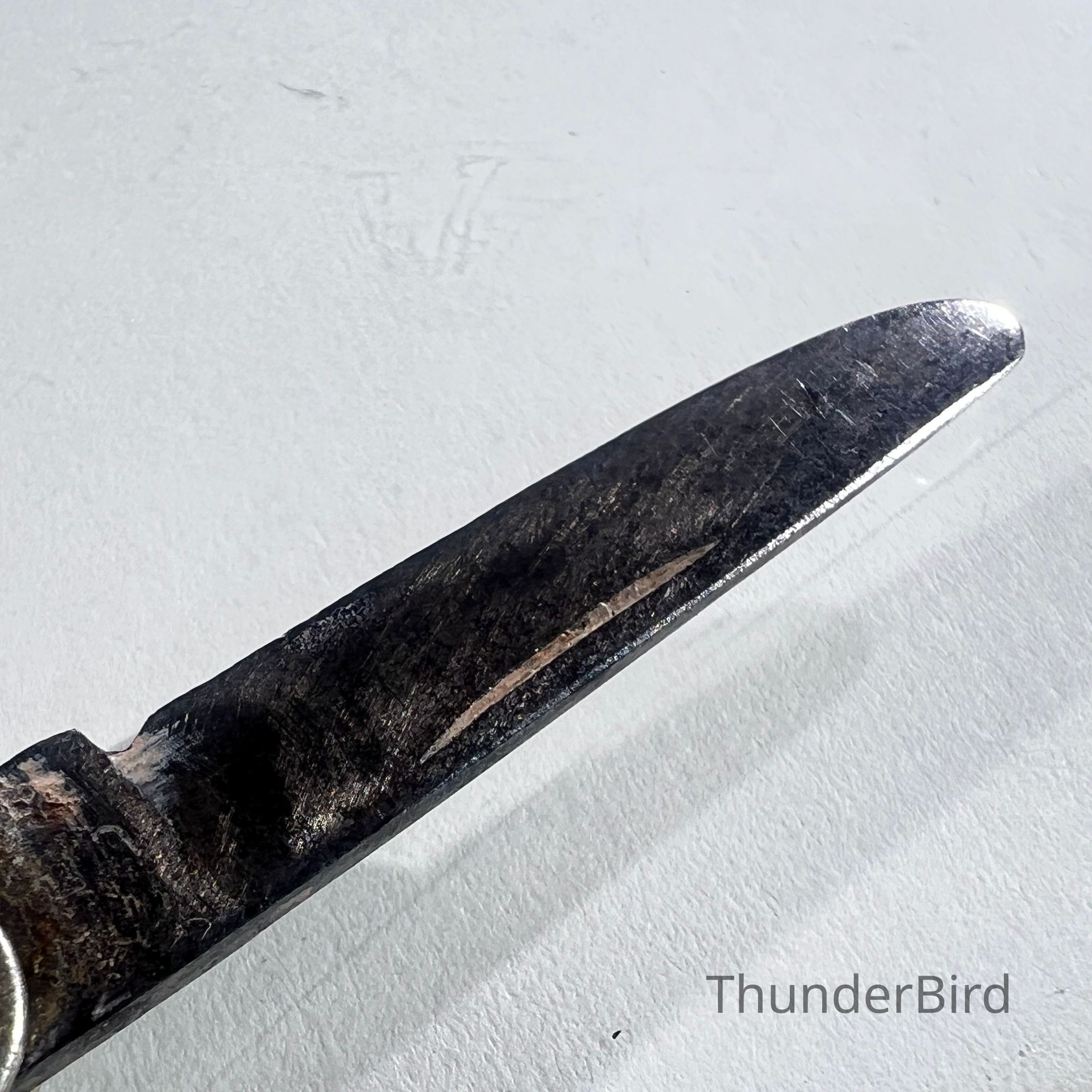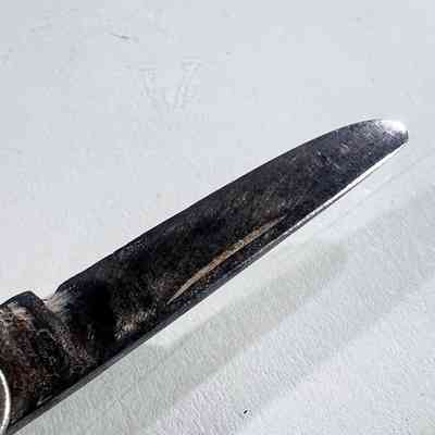 Overall aged condition consistent with age and use. Noticeable surface wear, tarnishing and rust to the blades. Handle shows scratches and general wear. Blades open and close, though movement is firm. Sold as found.