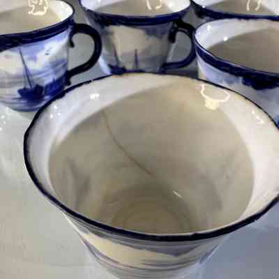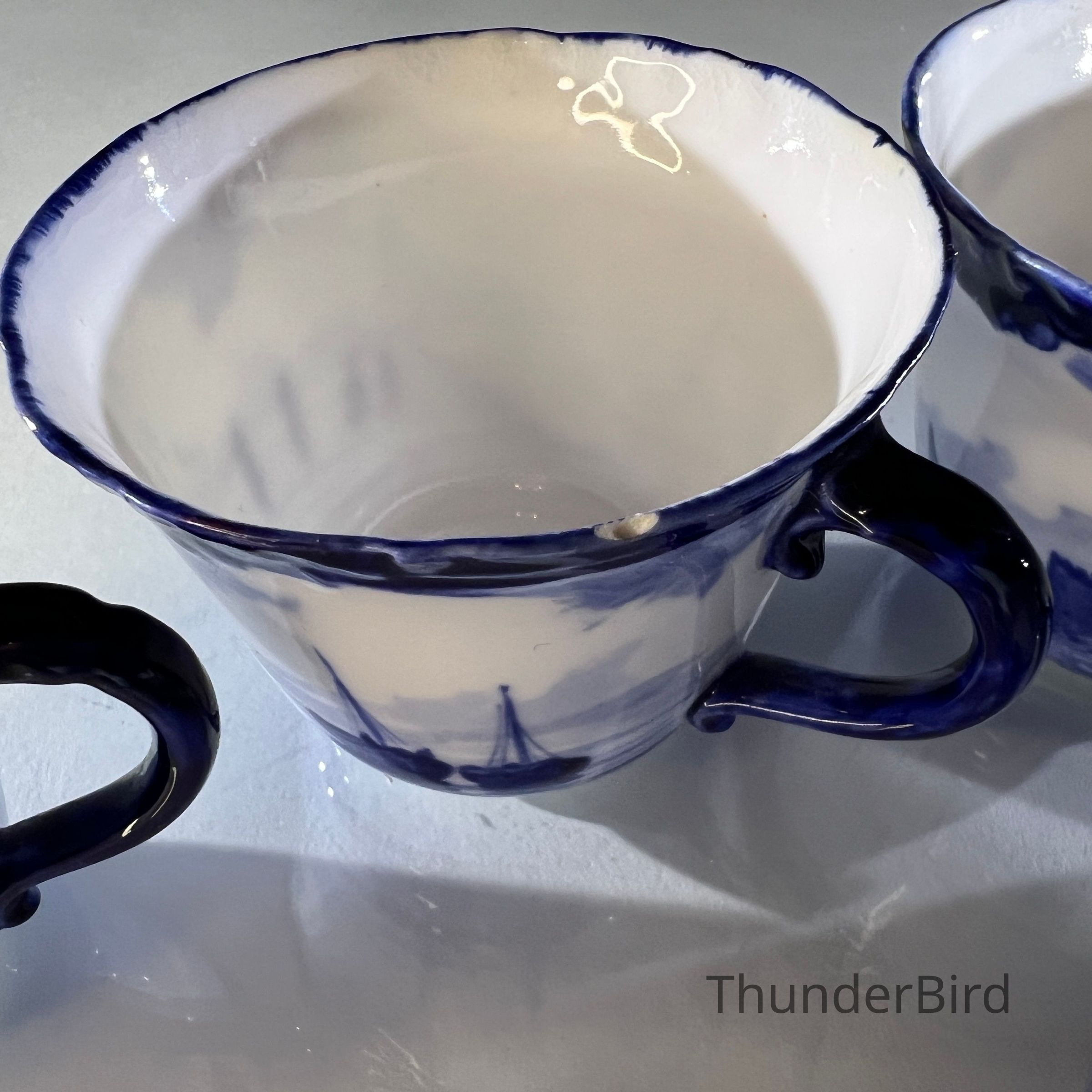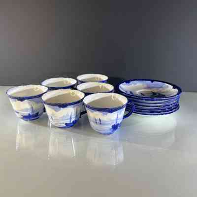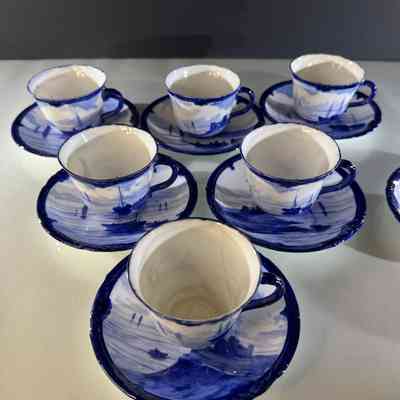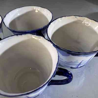 One cup has a small rim chip approximately 3 mm. One cup has a hairline crack from the rim measuring approximately 4 cm. All other pieces present well with age appropriate wear, light base marks and minor crazing consistent with antique porcelain. Please inspect photos carefully.