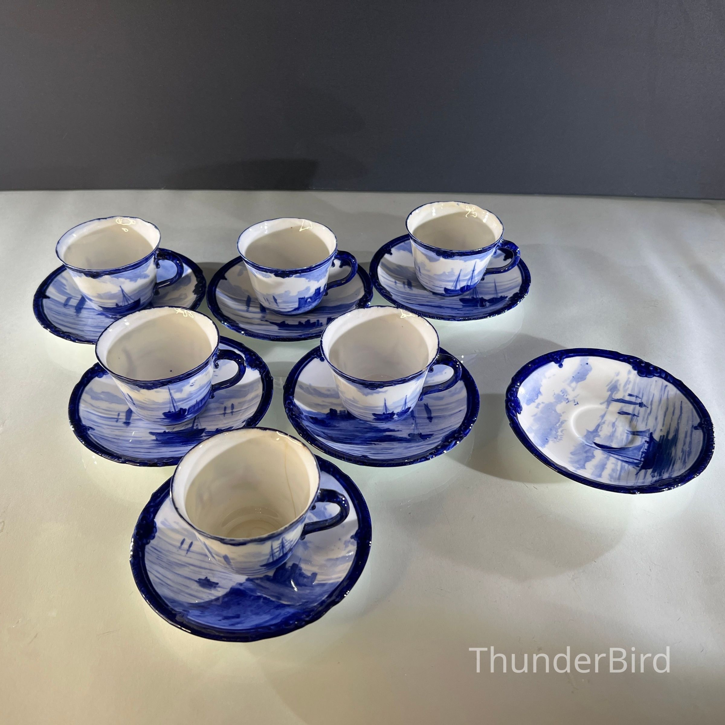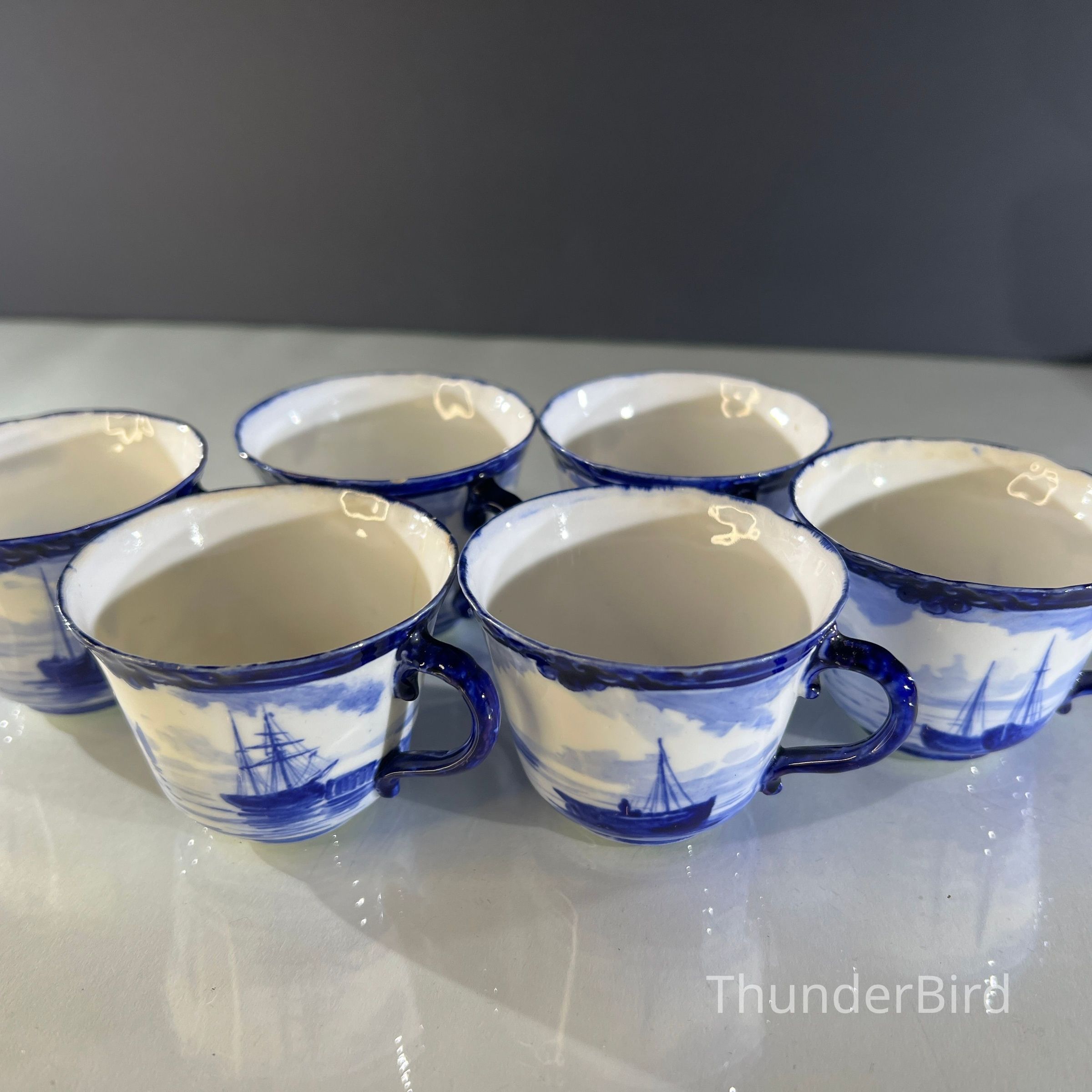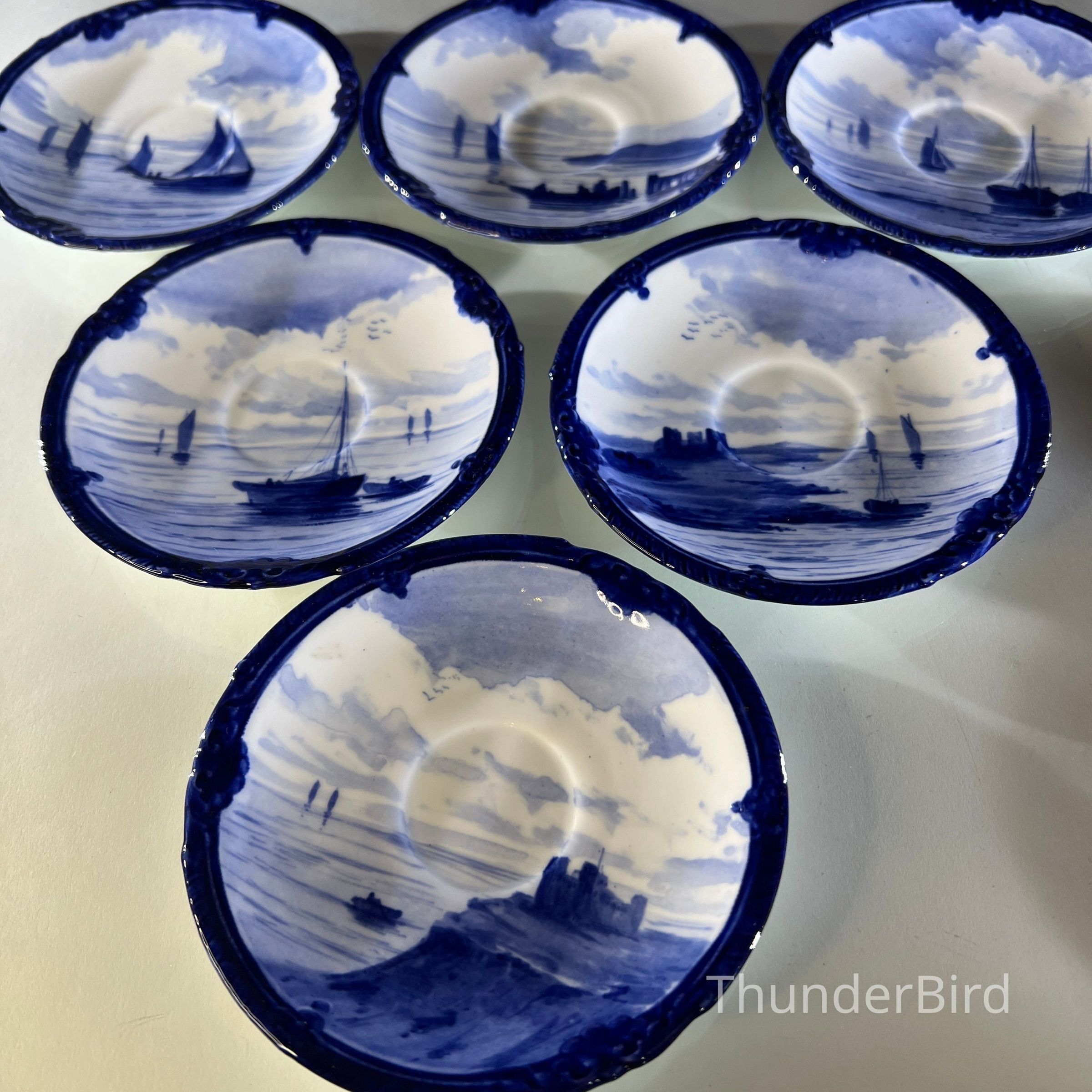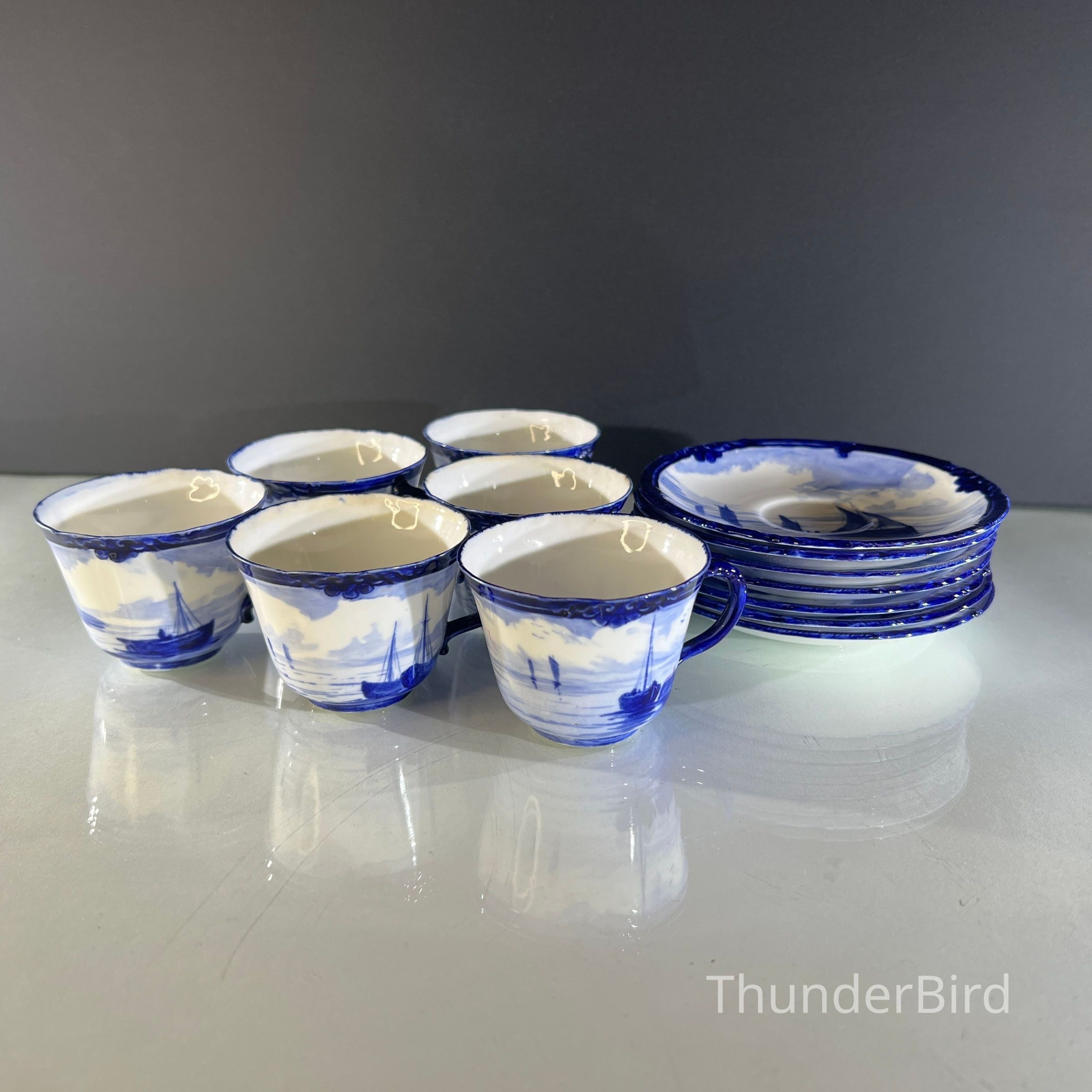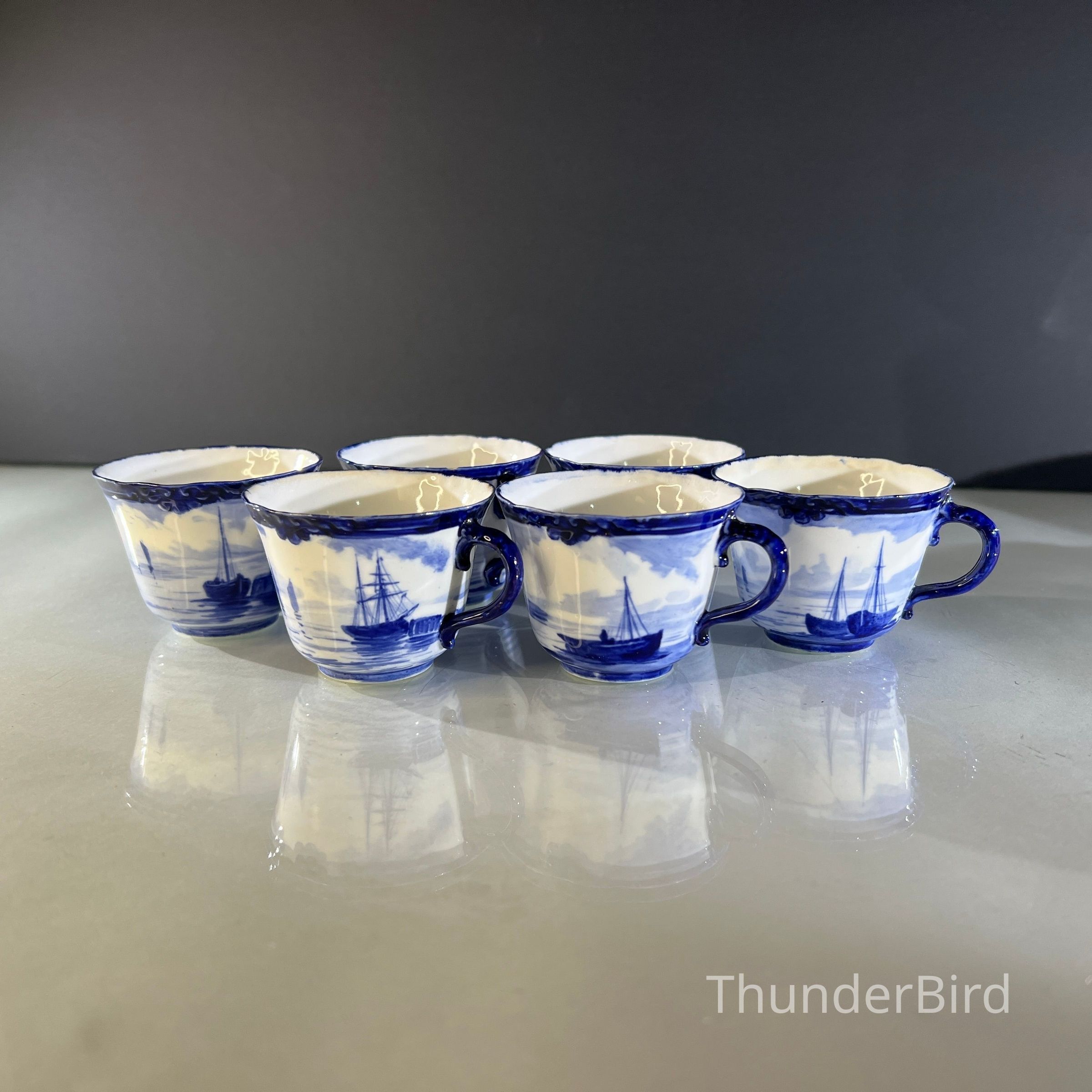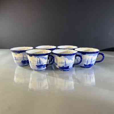 A rare Royal Crown Derby porcelain tea set dated 1908, featuring beautifully hand painted cobalt blue marine scenes. Each cup and saucer is individually decorated, depicting sailing vessels, calm coastal waters and distant fortifications, with no two scenes alike. The finely detailed sails and rigging reflect the technical precision associated with Derby marine painter W.E.J. Dean. Each piece bears the Royal Crown Derby green crown backstamp with the 1908 date cipher beneath the cypher, confirming Edwardian production.