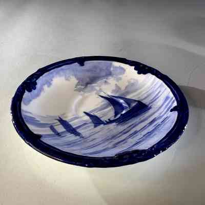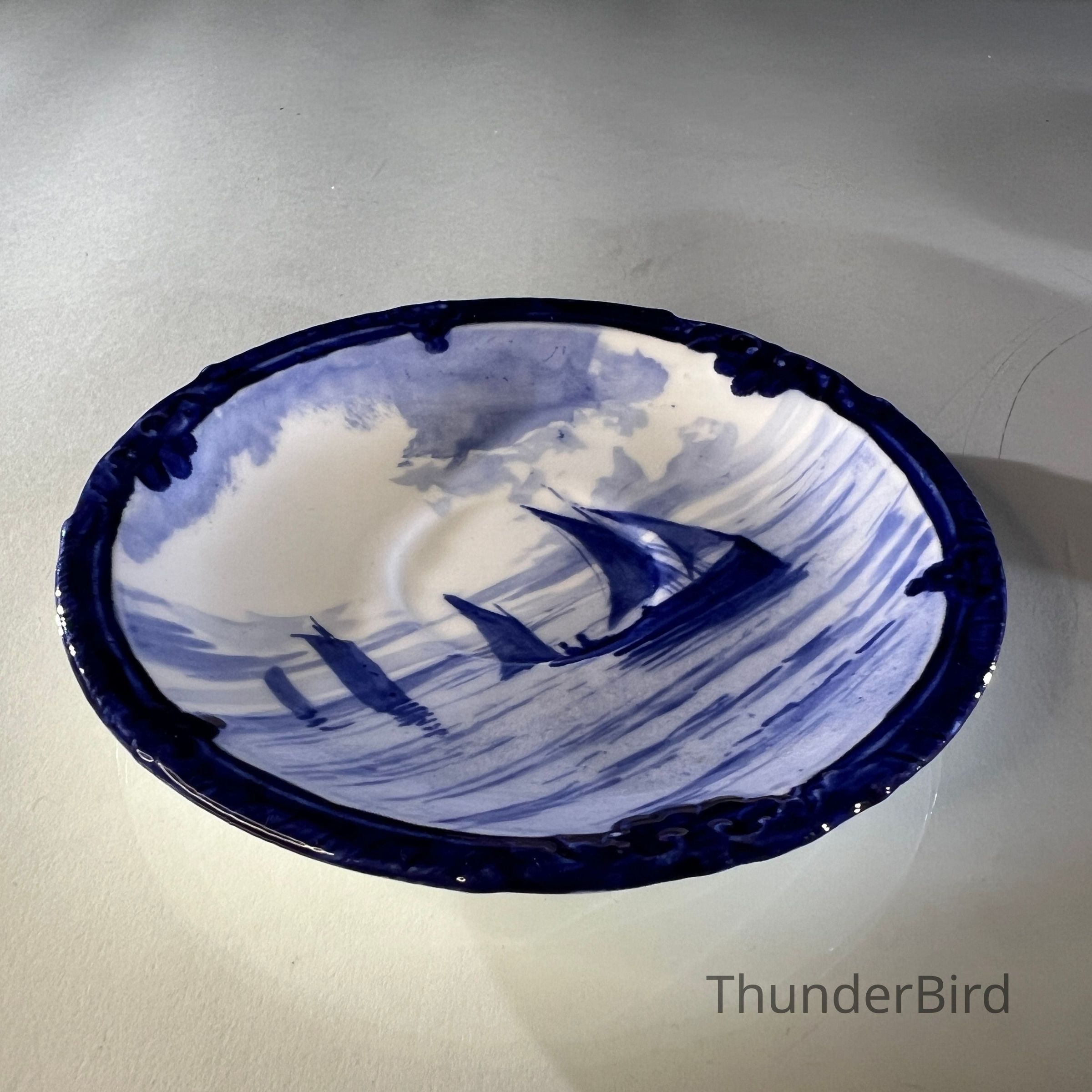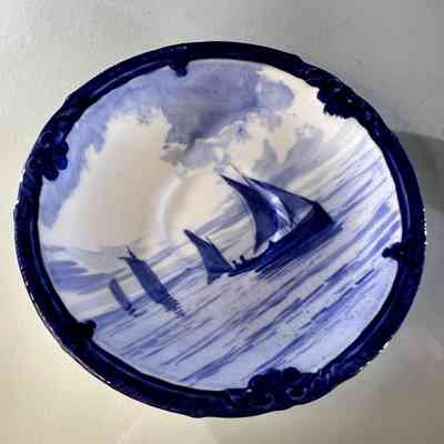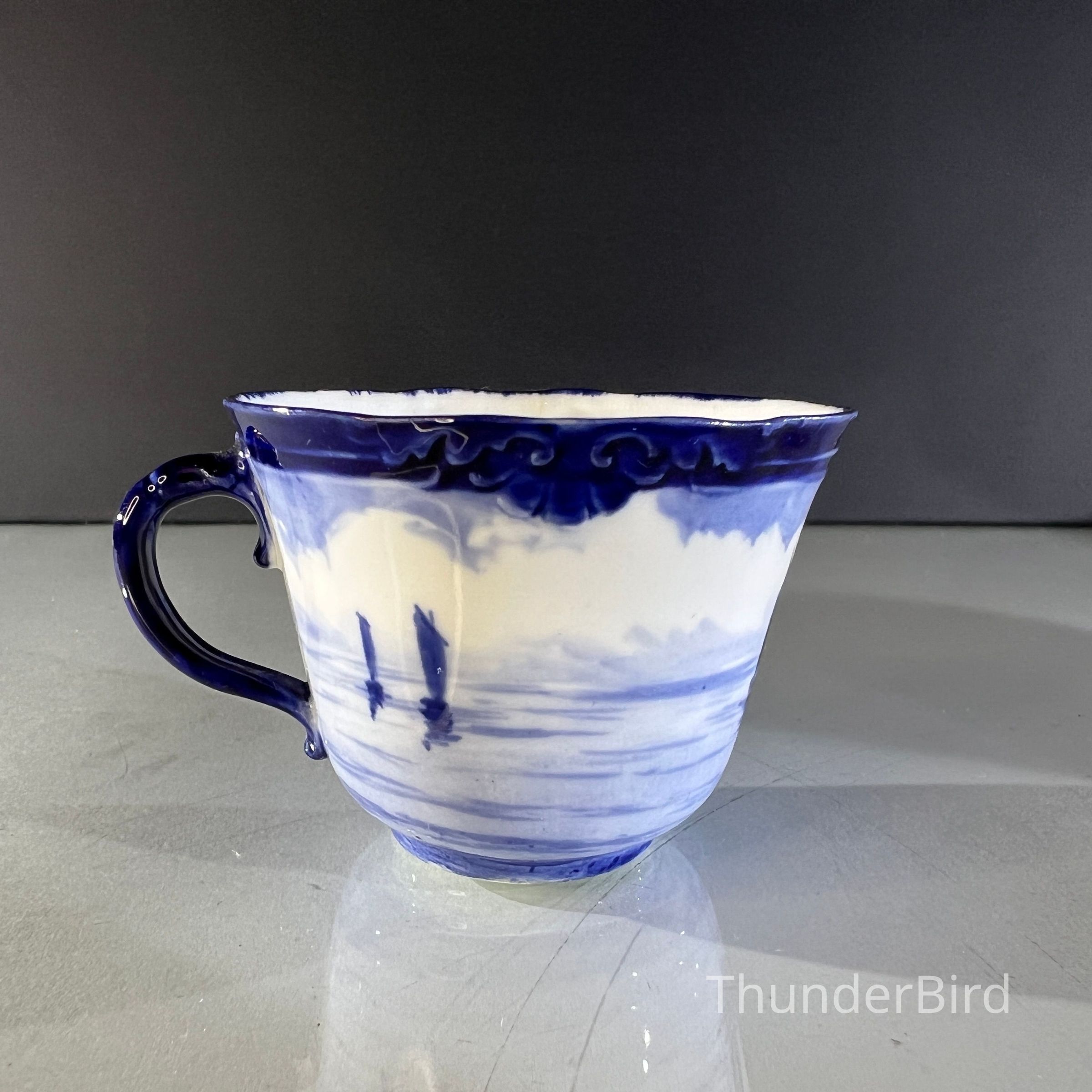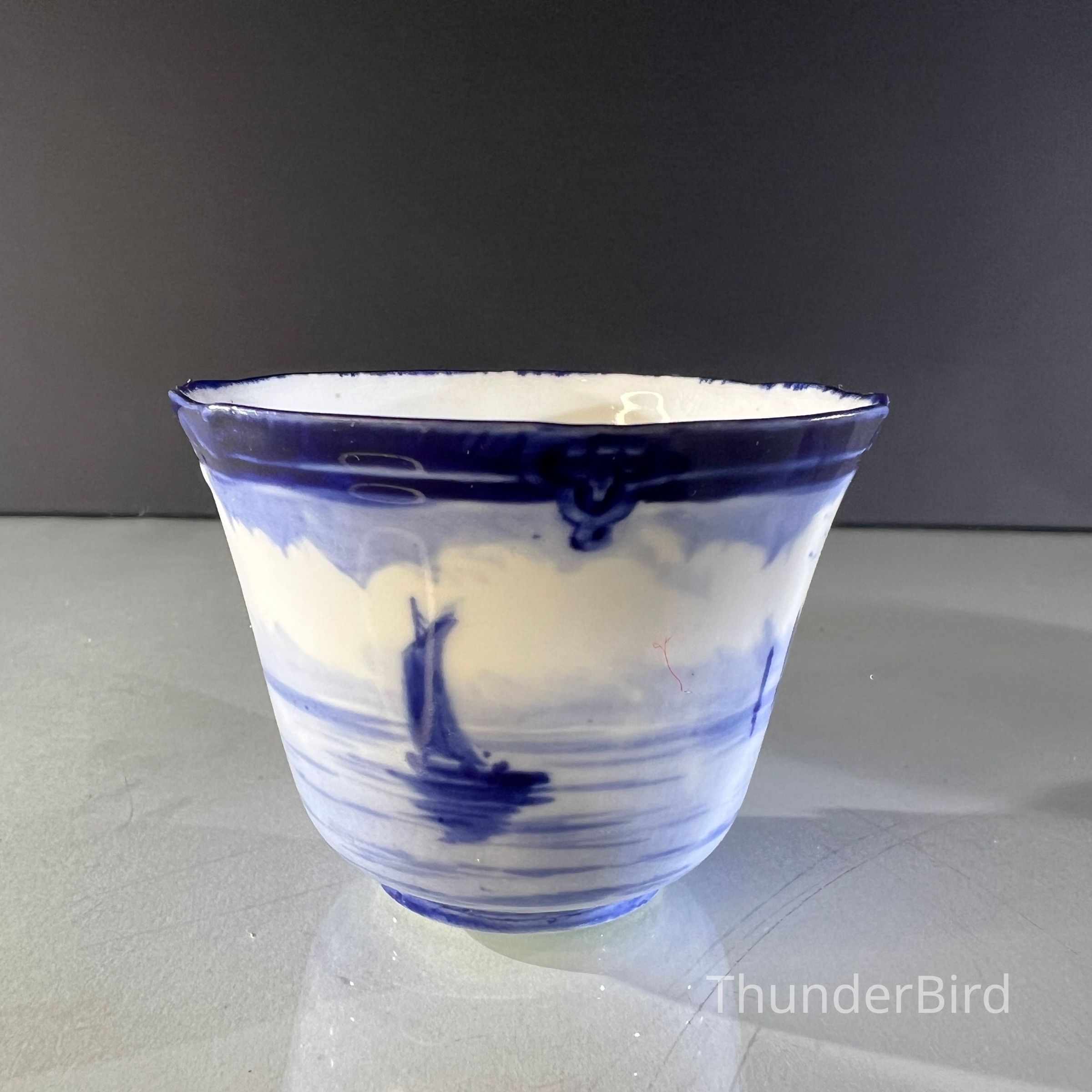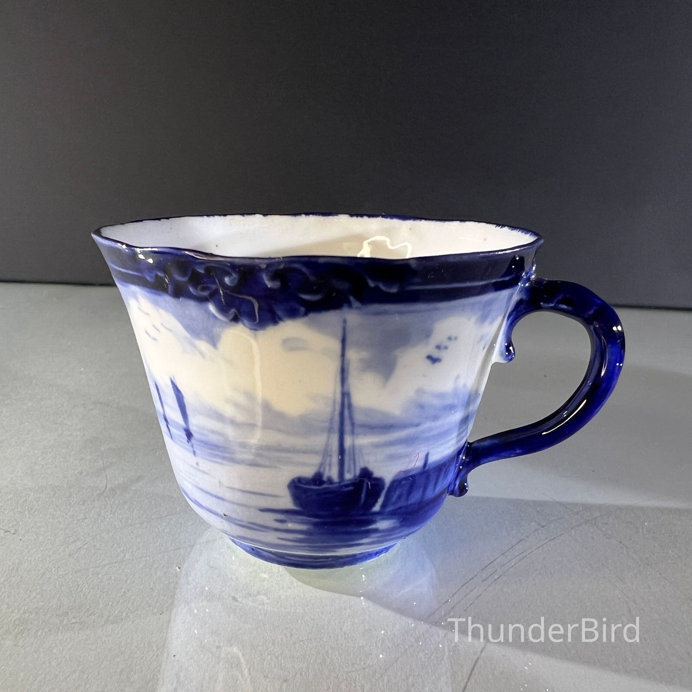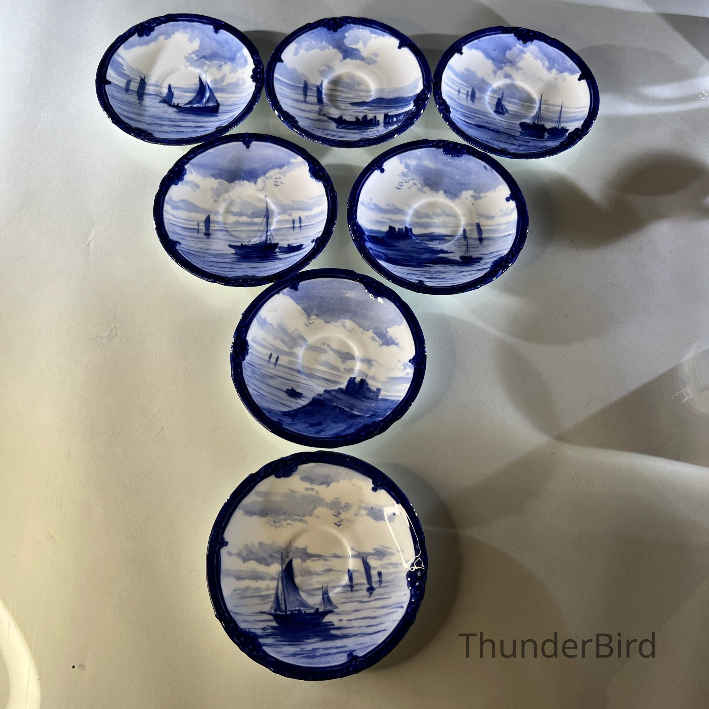 A rare Royal Crown Derby porcelain tea set dated 1908, featuring beautifully hand painted cobalt blue marine scenes. Each cup and saucer is individually decorated, depicting sailing vessels, calm coastal waters and distant fortifications, with no two scenes alike. The finely detailed sails and rigging reflect the technical precision associated with Derby marine painter W.E.J. Dean. Each piece bears the Royal Crown Derby green crown backstamp with the 1908 date cipher beneath the cypher, confirming Edwardian production.