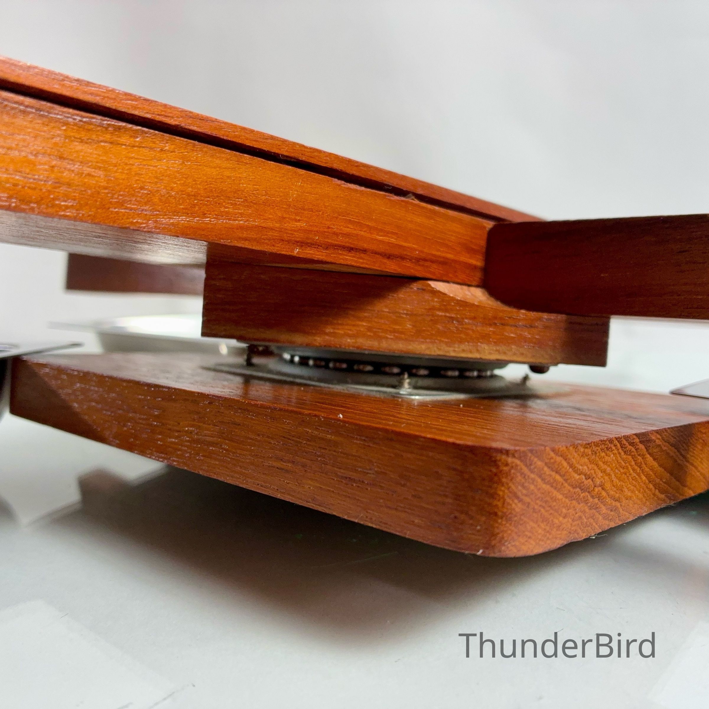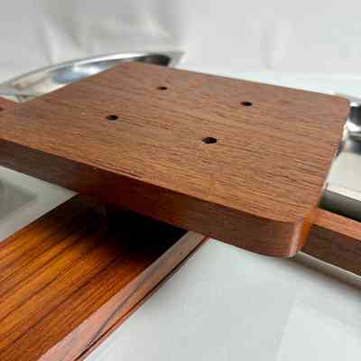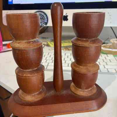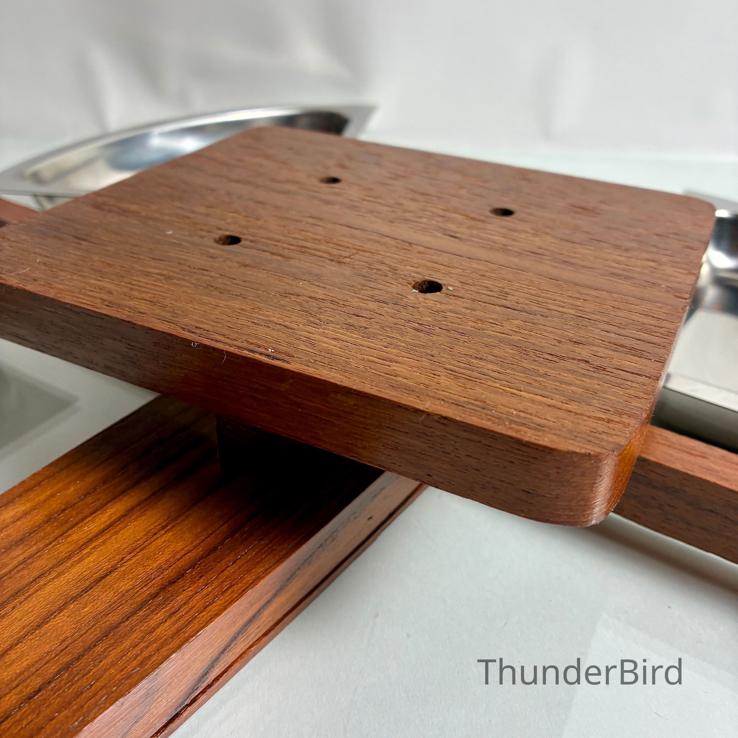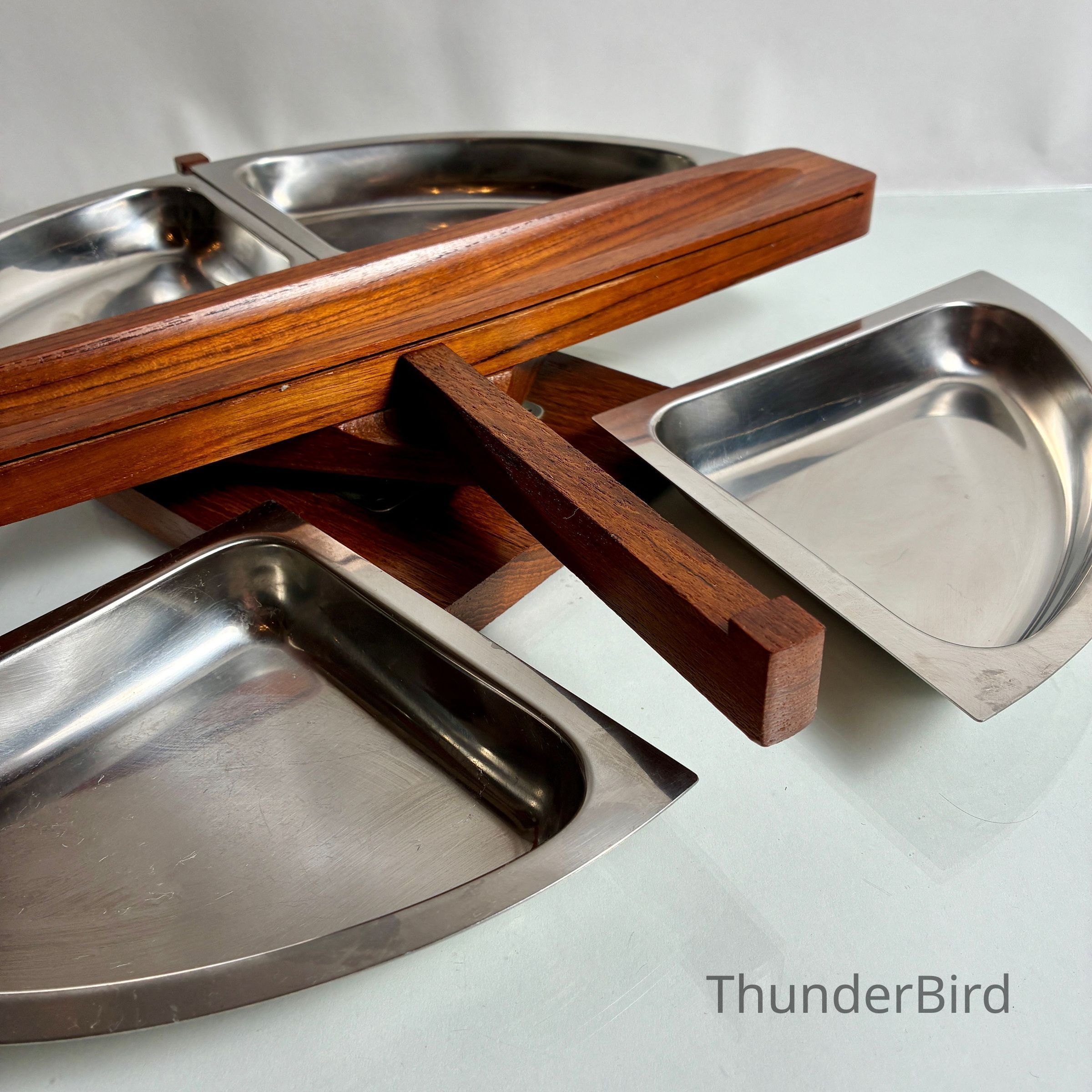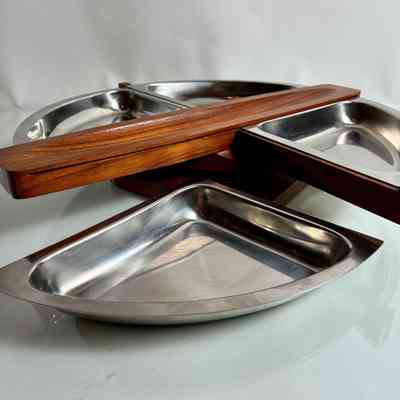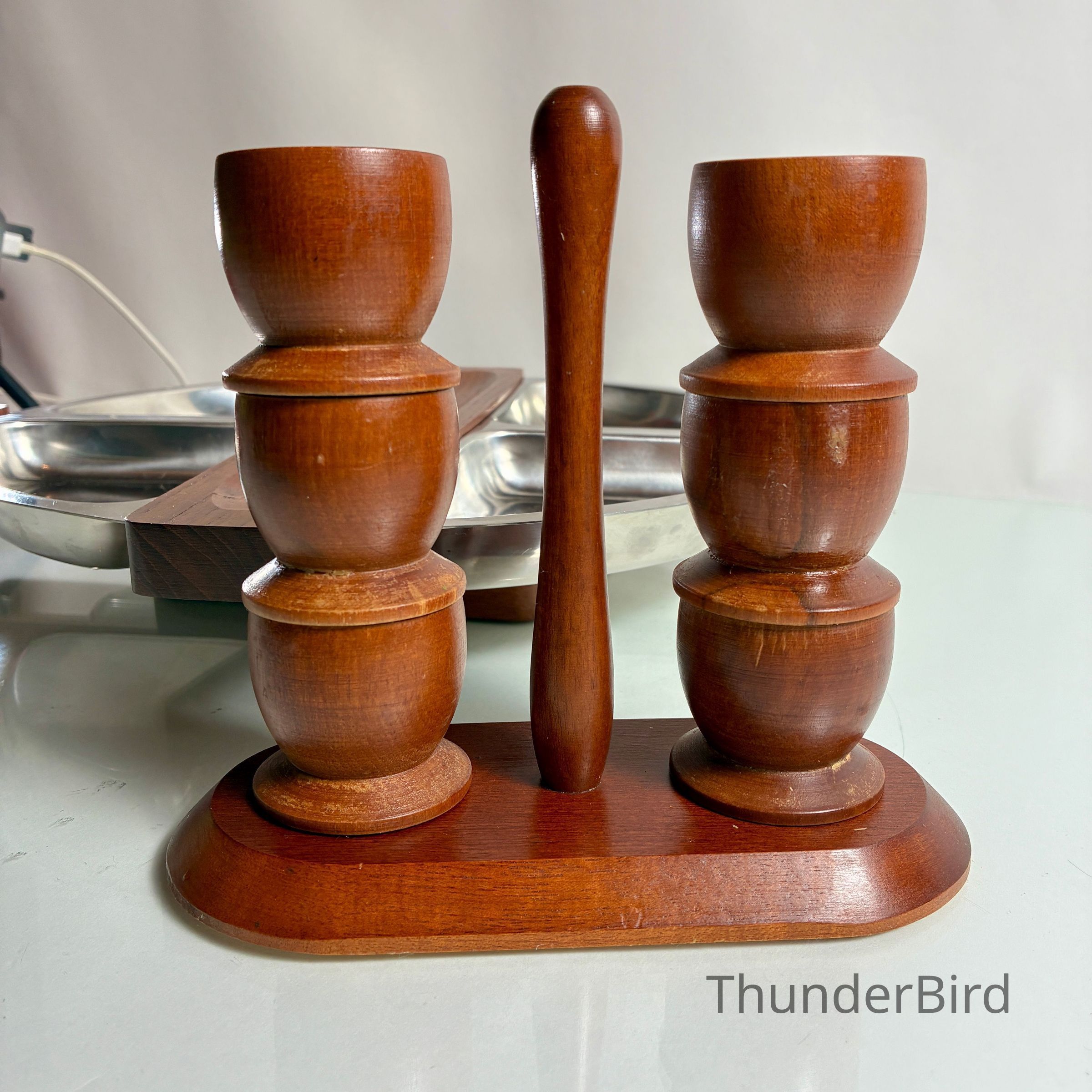 Very good vintage condition overall. The stainless trays show minor surface scuffs consistent with age and use. Teak wood is well-preserved with rich grain and no structural faults. Rotation mechanism is smooth. Egg cups are complete and stack securely.
