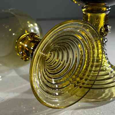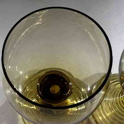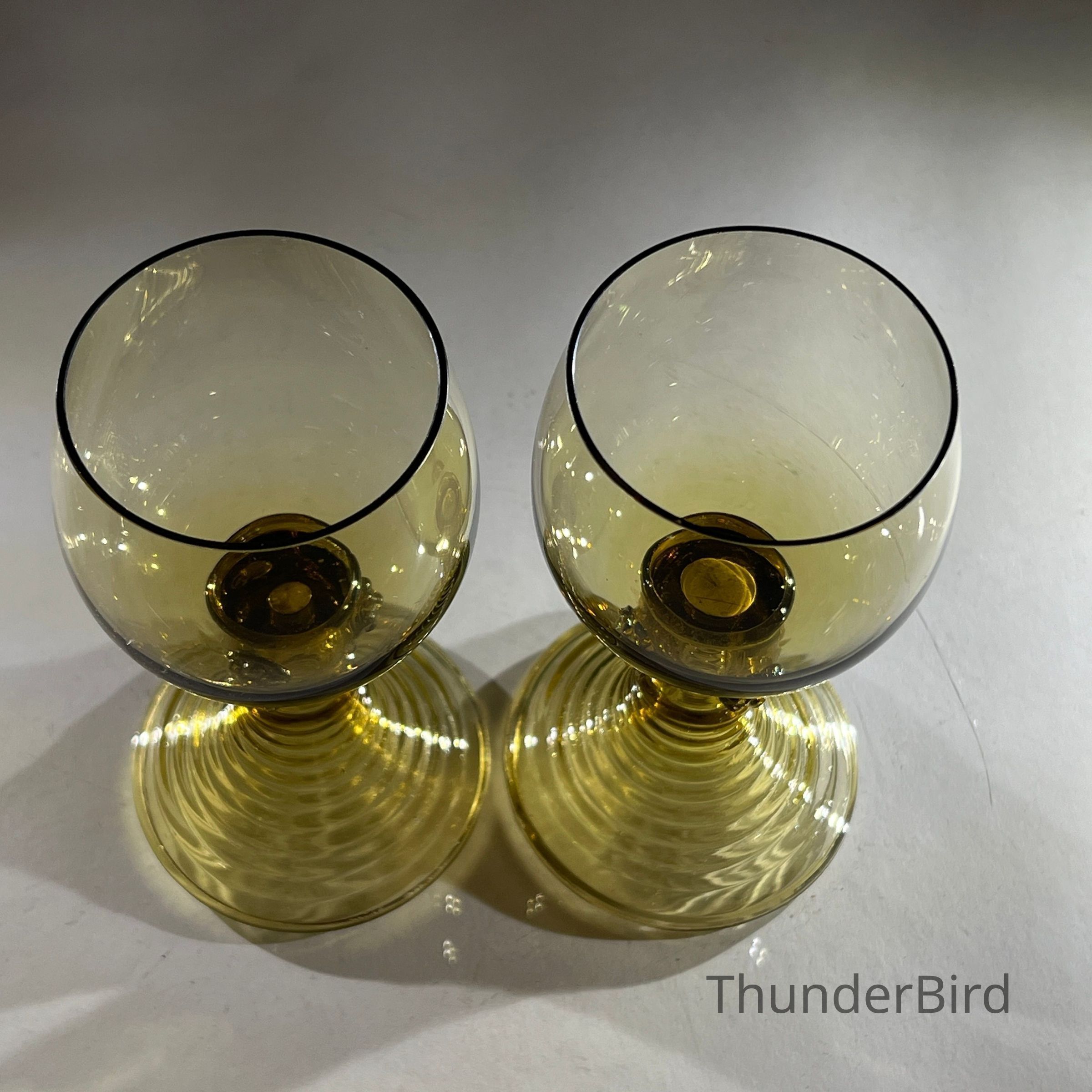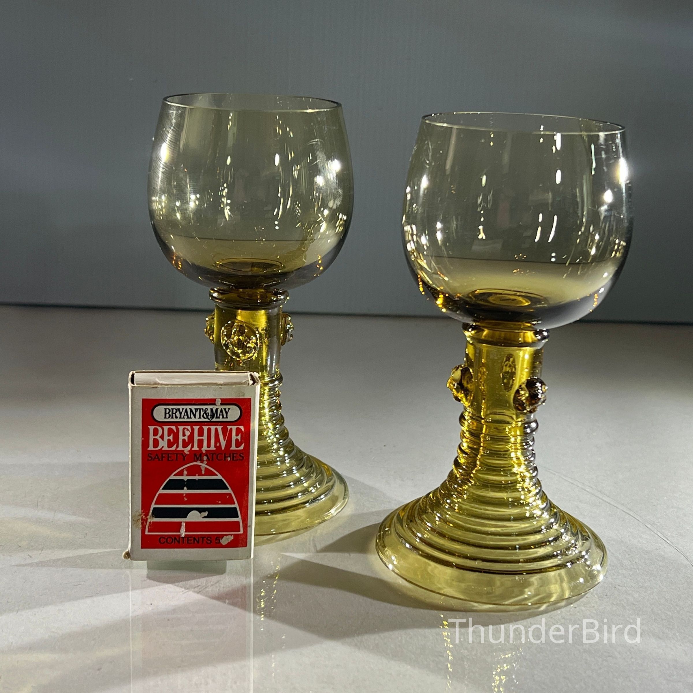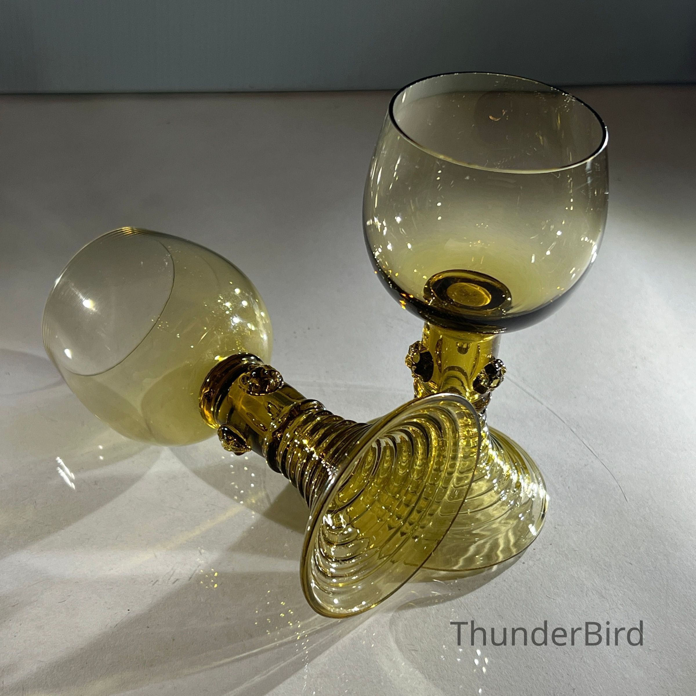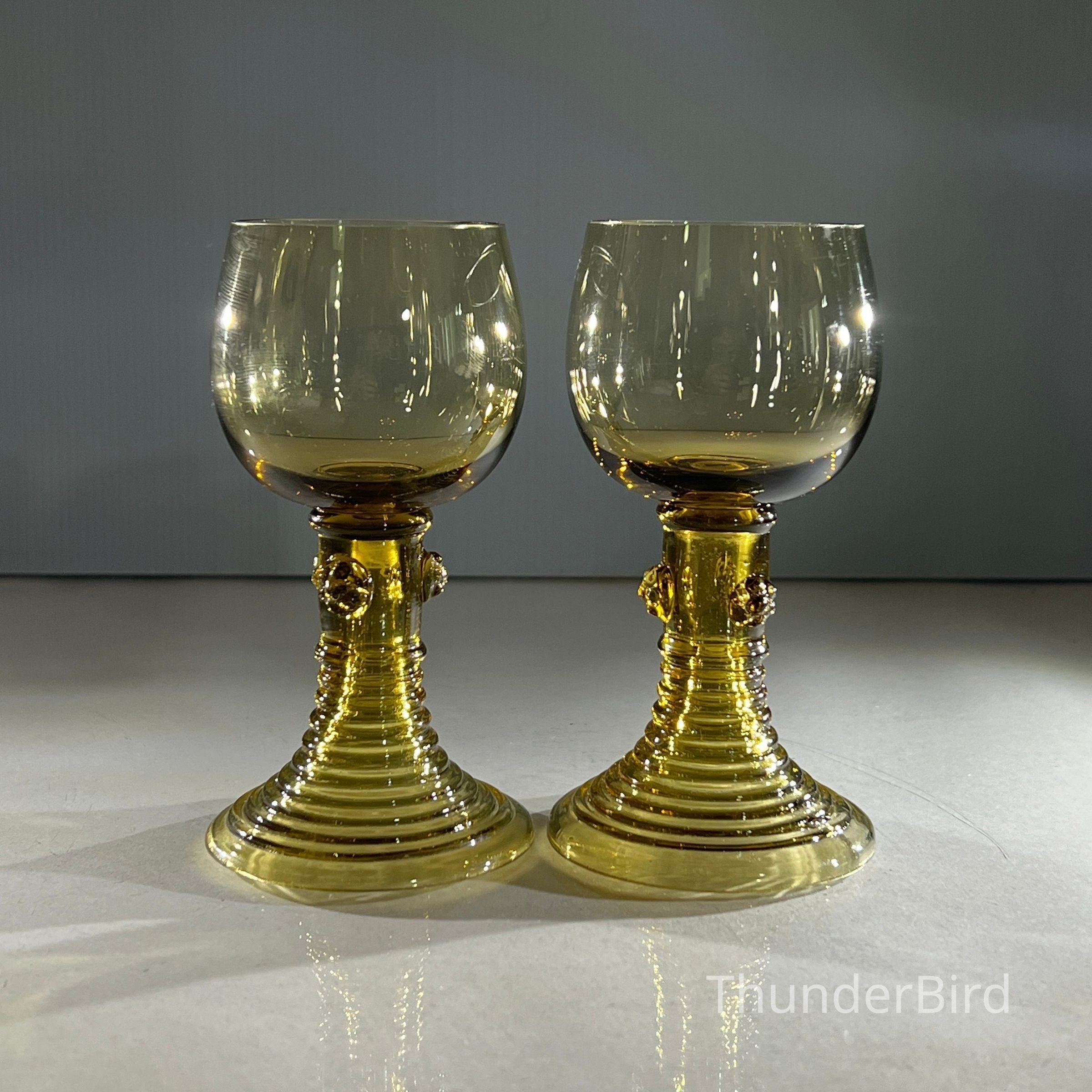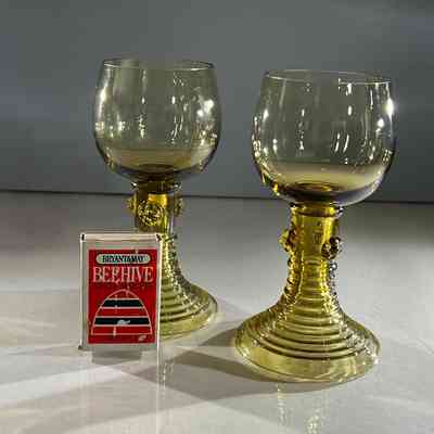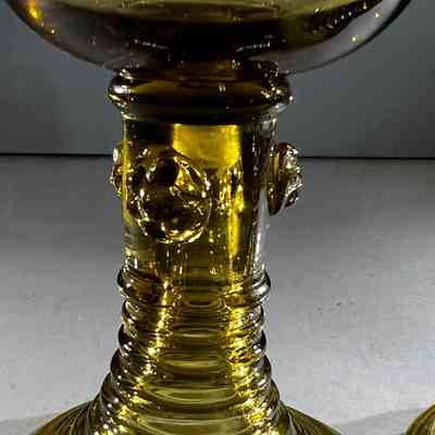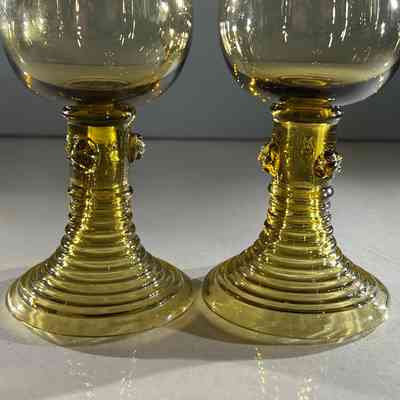 These two hand-blown wine goblets are crafted in the traditional Römer style, a form produced in German and Dutch glassmaking regions since the seventeenth century. Each goblet features a rounded bowl, hollow tapered stem and applied prunts that offer both decoration and grip. The ribbed conical bases provide stability and highlight skilled workshop craftsmanship. Their warm amber tone and subtle variations in shape reflect authentic small-batch hand production.
