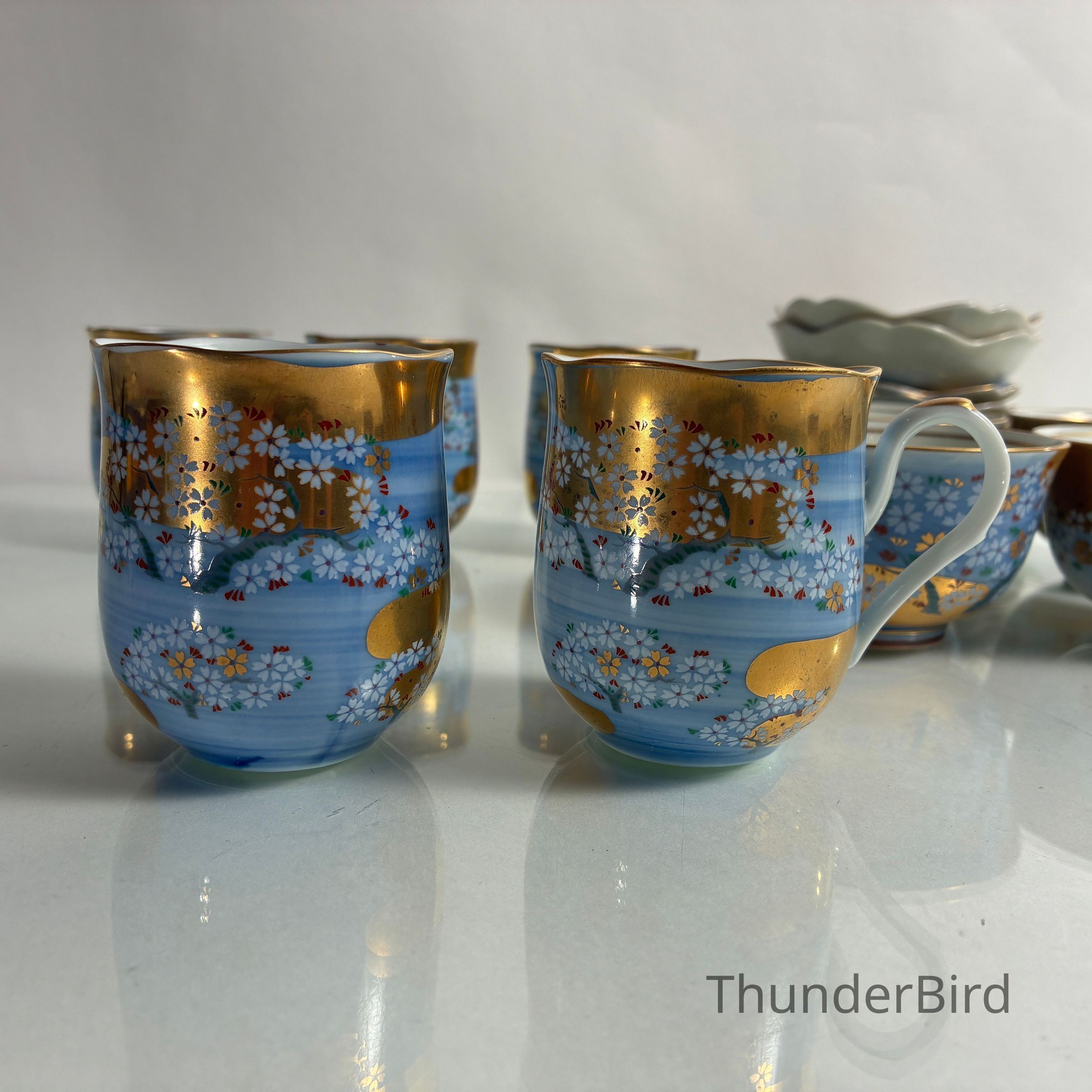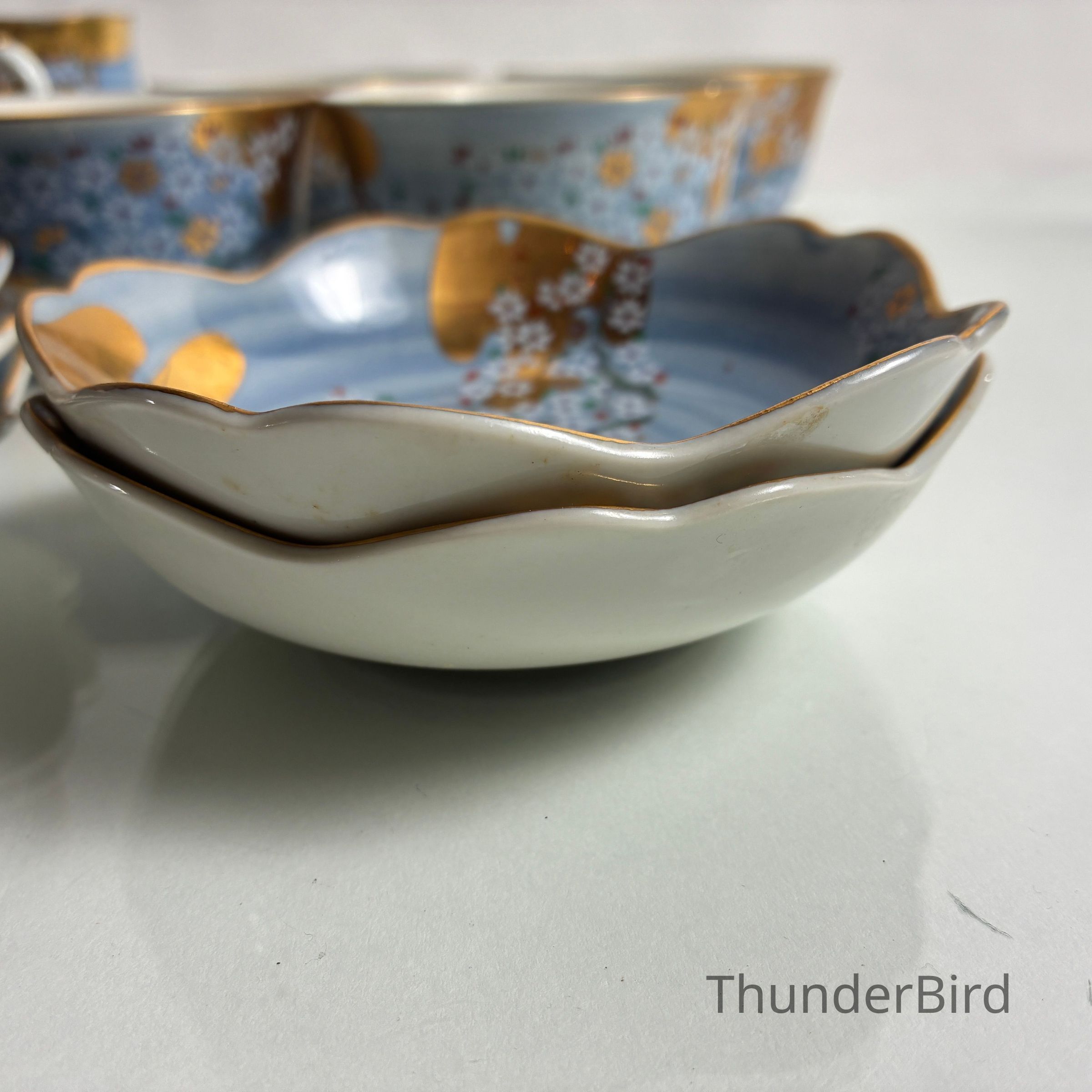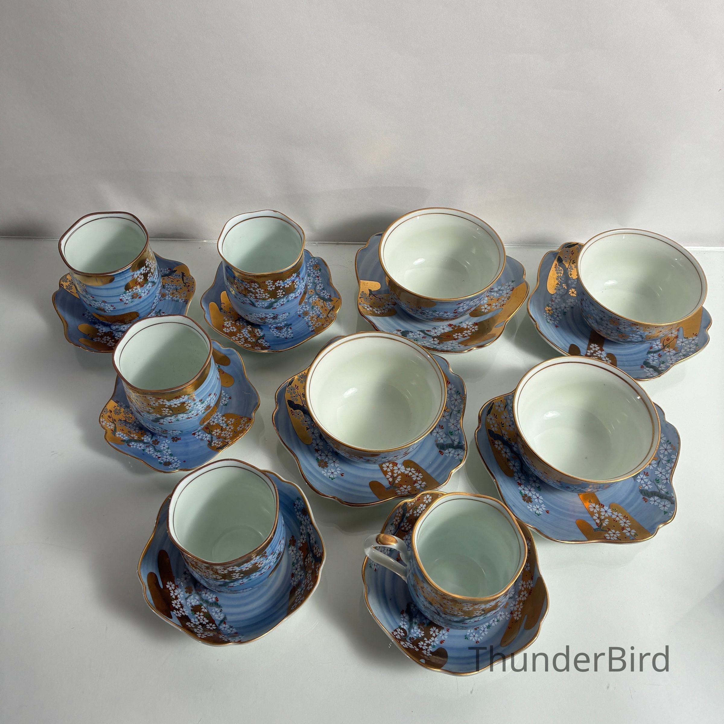 A beautifully hand-decorated vintage Japanese porcelain tea set, comprising 19 assorted pieces including cups, saucers, and small bowls. The set includes a mix of saucers, cups with and without handles, and dessert bowls, all with scalloped rims and variations in form that reflect artisanal production. The design is reminiscent of Kutani or Satsuma-inspired export ware, likely mid-20th century (c. 1950s–70s).