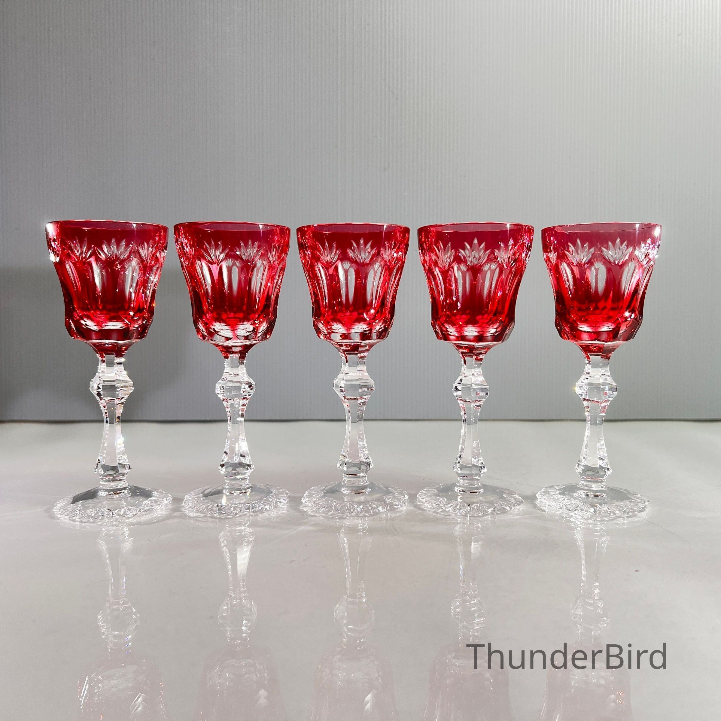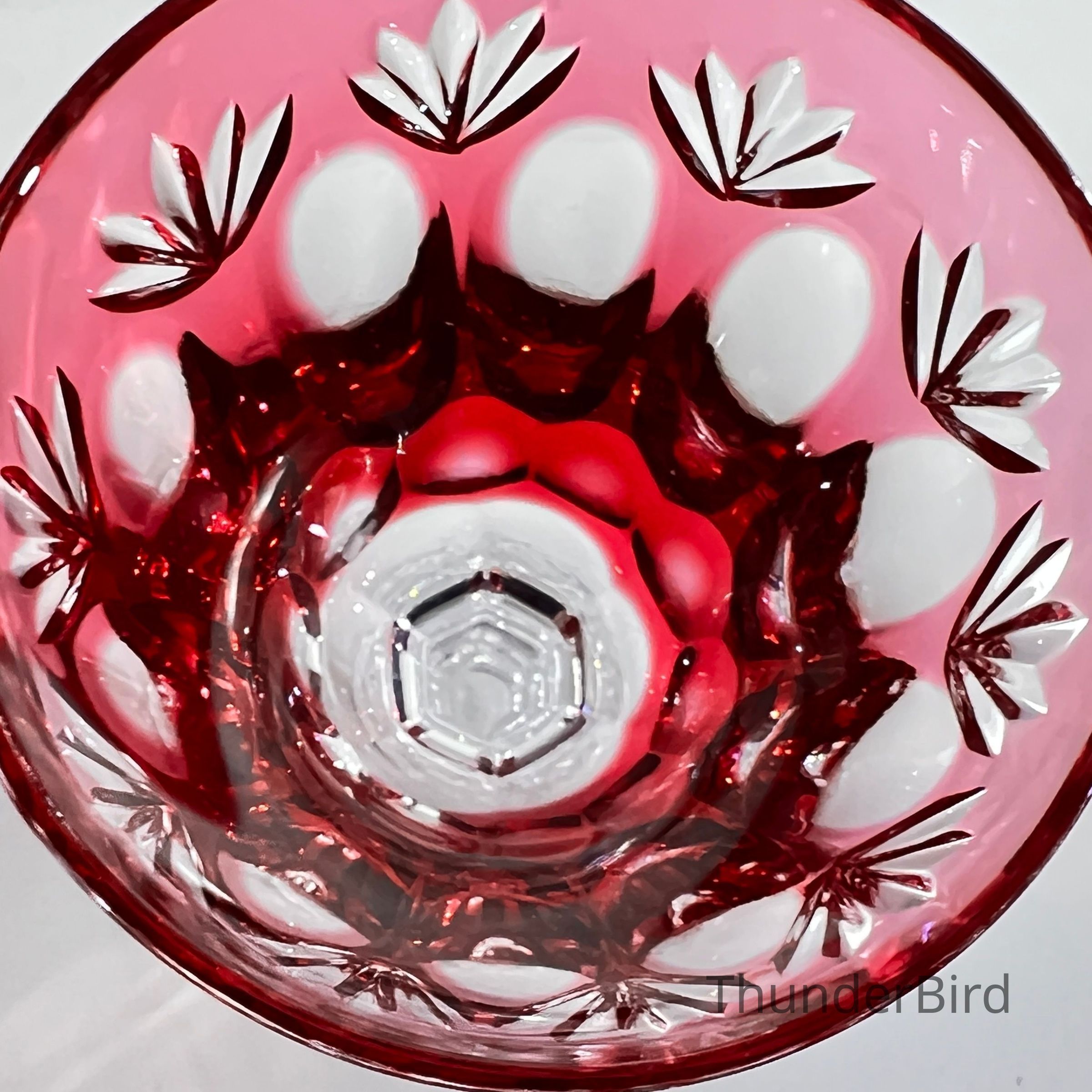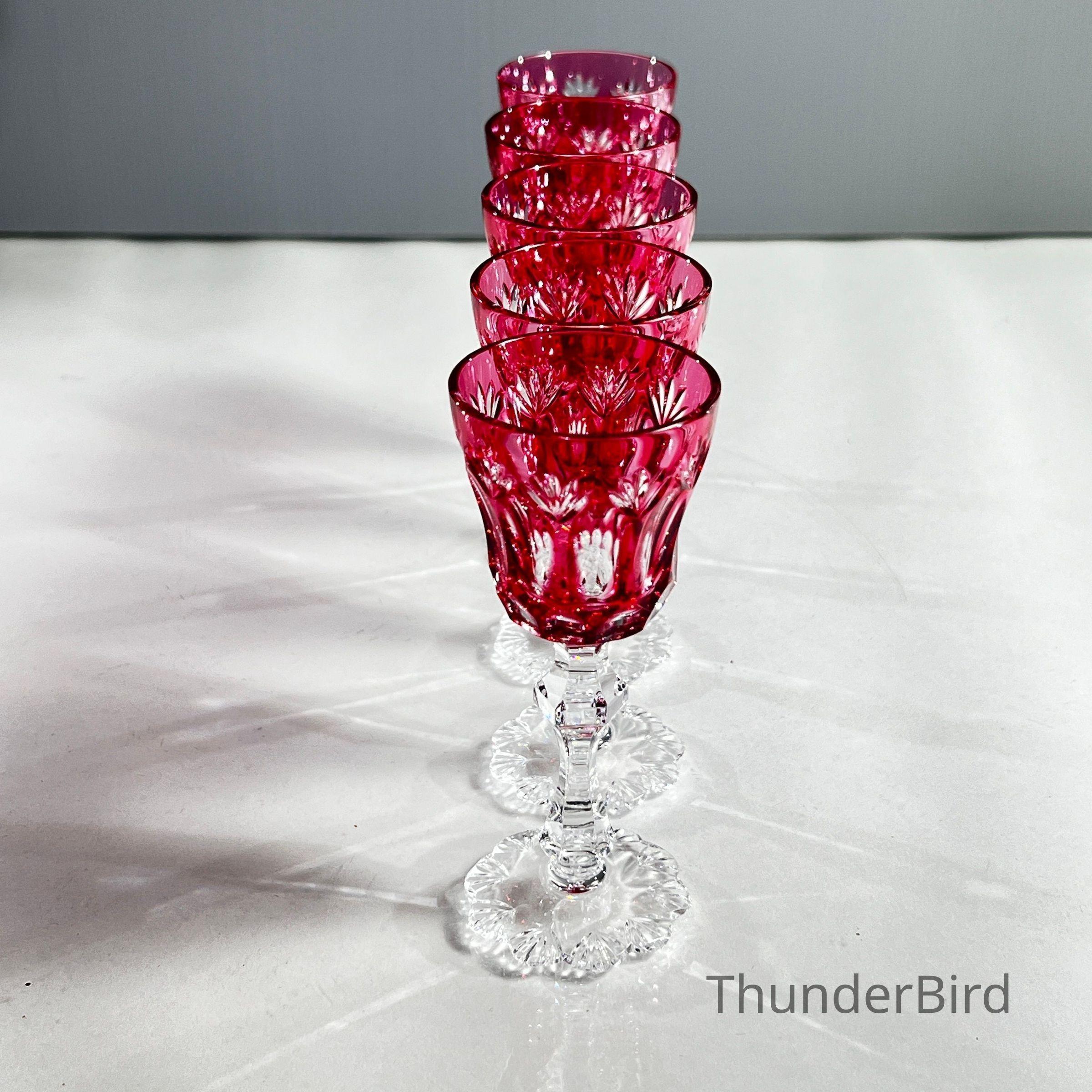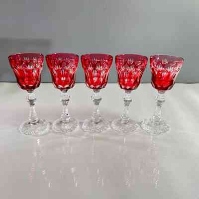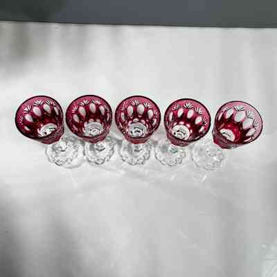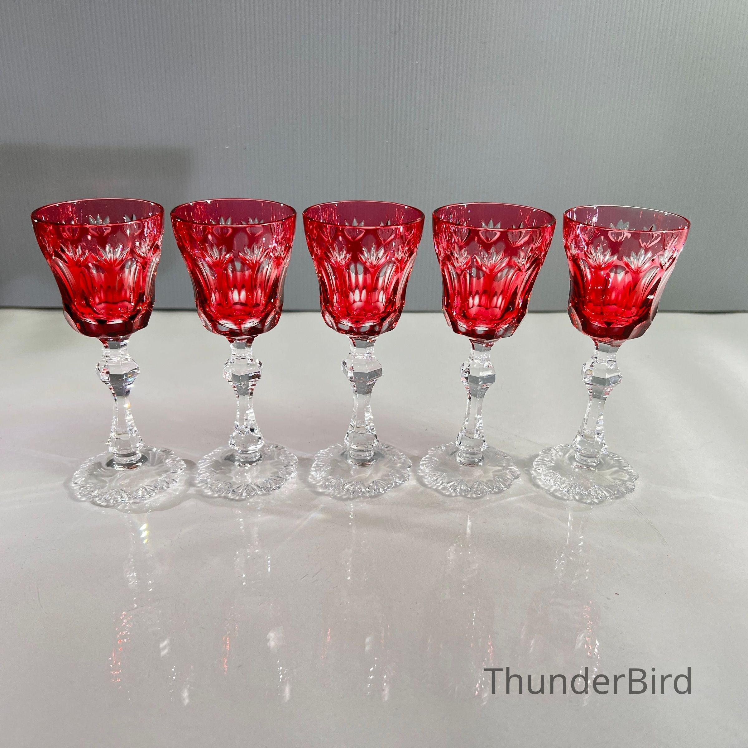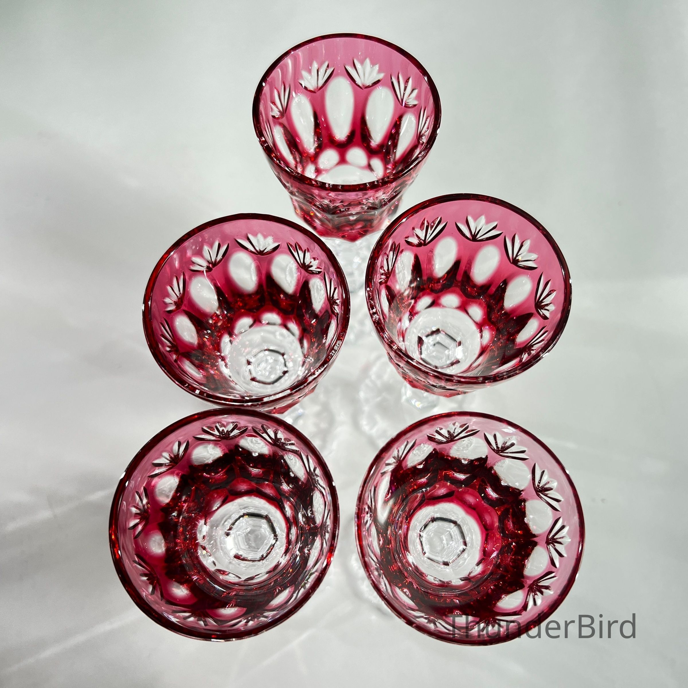 A beautiful set of five vintage cut to clear crystal glasses in a rich cranberry overlay. Each glass features deeply hand-cut panels, floral starbursts and faceted stems, demonstrating the quality typical of mid twentieth century European crystal production. The contrast between the clear base and the ruby overlay highlights the craftsmanship and creates excellent light refraction.