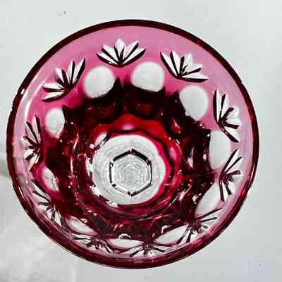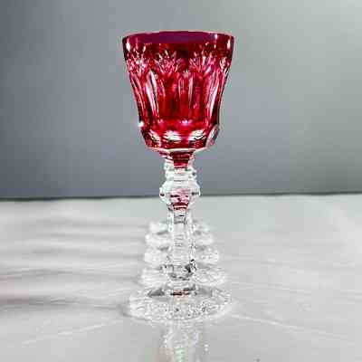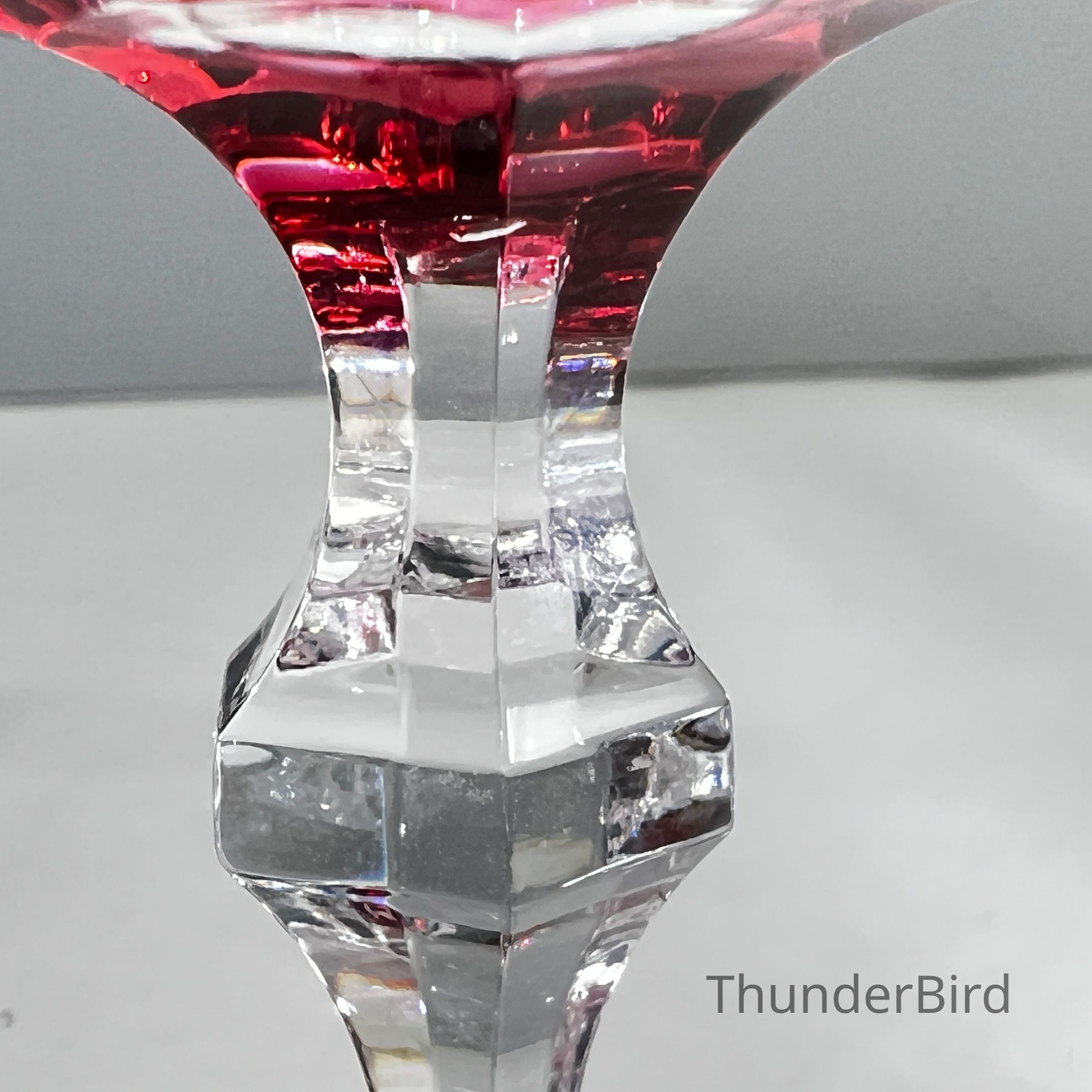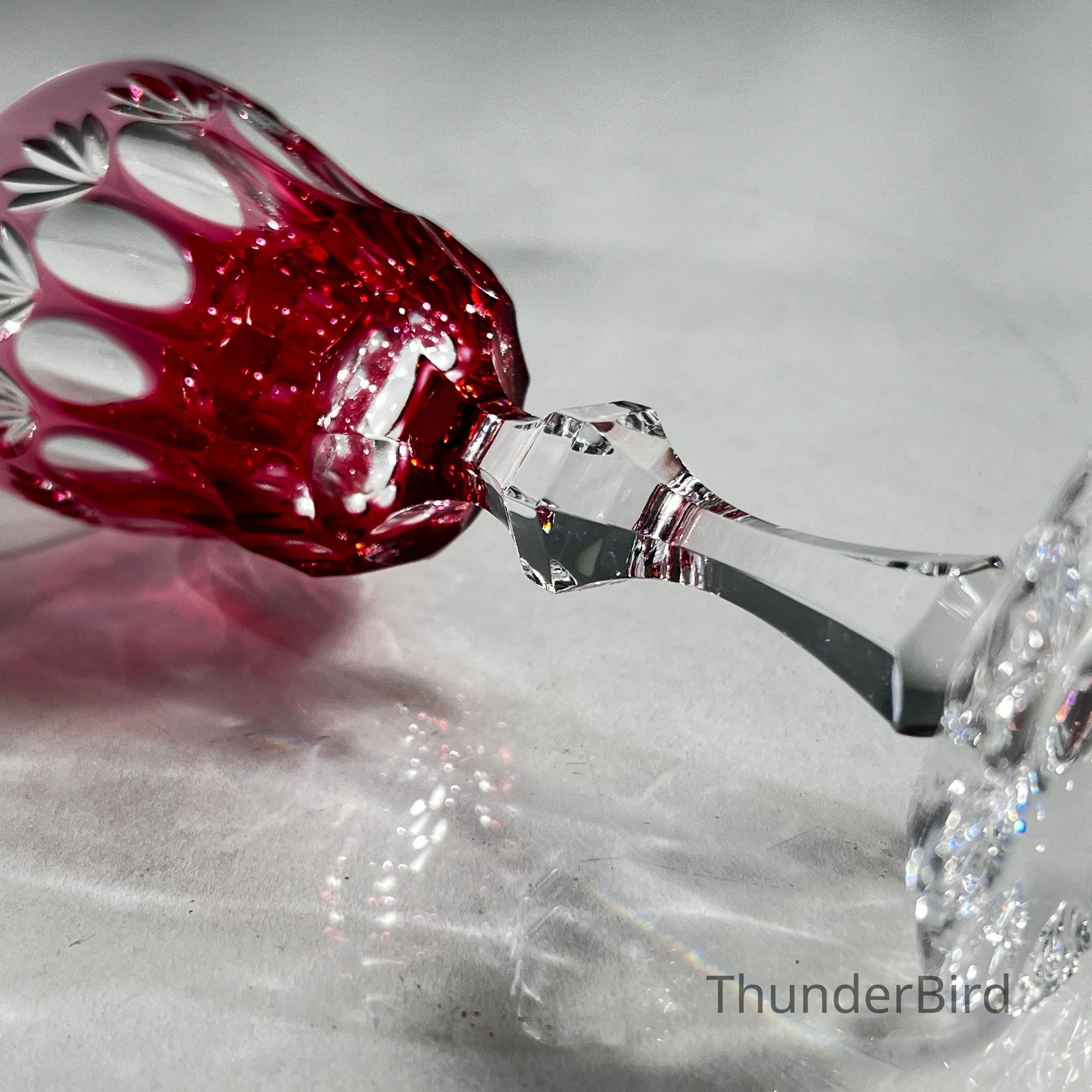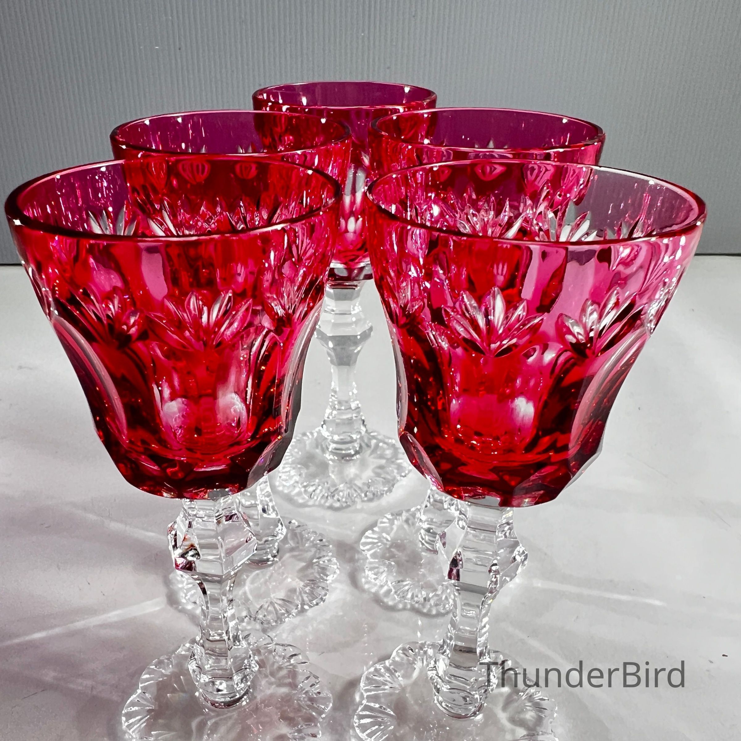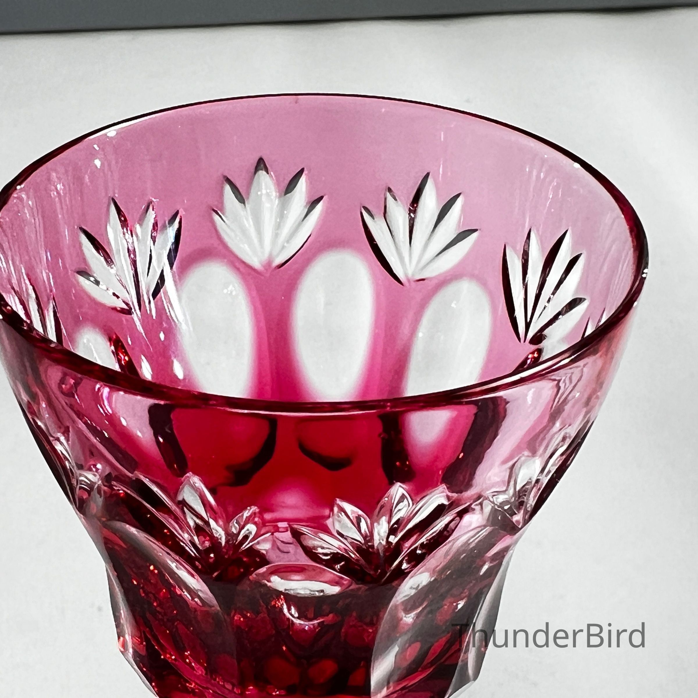 A beautiful set of five vintage cut to clear crystal glasses in a rich cranberry overlay. Each glass features deeply hand-cut panels, floral starbursts and faceted stems, demonstrating the quality typical of mid twentieth century European crystal production. The contrast between the clear base and the ruby overlay highlights the craftsmanship and creates excellent light refraction.