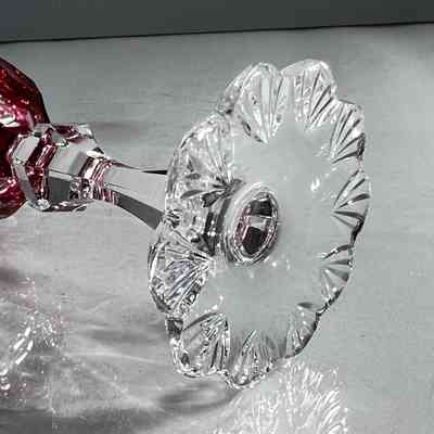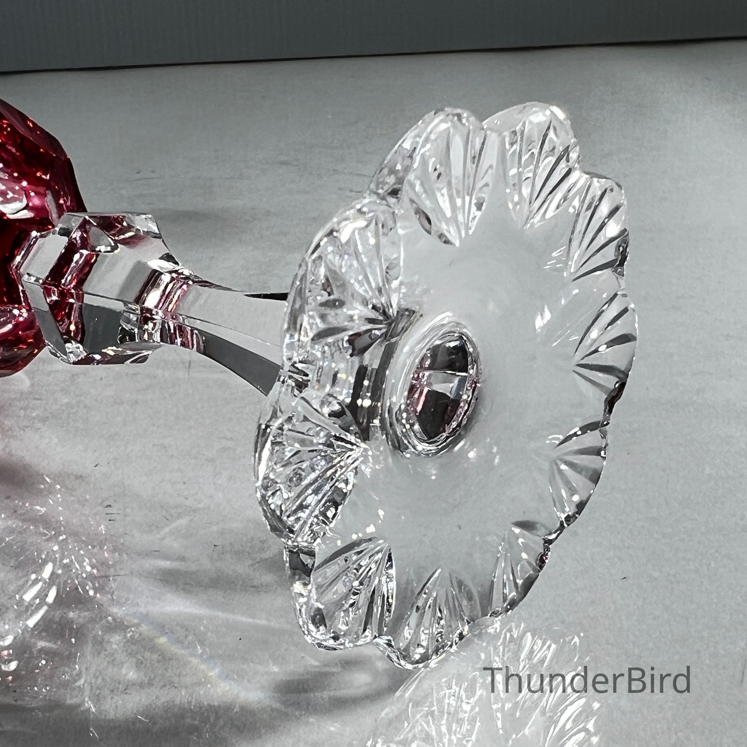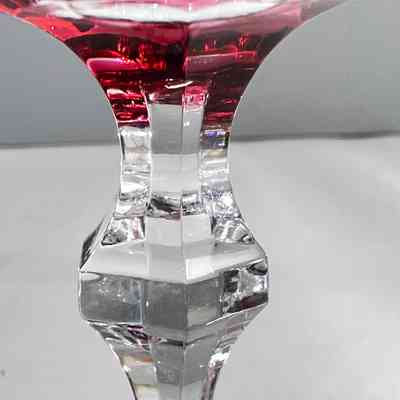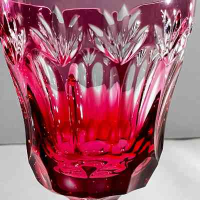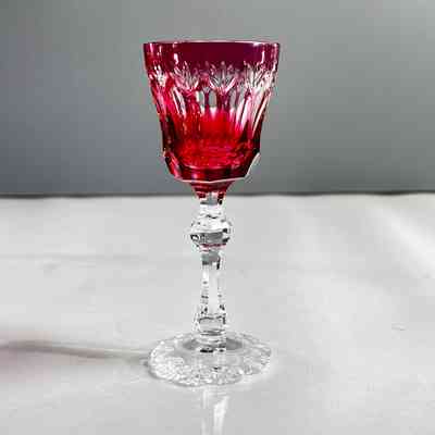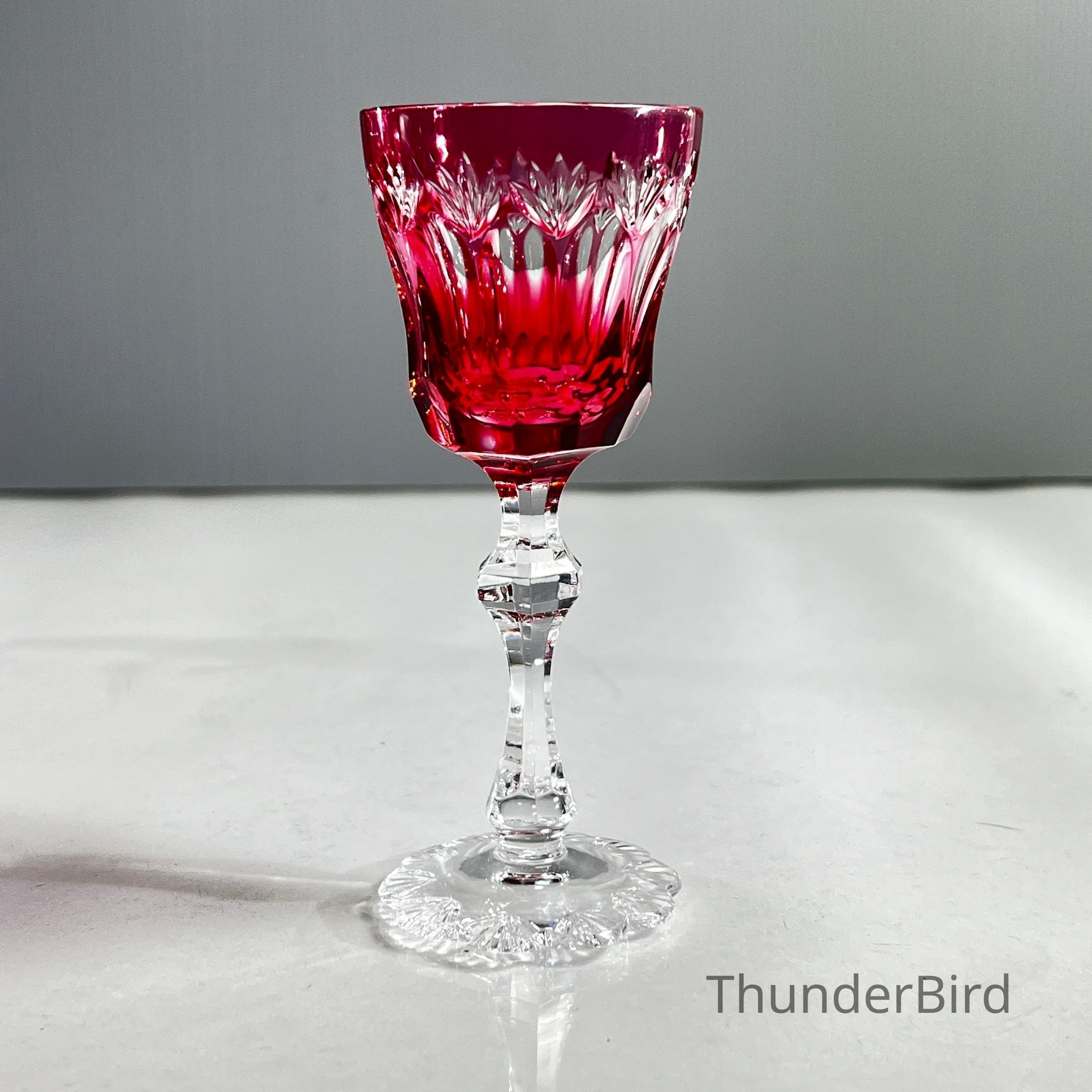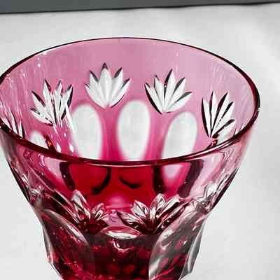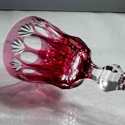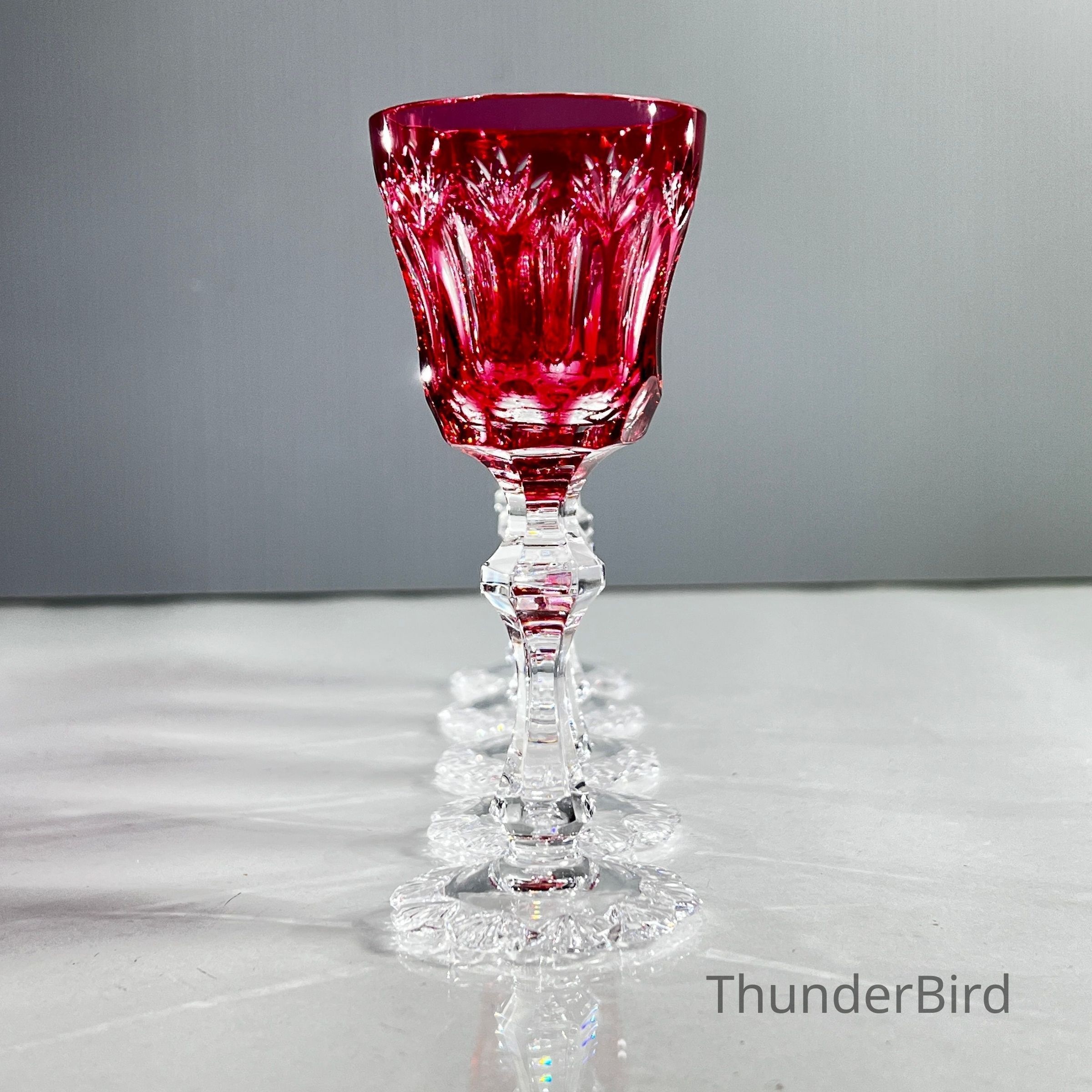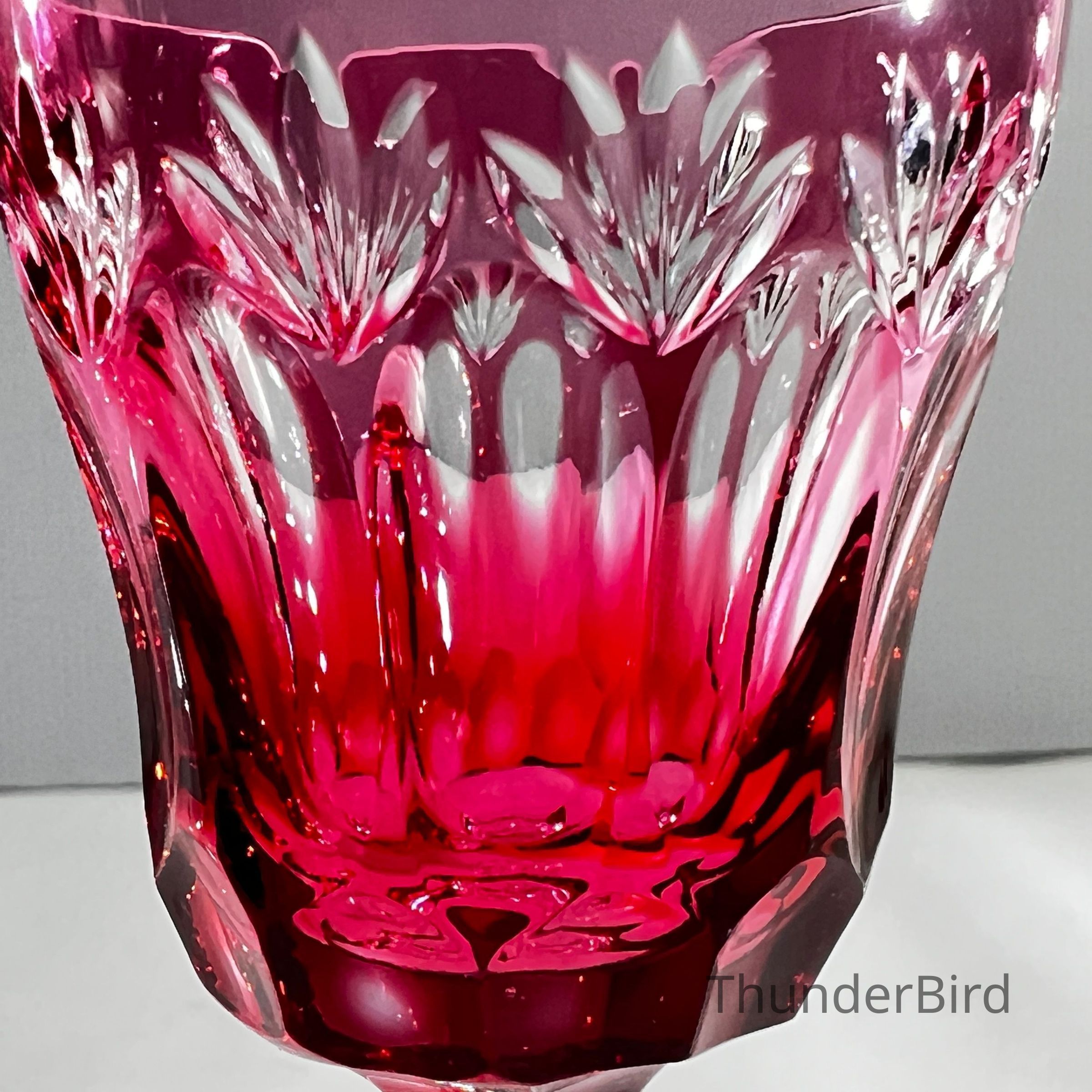 A beautiful set of five vintage cut to clear crystal glasses in a rich cranberry overlay. Each glass features deeply hand-cut panels, floral starbursts and faceted stems, demonstrating the quality typical of mid twentieth century European crystal production. The contrast between the clear base and the ruby overlay highlights the craftsmanship and creates excellent light refraction.